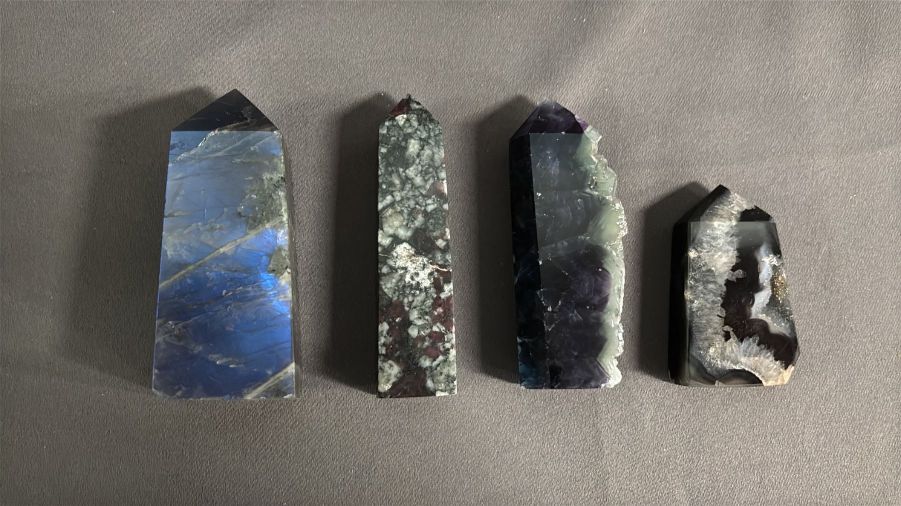 LABRADORITE, DRUZY AGATE, FLUORITE & EUDALYTE TOWERS: LARGEST IS APPROX. 3.5" TALL