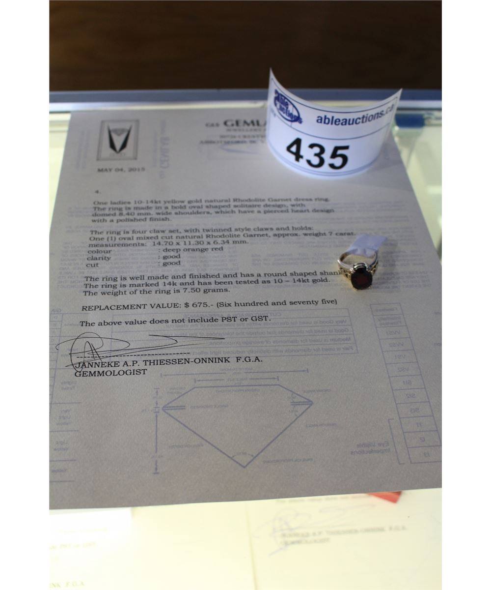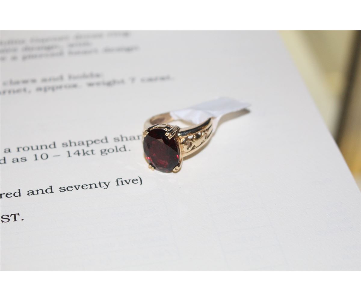 LADIES 10-14KT YELLOW GOLD NATURAL RHODOLITE GARNET DRESS RING WITH ONE RHODOLITE GARNET APPROX 7CARAT REPLACEMENT VALUE $675