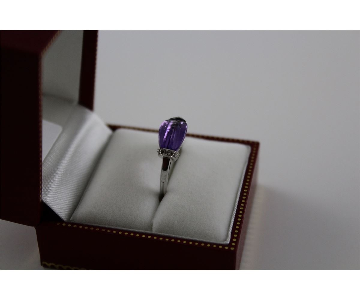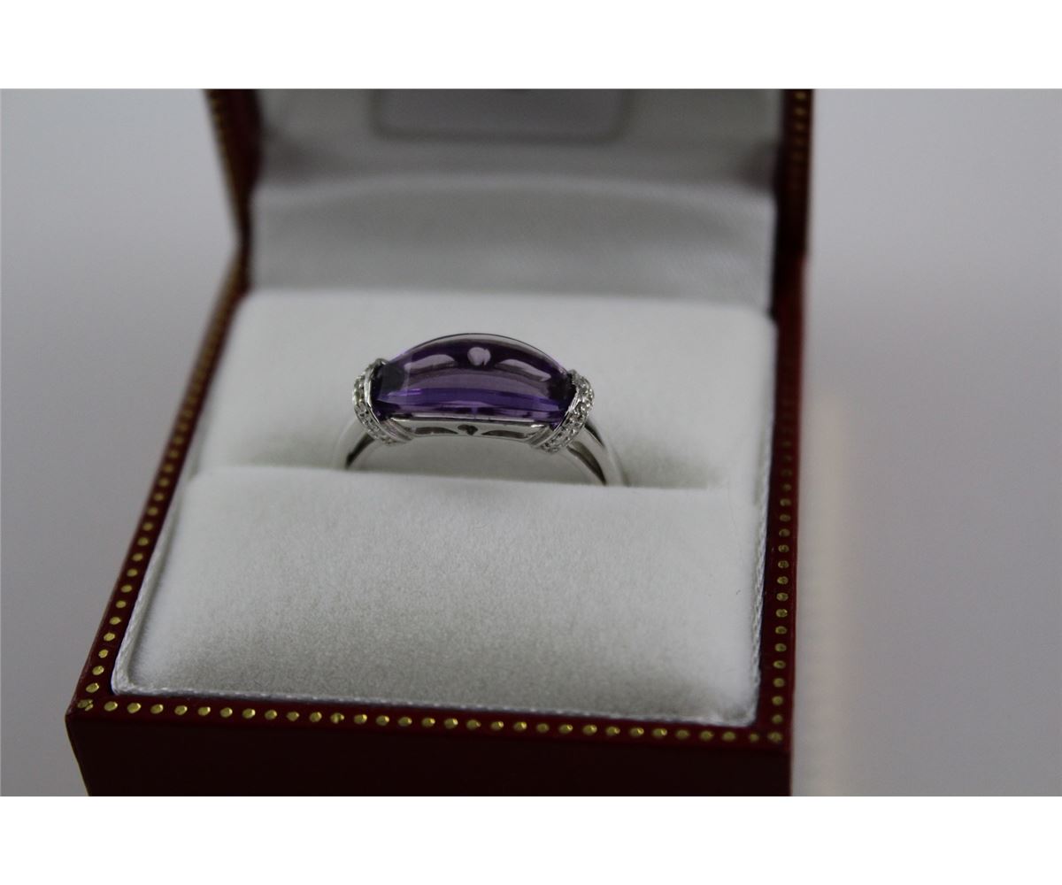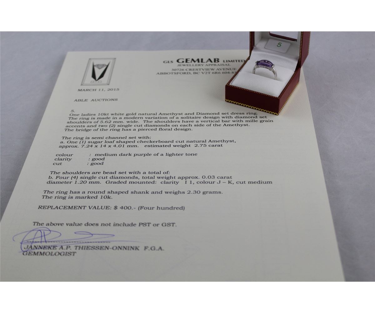 LADIES 10KT WHITE GOLD NATURAL AMETHYST & DIAMOND SET DRESS RING SEMI CHANNEL SET WITH 1 SUGAR LOAF SHAPED CHECKERBOARD CUT NATURAL AMETHYST. CHANNEL SET AMETHYST IS APPROX. 2.75 CARATS. SHOULDERS BEAD SET WITH 4 SINGLE CUT DIAMONDS APPROX. 0.03 CARATS. REPLACEMENT VALUE: $400.00