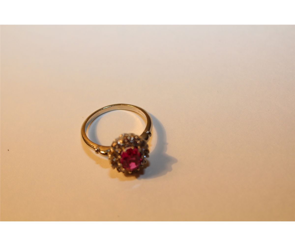LADIES 10KT WHITE GOLD SYNTHETIC RUBY & COLOURLESS SYNTHETIC SAPPHIRE DRESS RING. SET WITH 10 ROUND MIXED CUT COLOURLESS SYNTHETIC SAPPHIRES AND 1 OVAL MIXED CUT SYNTHETIC RUBY. REPLACMENT VALUE: 325