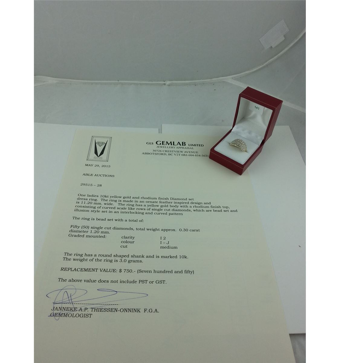 LADIES 10KT YELLOW GOLD AND RHODIUM FINISH DIAMOND SET DRESS RING WITH 50 DIAMONDS, APPROX 0.50CARAT REPLACEMENT VALUE $750