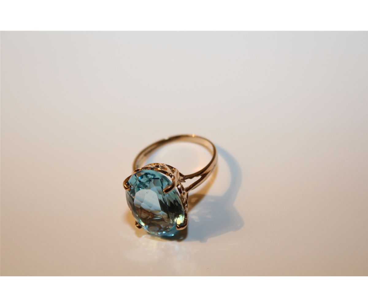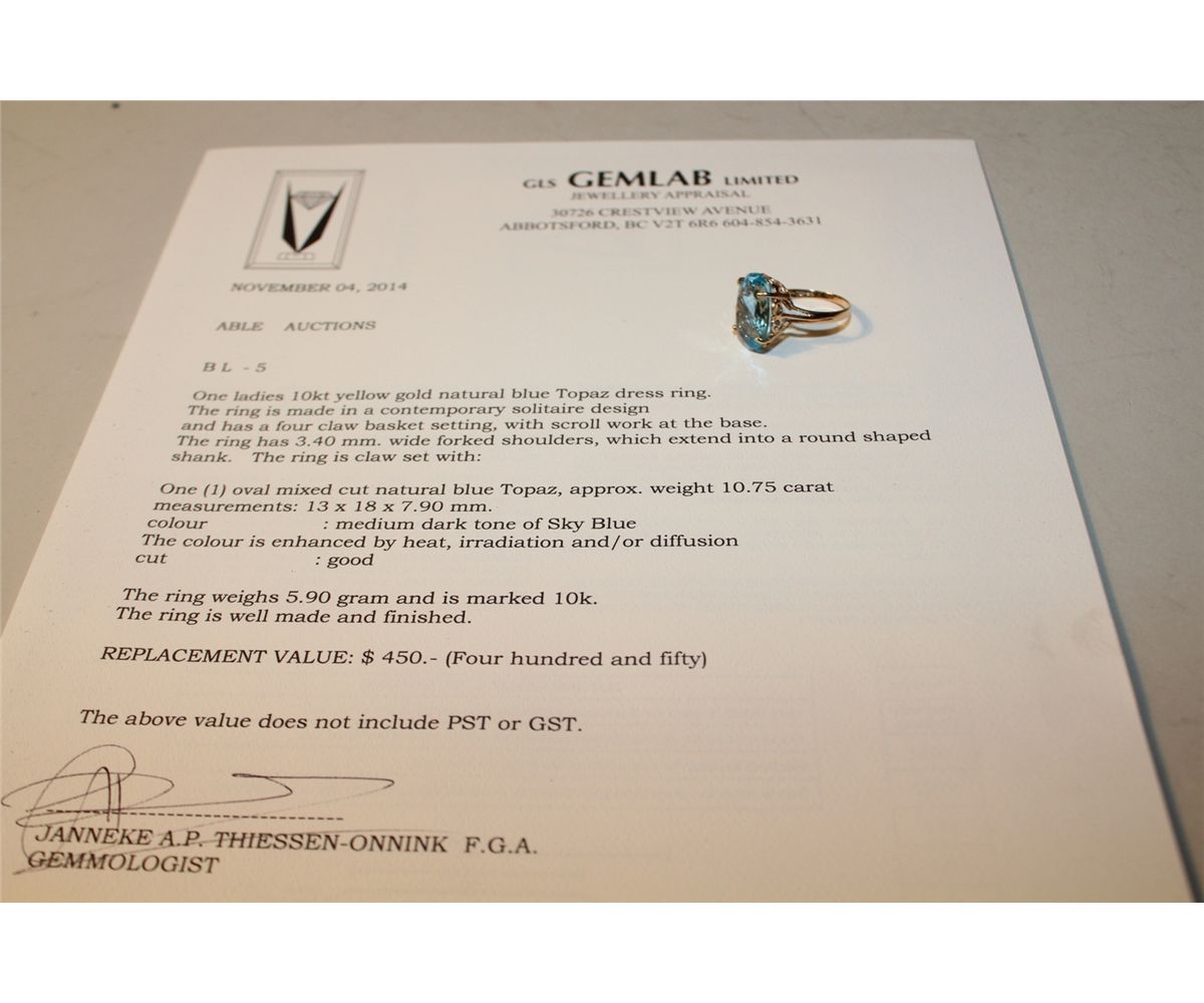 LADIES 10KT YELLOW GOLD NATURAL BLUE TOPAZ RING CLAW SET WITH 1 OVAL MIXED CUT NATURAL BLUE TOPAZ APPROX. 10.75. REPLACEMENT VALUE: 450