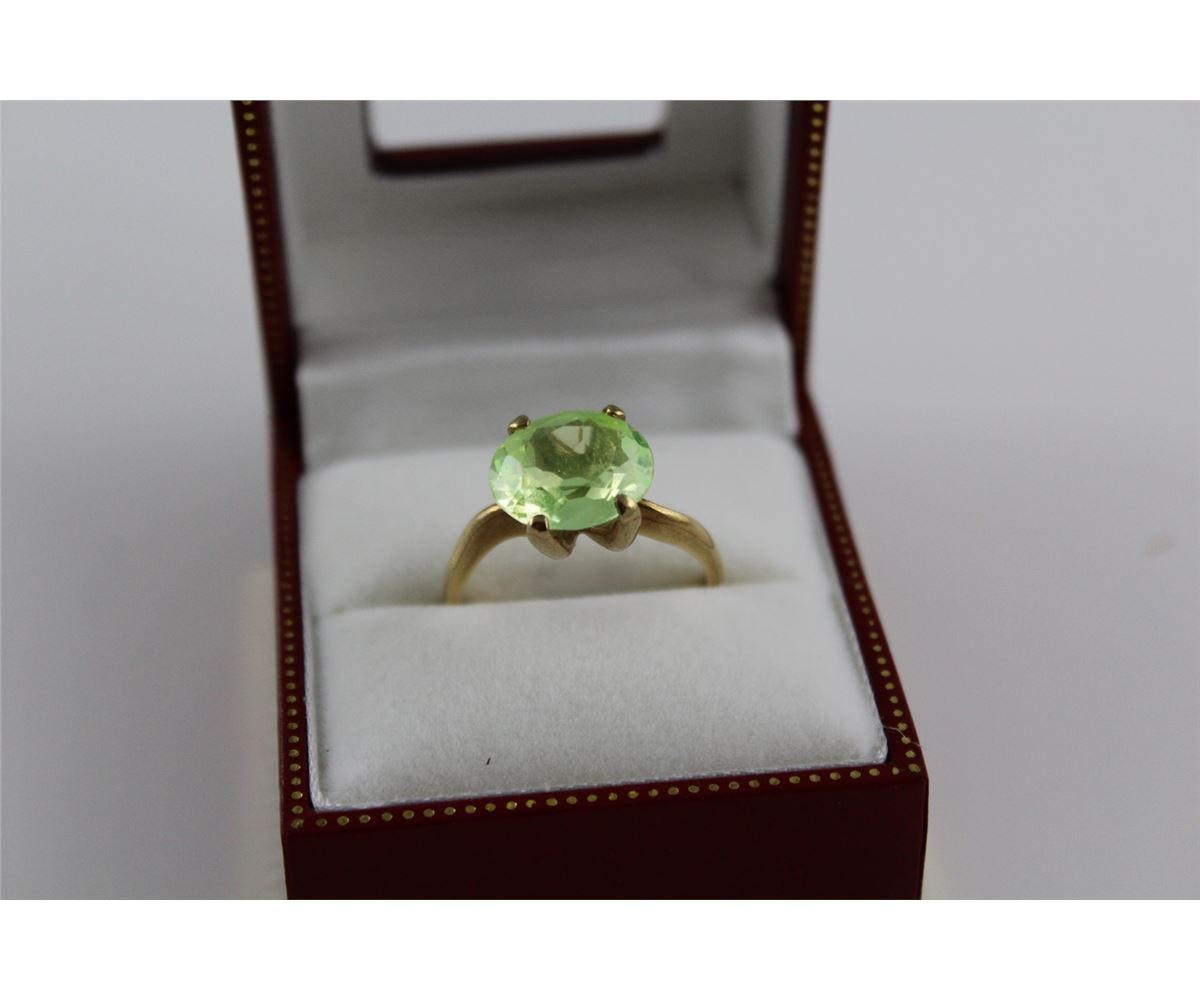 LADIES 10KT YELLOW GOLD SYNTHETIC GREEN SPINEL DRESS RING CLAW SET WITH 1 OVAL MIXED CUT GREEN SYNTHETIC SPINEL. REPLACEMENT VALUE:$285.00