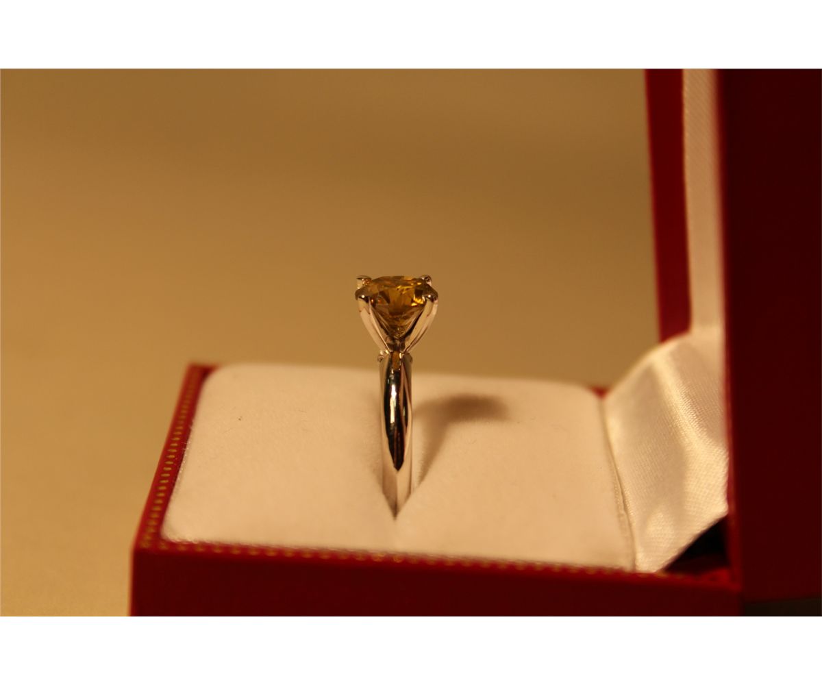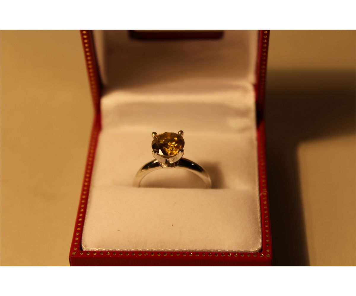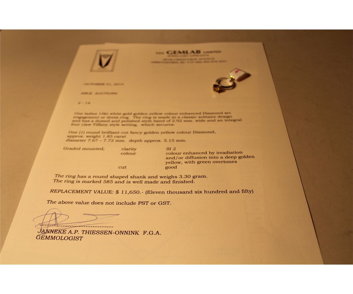 LADIES 14 K WHITE GOLD GOLDEN YELLOW COLOUR ENHANCED DIAMOND SET ENGAGEMENT/DRESS RING SET WITH 1 ROUND BRILLIANT CUT FANCY GOLDEN YELLOW COLOUR DIAMOND APPROX. 1.85 CARATS. REPLACEMENT VALUE: $11650.00