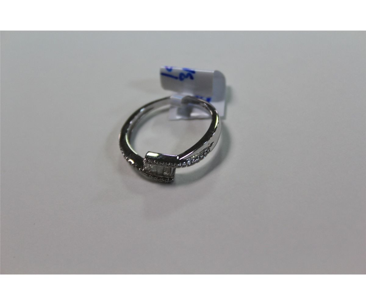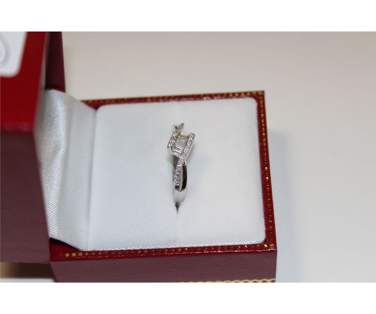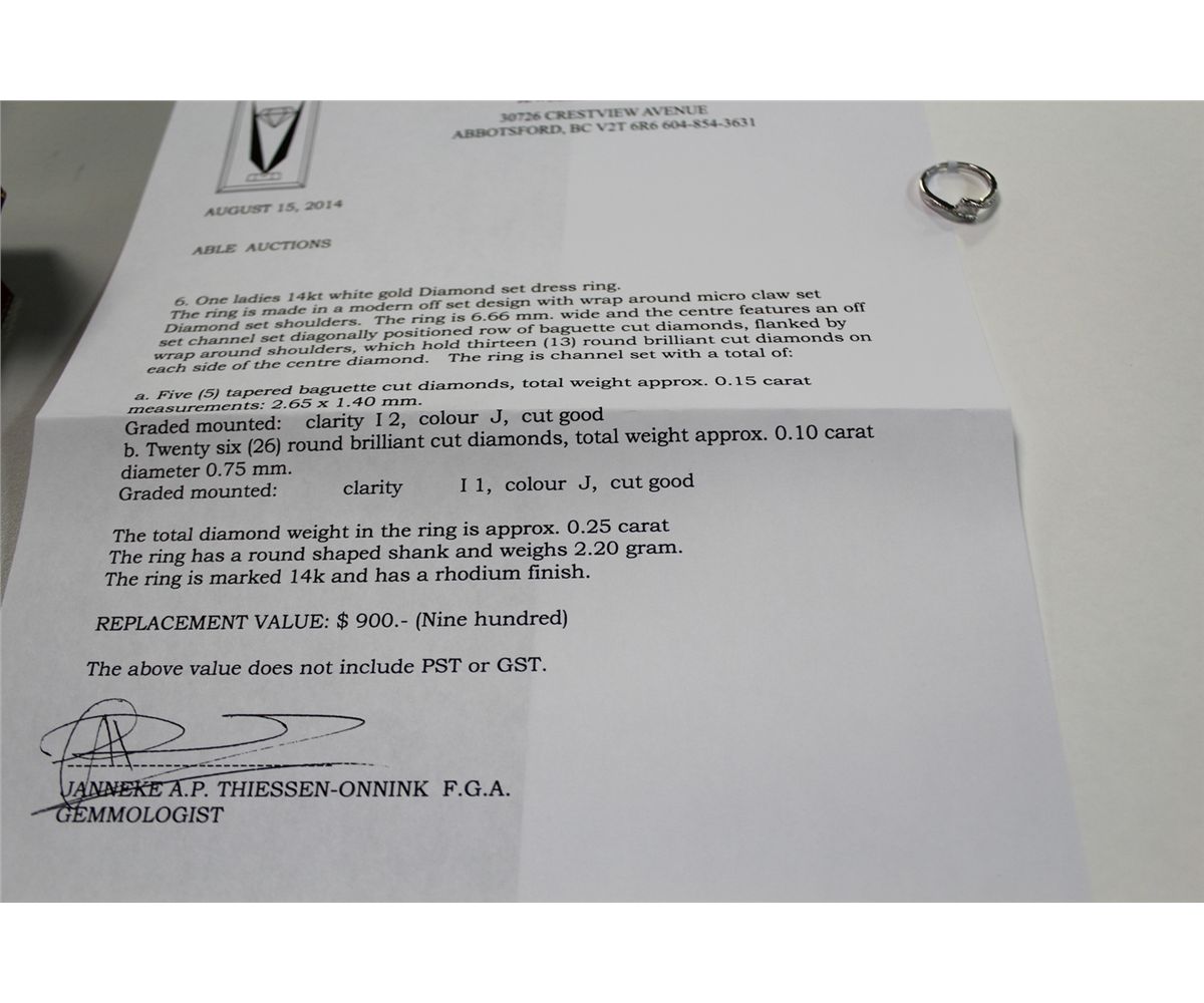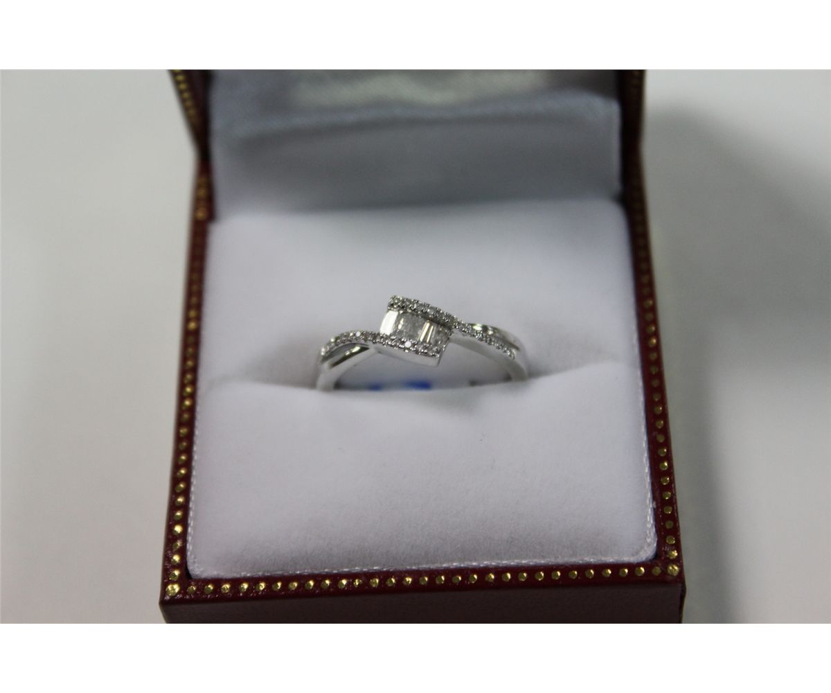 LADIES 14 KT. WHITE GOLD DIAMOND SET DRESS RING. 5 BAGUETTE CUT DIAMONDS TOTAL WEIGHT APPROX. 0.15 CARATS AND 26 ROUND BRILLIANT CUT DIAMONDS WEIGHT APPROX. 0.10 CARATS, TOTAL DIAMOND WEIGHT IS APPROX. 0.25 CARATS. REPLACEMENT VALUE: $900.00