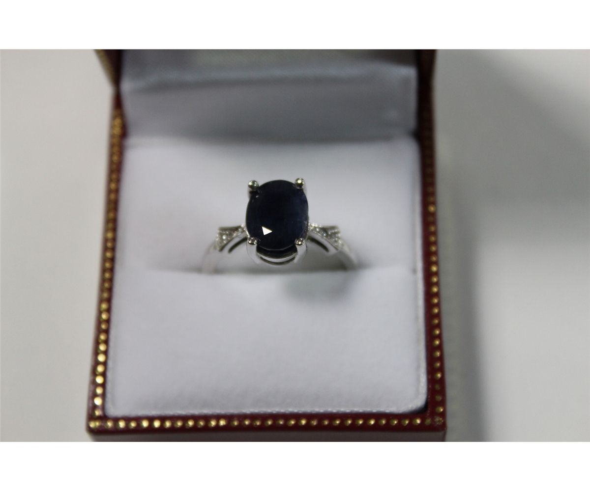 LADIES 14 KT. WHITE GOLD NATURAL BLACK-BLUE SAPPHIRE & DIAMOND DRESS RING. BEAD SET WITH 3 SINGLE & 1 ROUND CUT DIAMOND APPROX. 0.03 CARATS AND 1 OVAL MIXED CUT NATURAL BLACK-BLUE SAPPHIRE APPROX 3.25 CARATS. REPLACEMENT $750.00