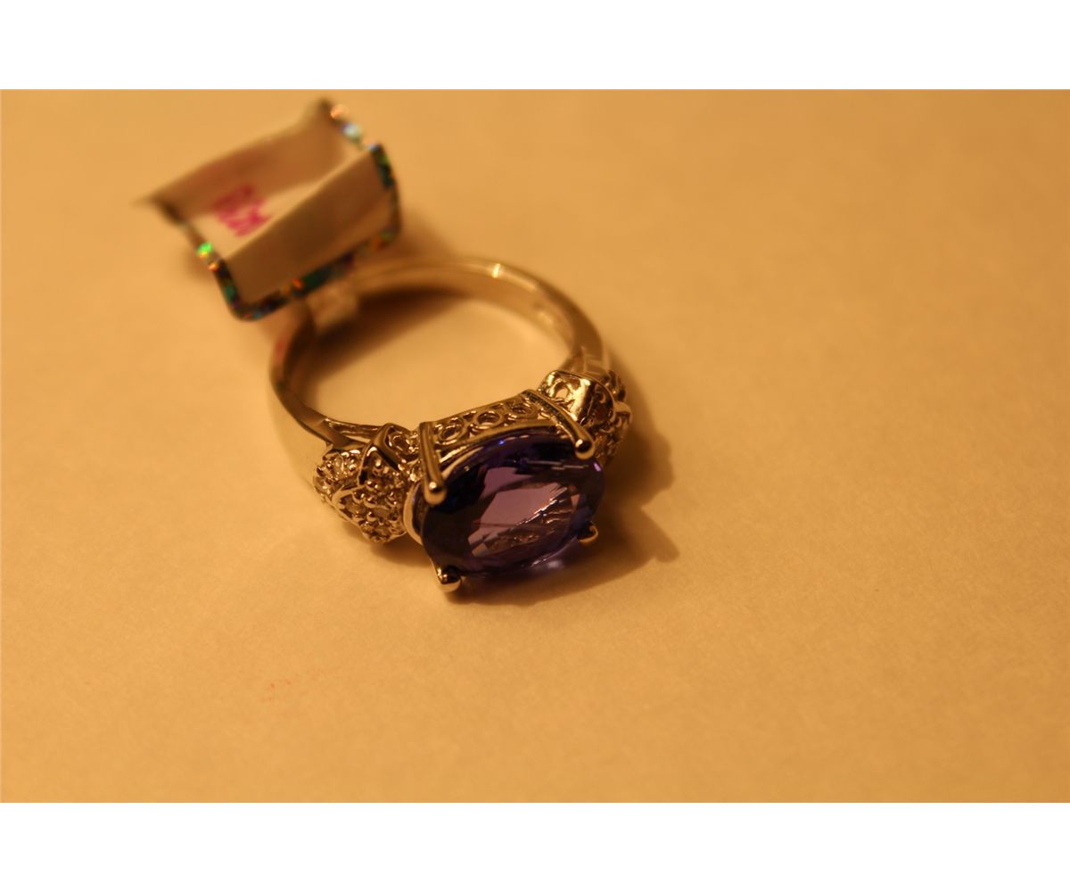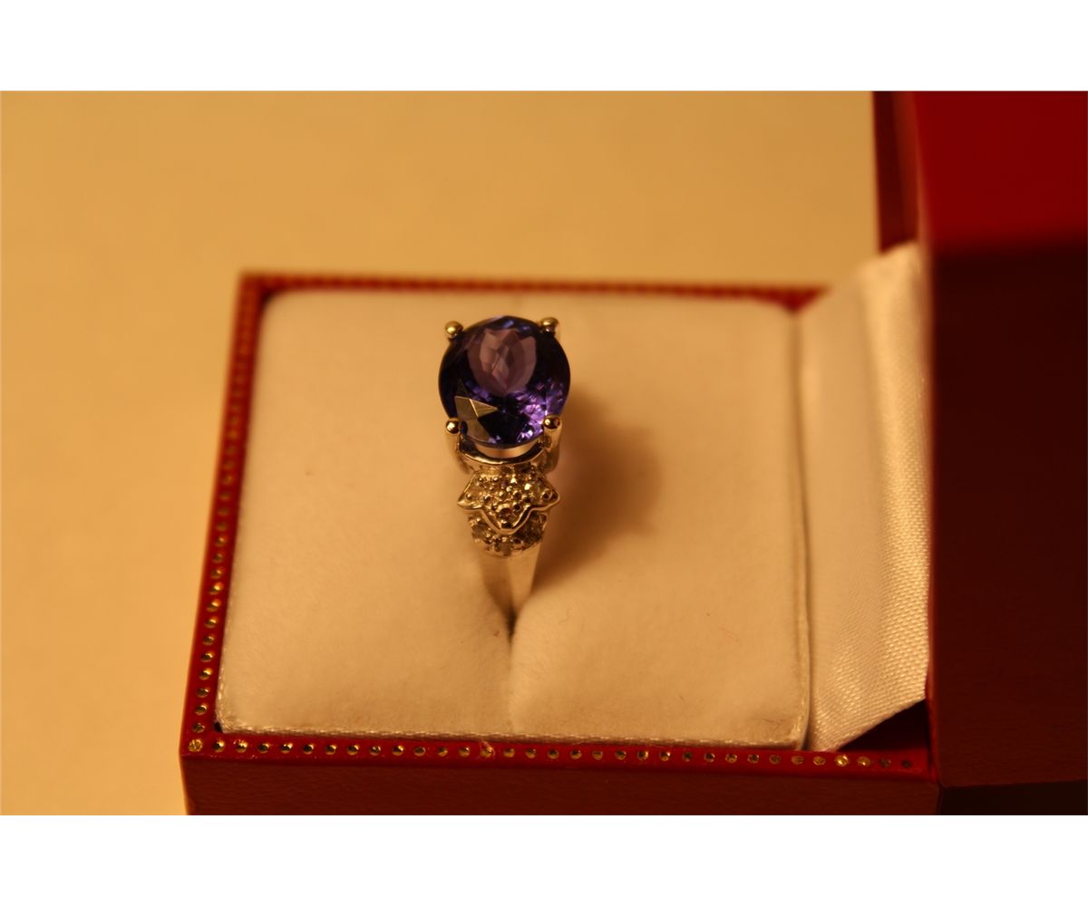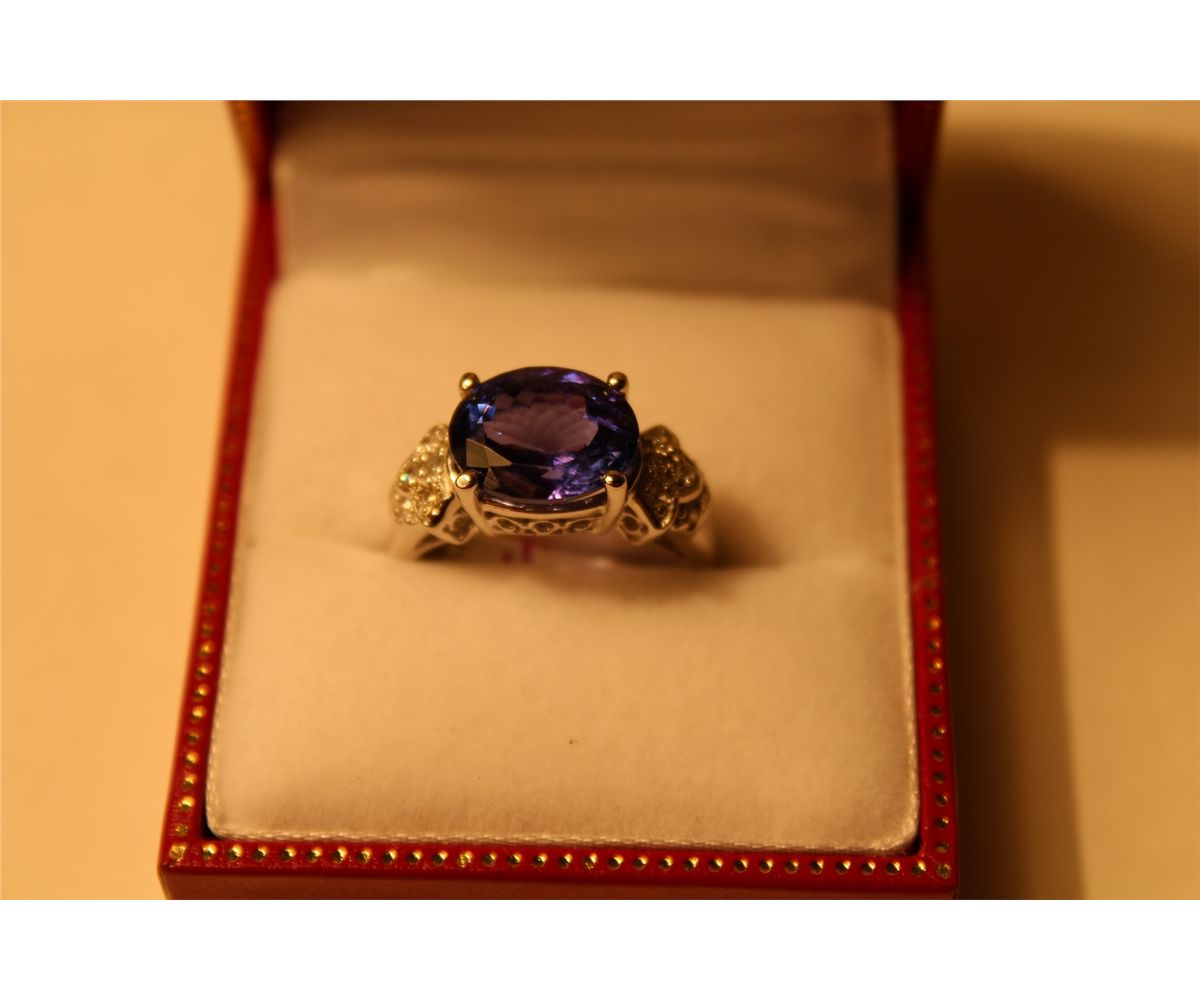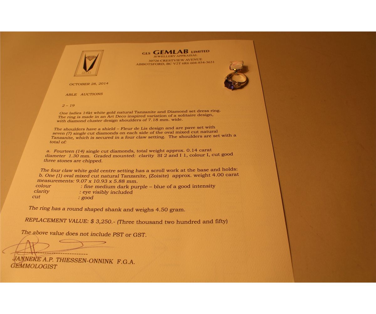 LADIES 14 KT. WHITE GOLD NATURAL TANZANITE AND DIAMOND DRESS SET DRESS RING SET WITH 14 SINGLE CUT DIAMONDS APPROX.0.14 CARATS AND 1 OVAL MIXED CUT NATURAL TANZANITE APPROX.4.00 CARATS. REPLACEMENT VALUE: $3250.00