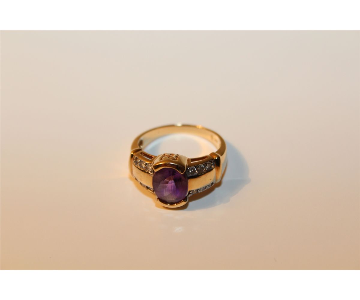 LADIES 14 KT. YELLOW GOLD NATURAL AMETHYST & DIAMOND SET DRESS RING SET WITH 12 ROUND BRILLIANT CUT DIAMONDS APPROX. 0.22 CARATS AND 1 OVAL SHAPED CHECKERBOARD CUT NATURAL AMETHYST APPROX. 2.50 CARATS, REPLACEMENT VALUE: $1300.00