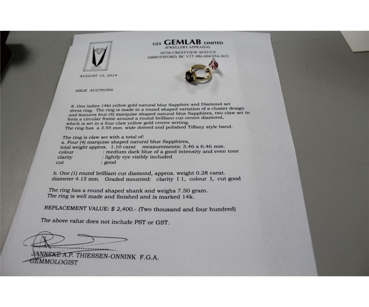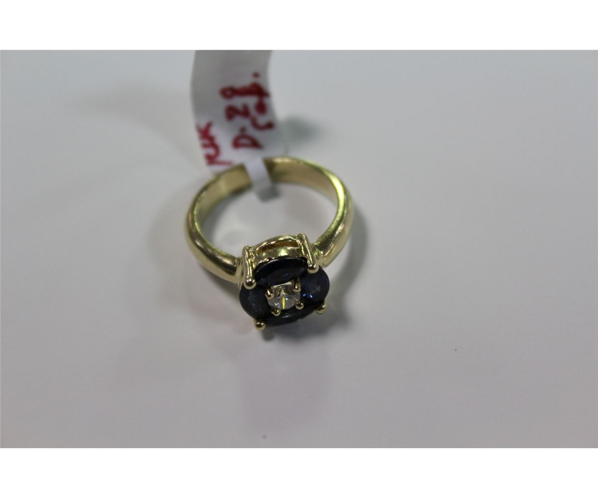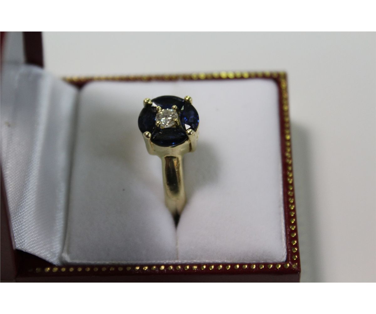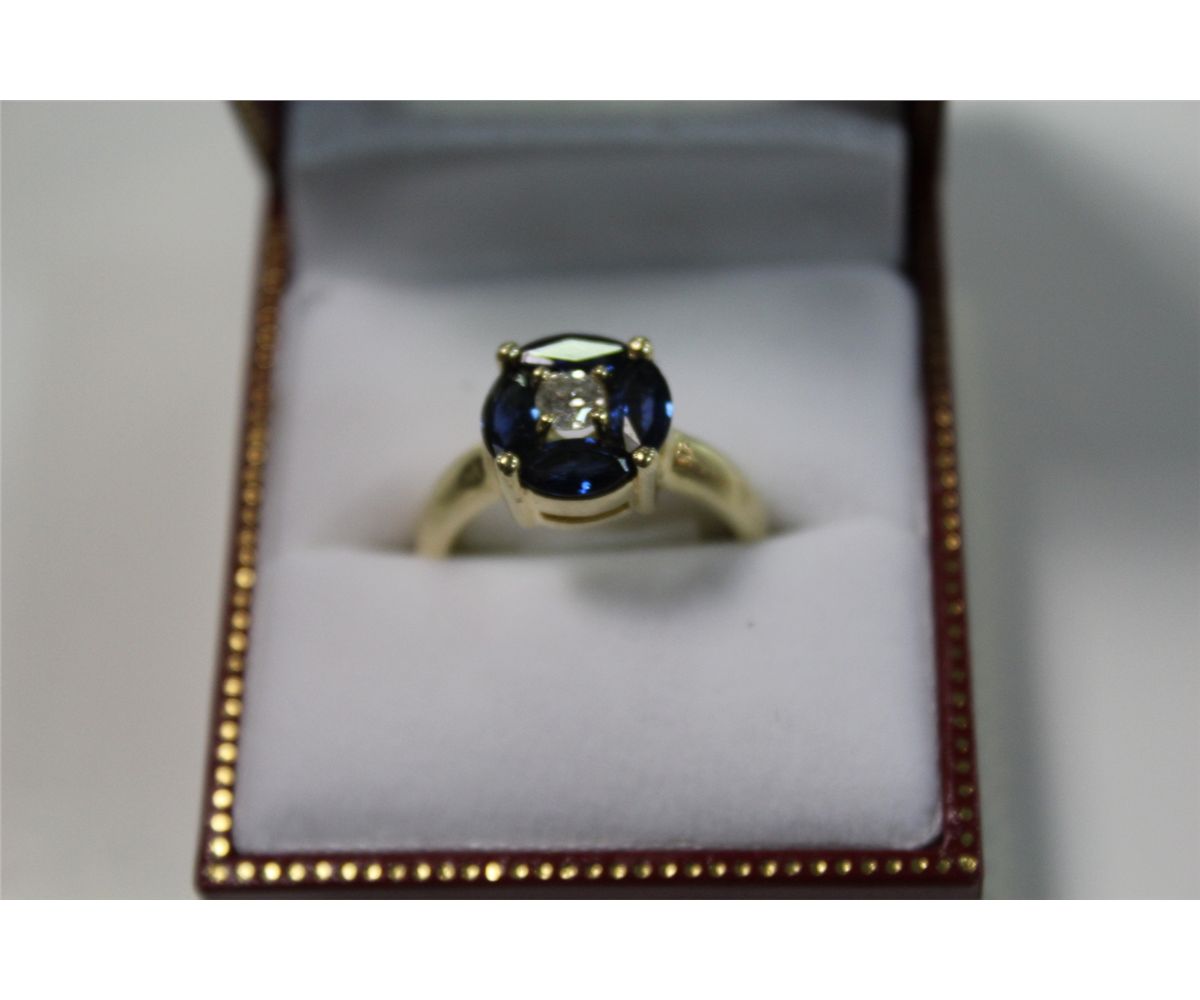 LADIES 14 KT. YELLOW GOLD NATURAL BLUE SAPPHIRE & DIAMOND DRESS RING. CLAW SET WITH 4 MARQUISE SHAPED NATURAL BLUE SAPPHIRES APPROX. 1.10 CARATS AND 1 ROUND BRILLIANT CUT DIAMOND APPROX. 0.28 CARATS. REPLACEMENT VALUE $2400.00