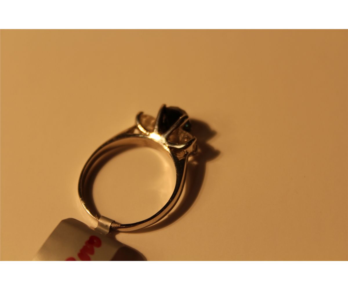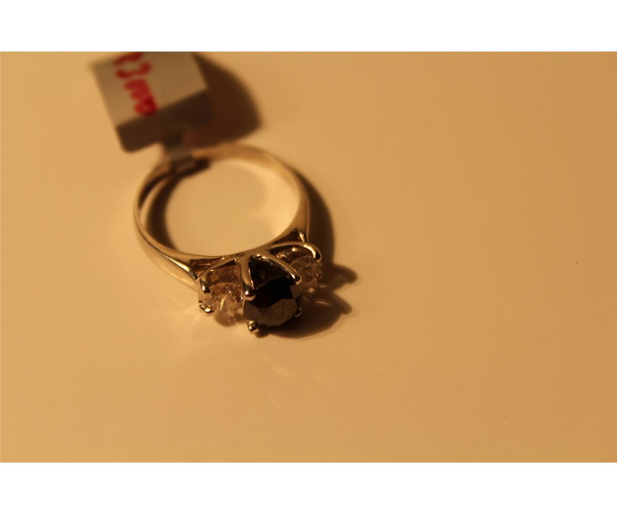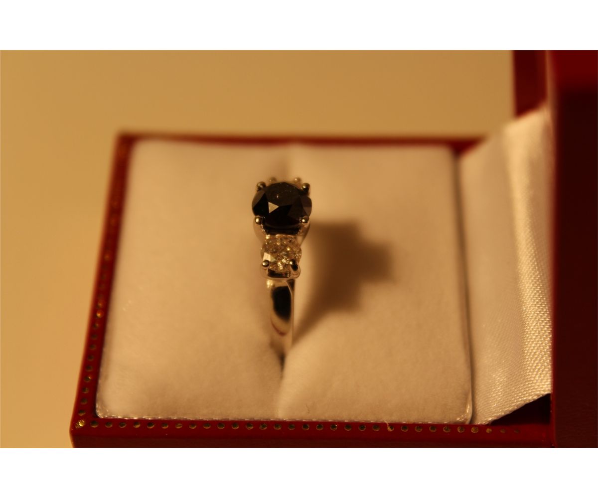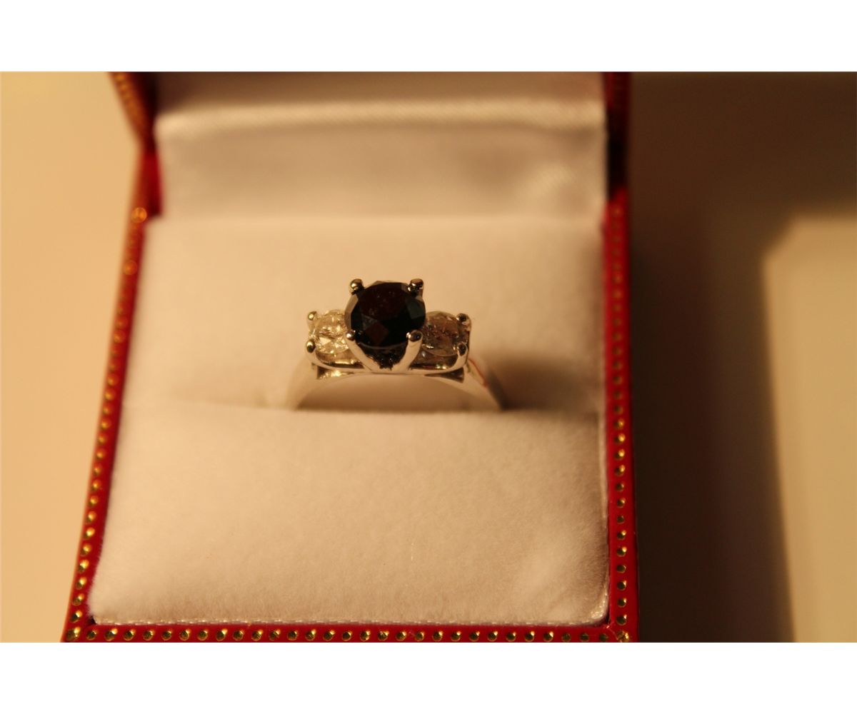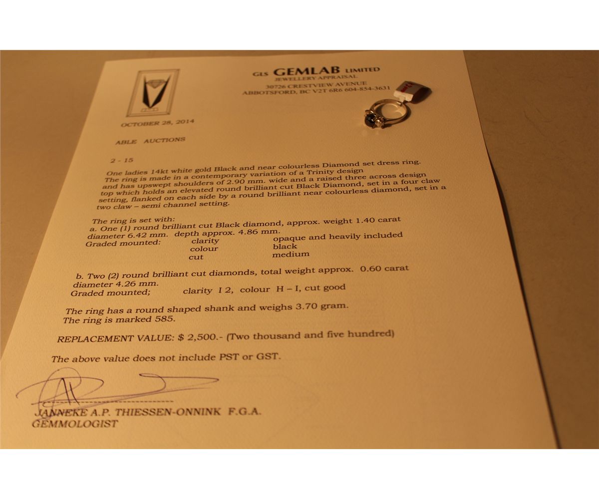 LADIES 14KT WHITE GOLD BLACK AND NEAR COLOURLESS DIAMOND SET DRESS RING SET WITH 1 ROUND BRILLIANT CUT BLACK DIAMOND APPROX. 1.40 CARATS AND 2 ROUND BRILLIANT CUT DIAMONDS APPROX. 0.60 CARATS. REPLACEMENT VALUE: $2500.00