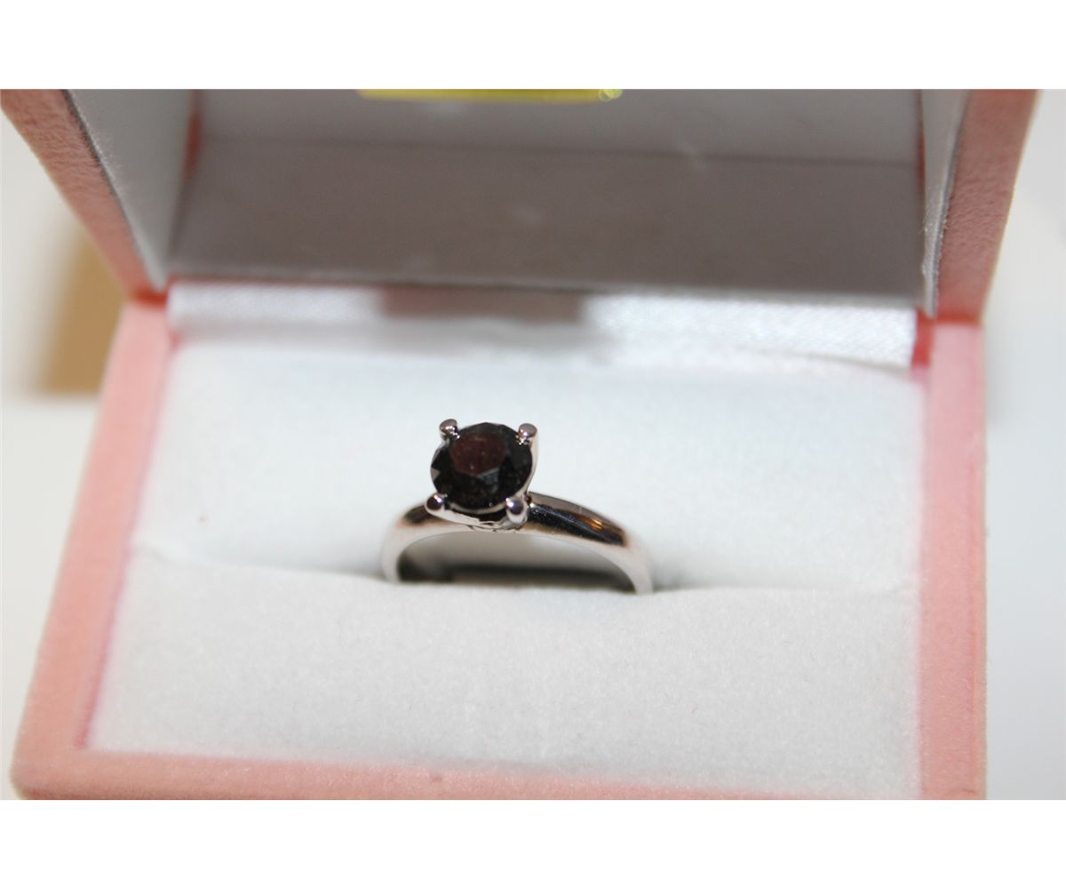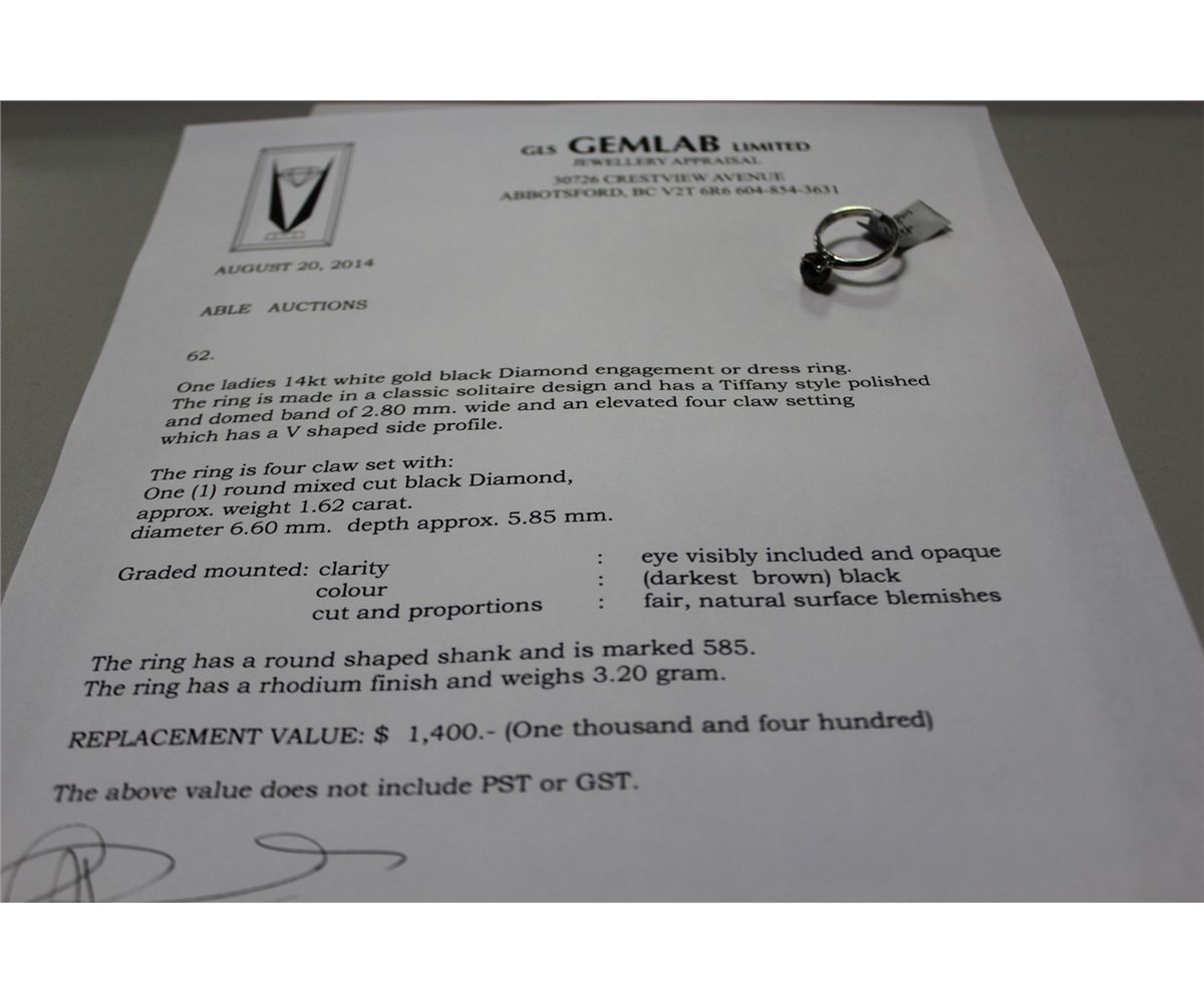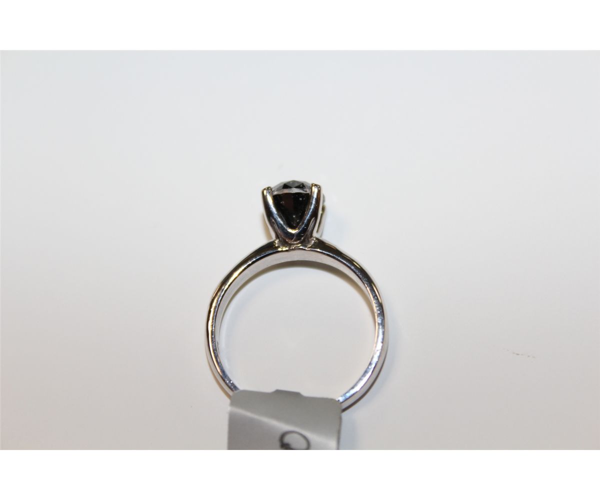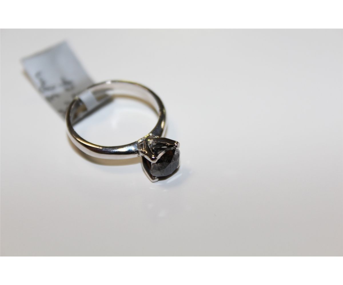 LADIES 14KT. WHITE GOLD BLACK DIAMOND ENGAGEMENT OR DRESS RING 4 CLAW SET WITH 1 ROUND MIXED CUT BLACK DIAMOND APPROX: 1.62 CARATS. REPLACEMENT VALUE: $1400