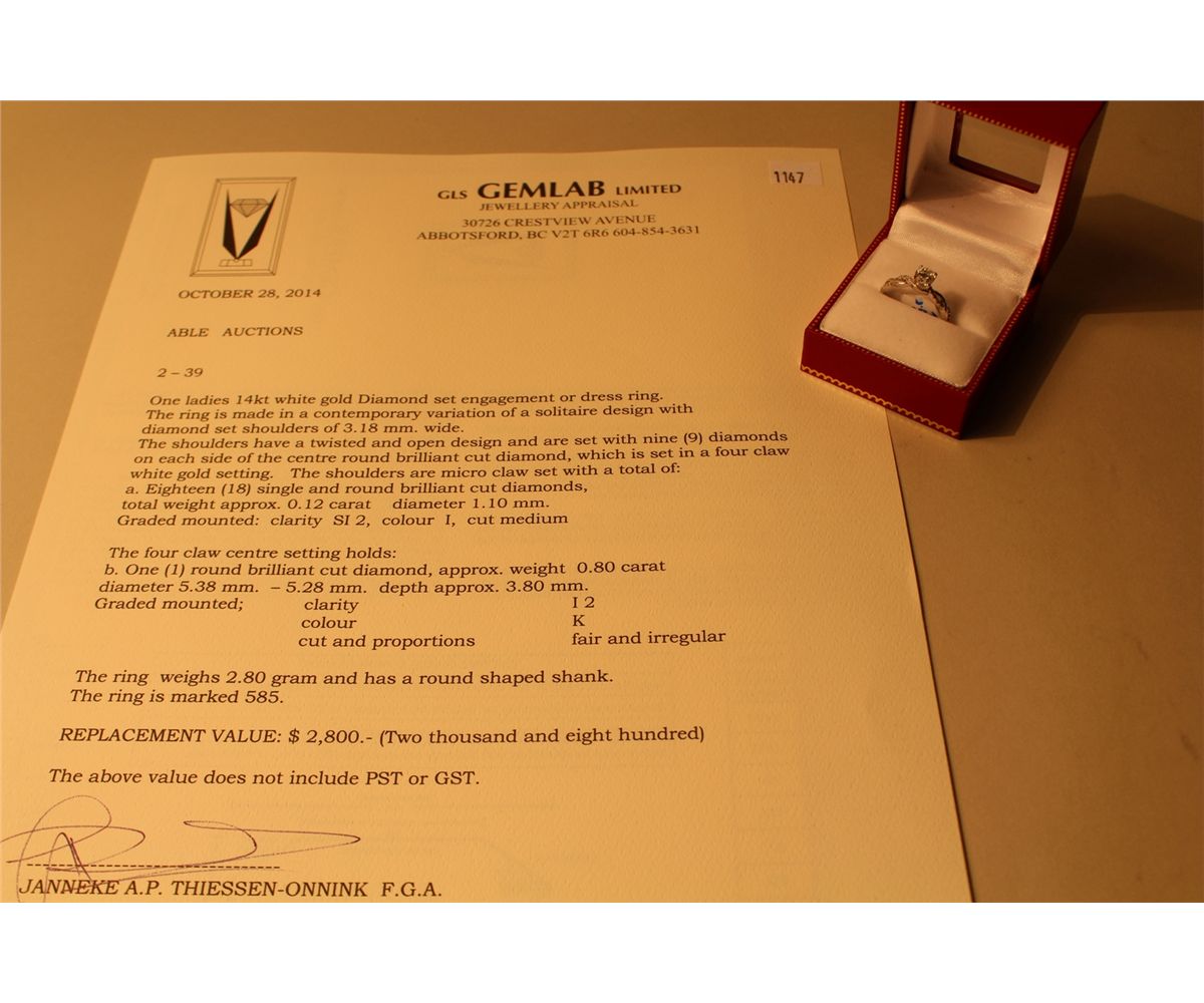 LADIES 14KT WHITE GOLD DIAMOND SET ENGAGEMENT/DRESS RING SET WITH 1 ROUND BRILLIANT CUT DIAMOND APPROX: 0.80 CARATS. REPLACEMENT VALUE: 2800