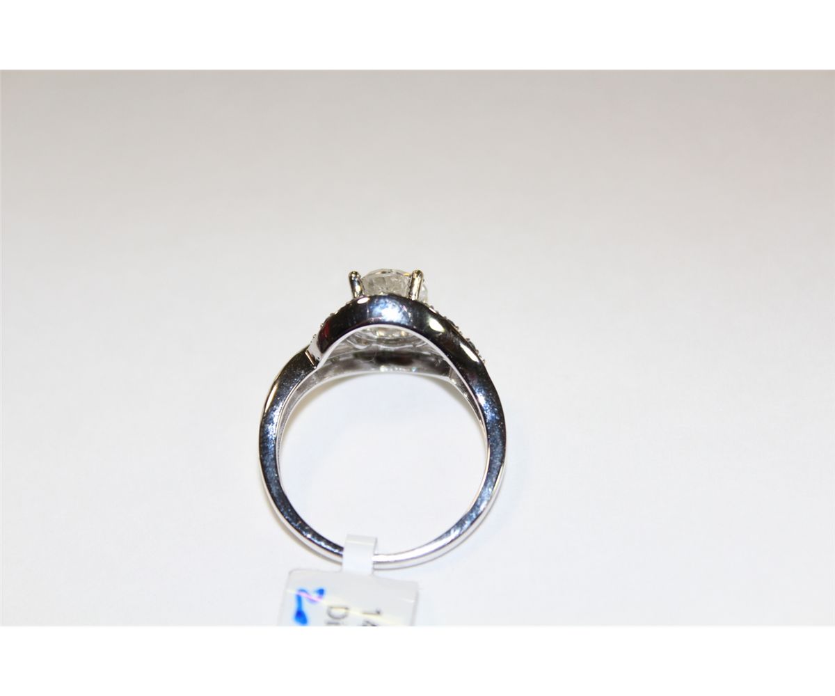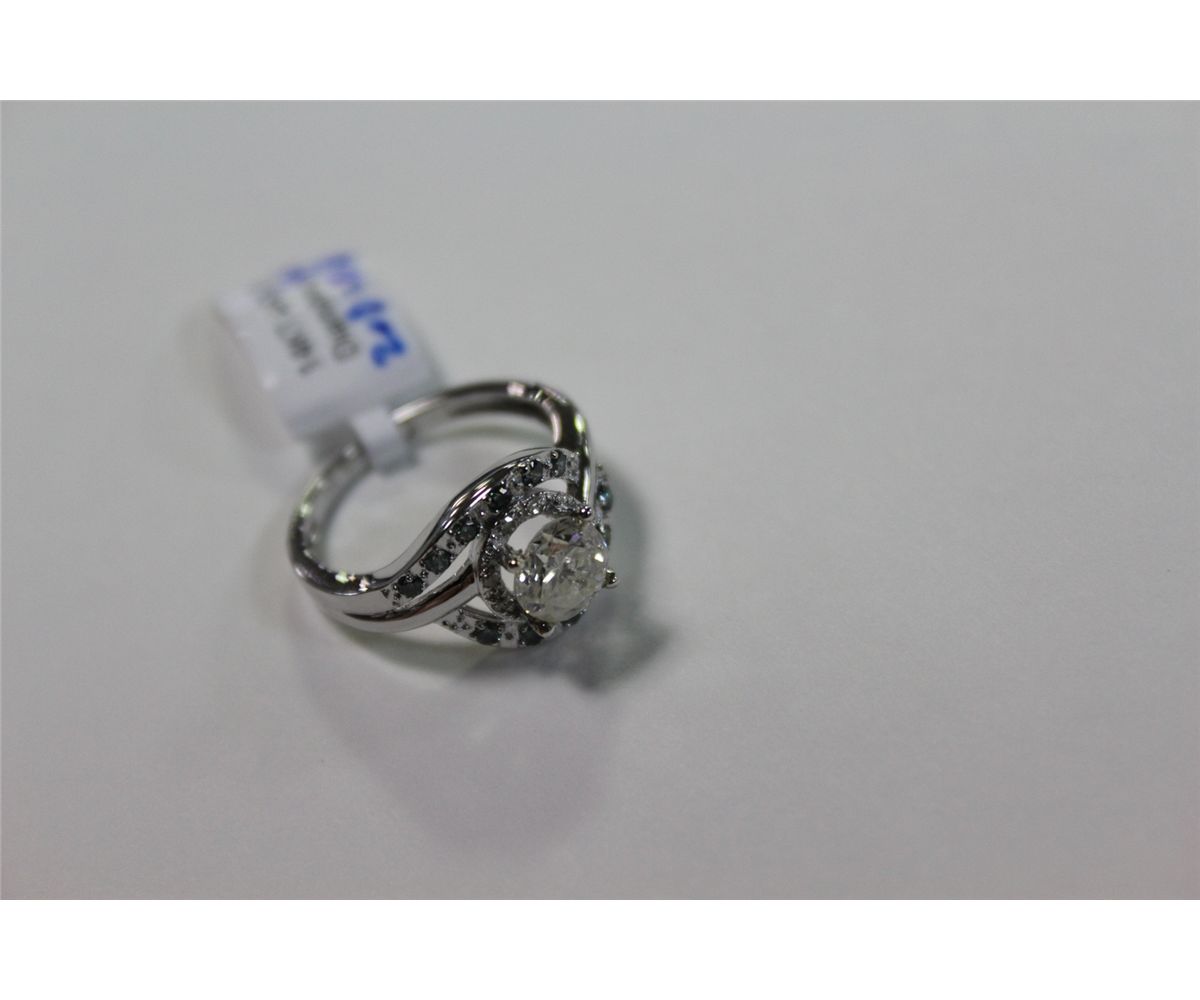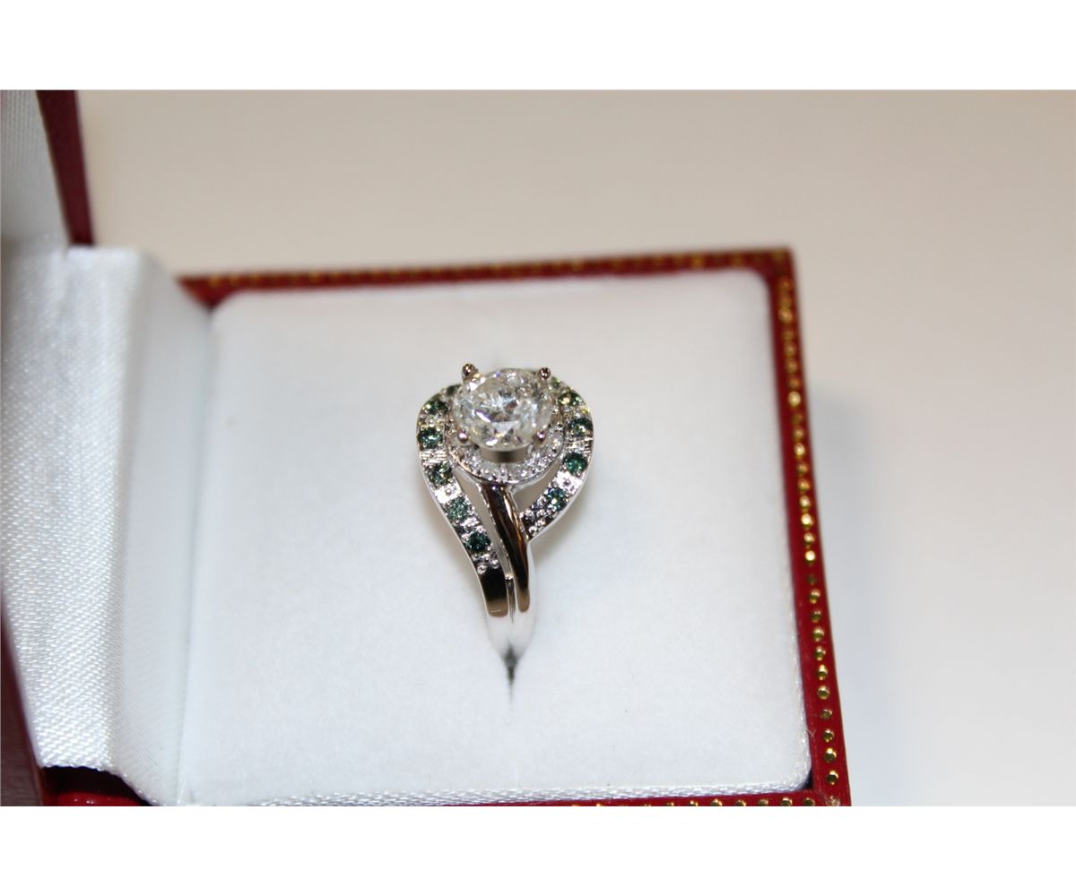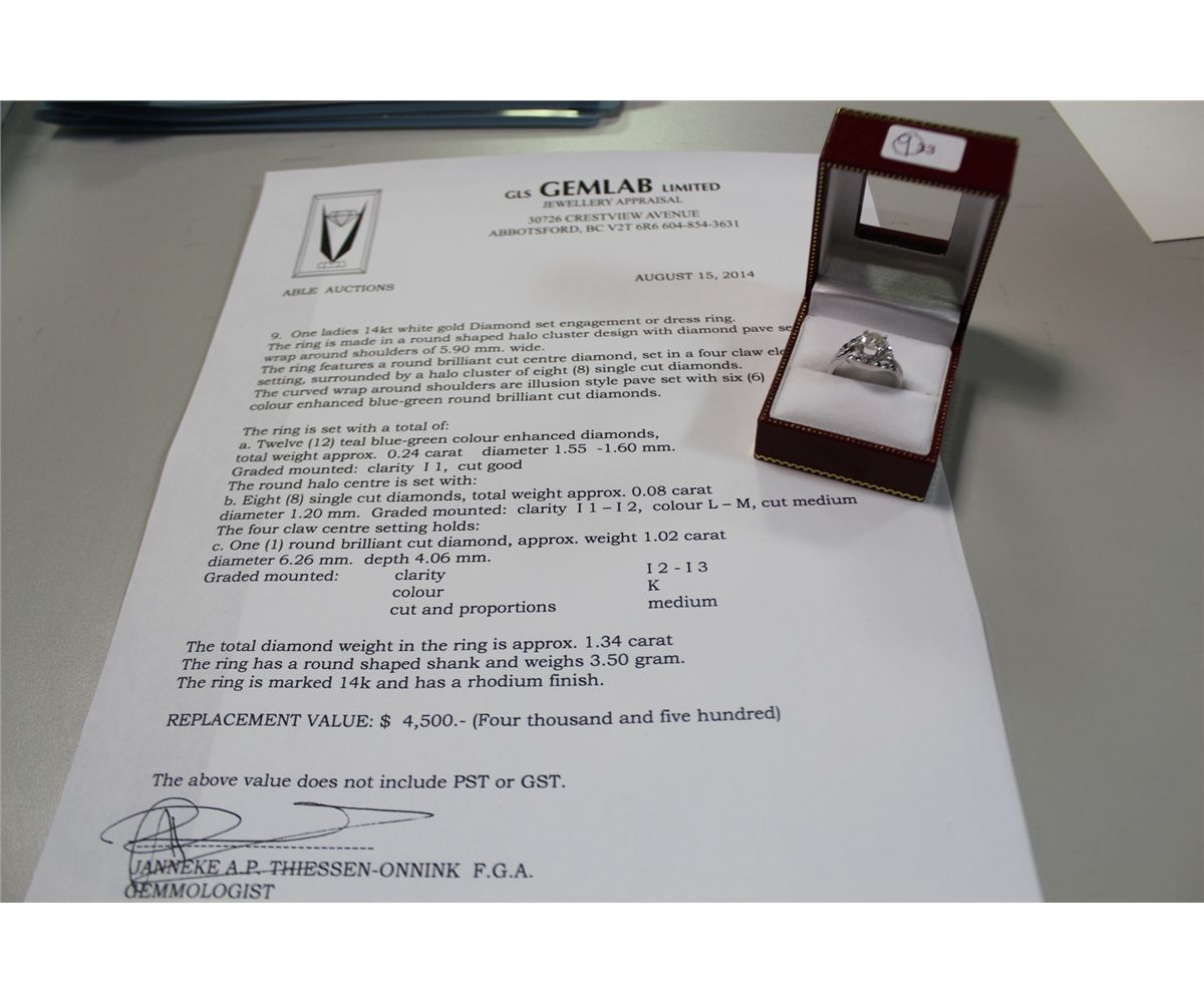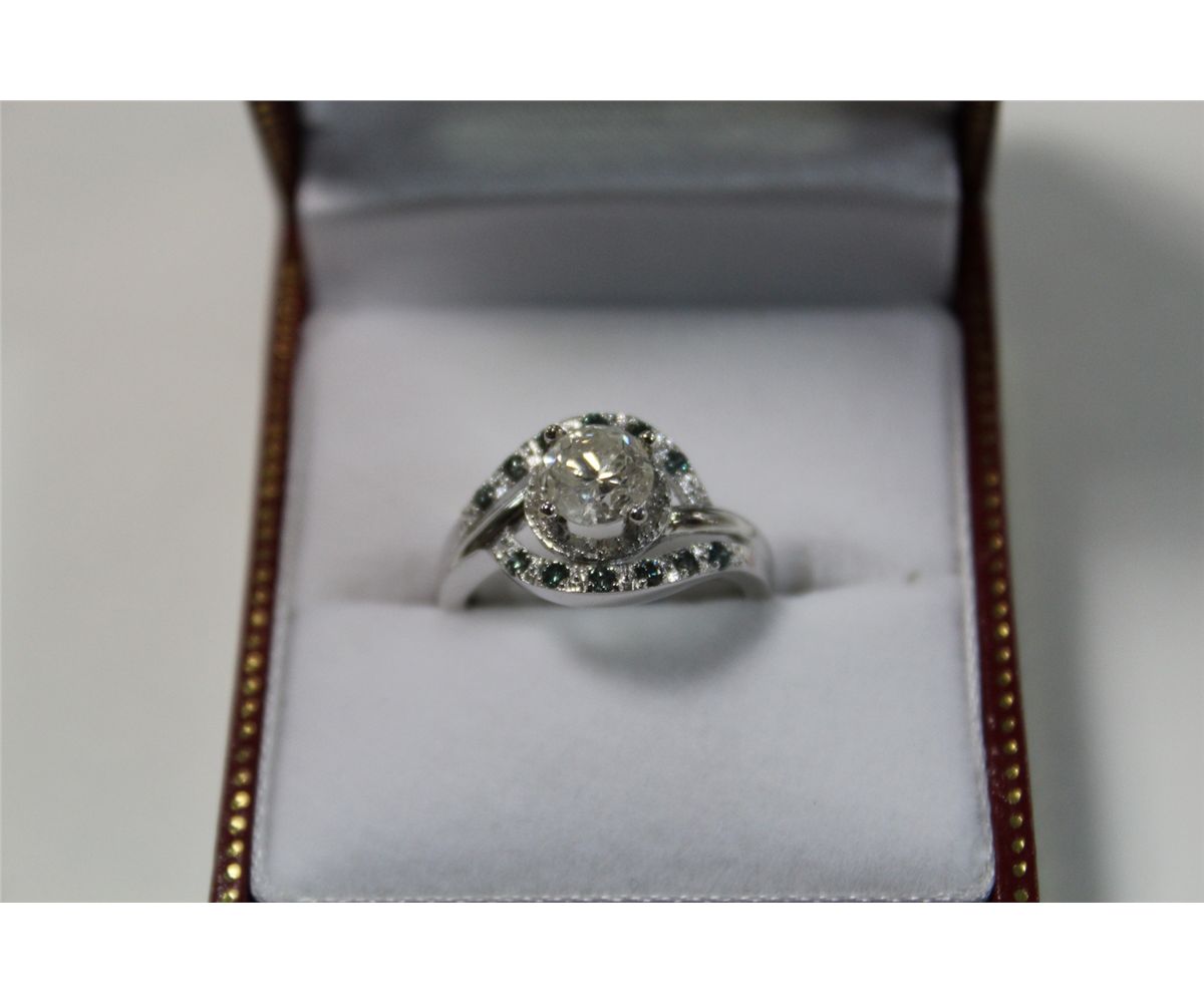 LADIES 14KT. WHITE GOLD DIAMOND SET ENGAGEMENT OR DRESS RING. SET WITH 12 TEAL BLUE-GREEN COLOUR ENHANCED DIAMONDS APPROX. 0.24 CARATS, 8 SINGLE CUT DIAMONDS APPROX. 0.08 CARATS, 1 BRILLIANT CUT DIAMOND APPROX. 1.02 CARATS. TOTAL DIAMOND WEIGHT 1.34 CARATS. REPLACEMENT $4500.00