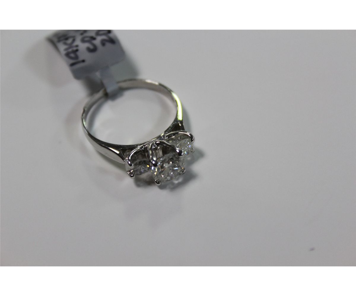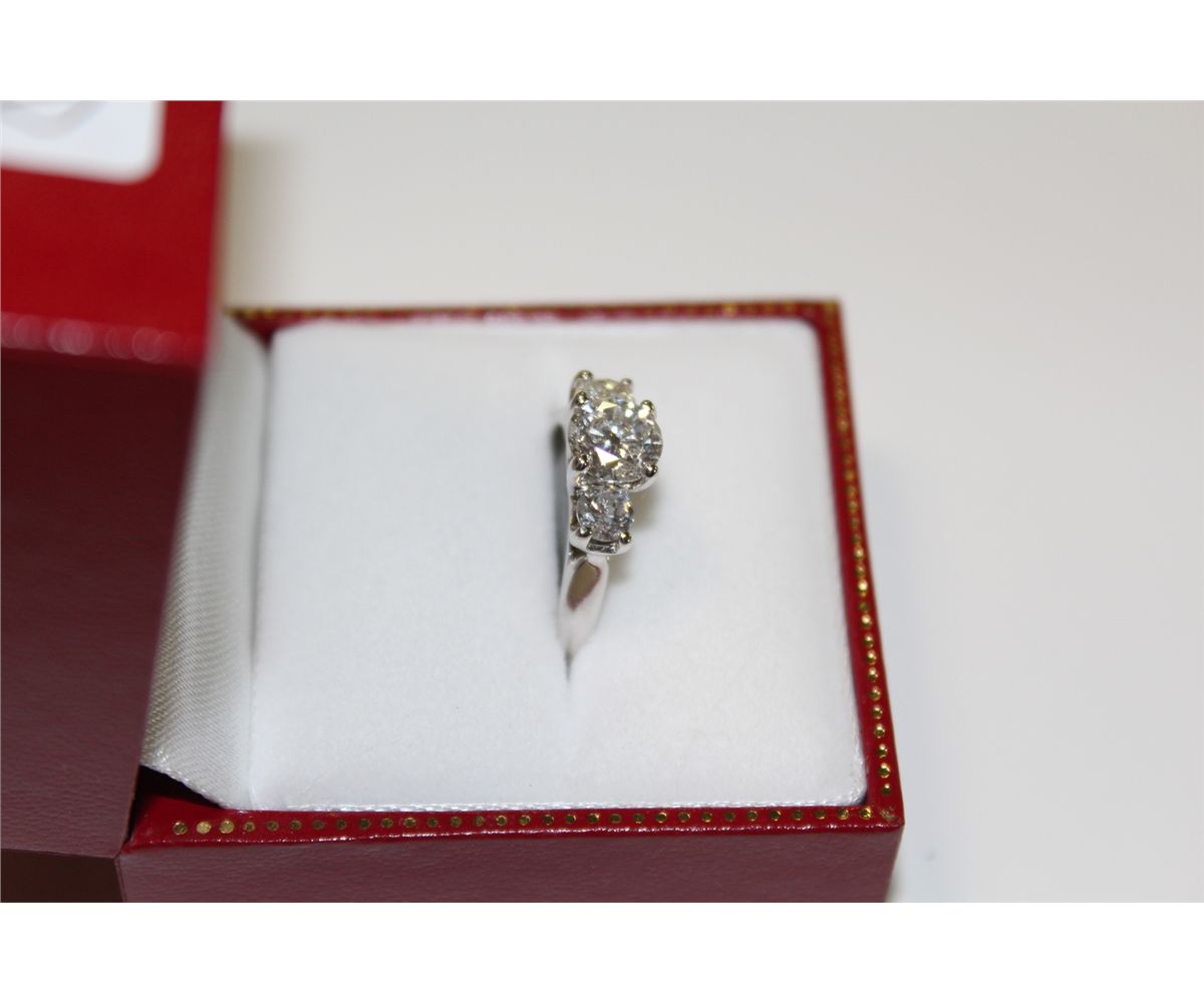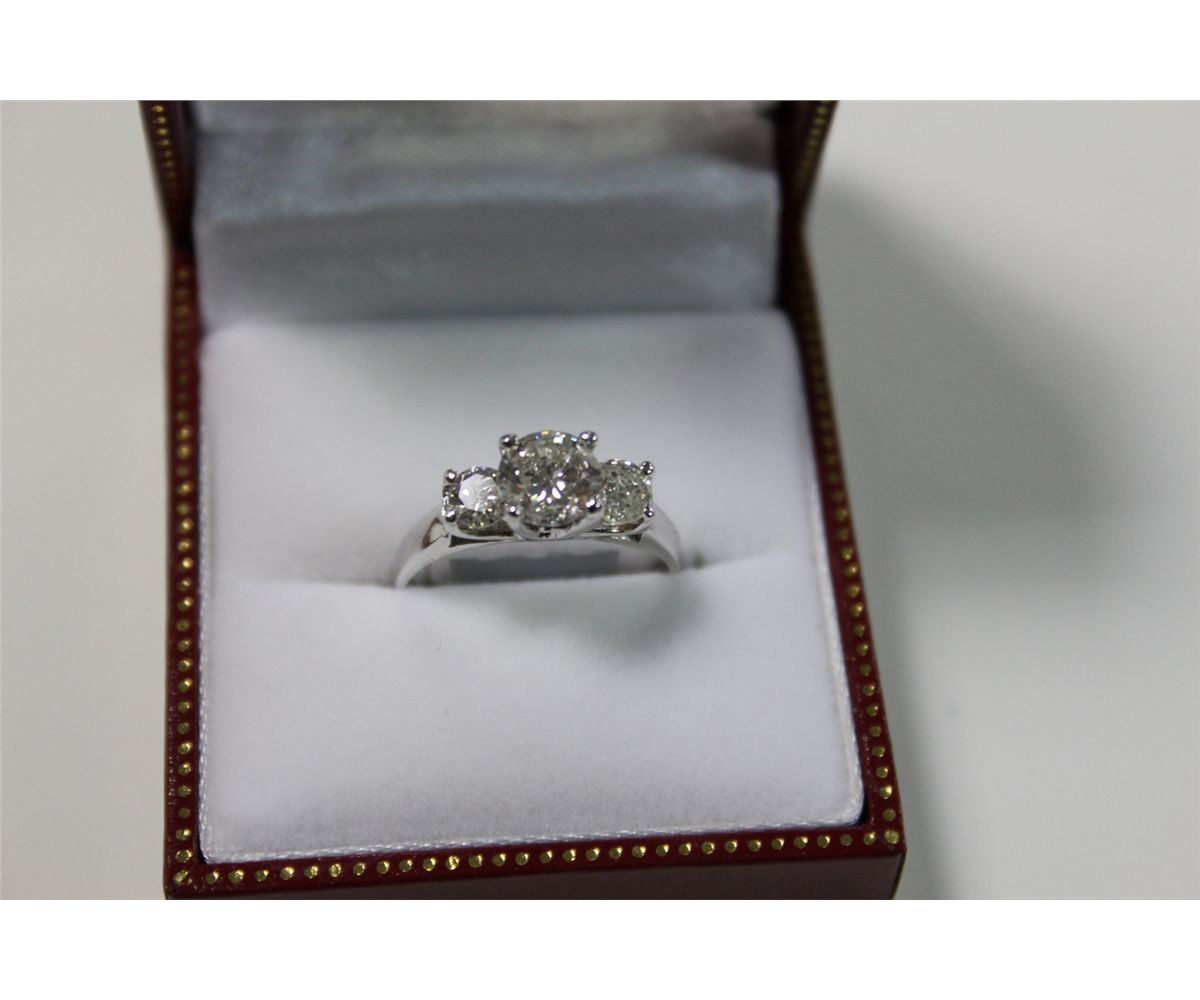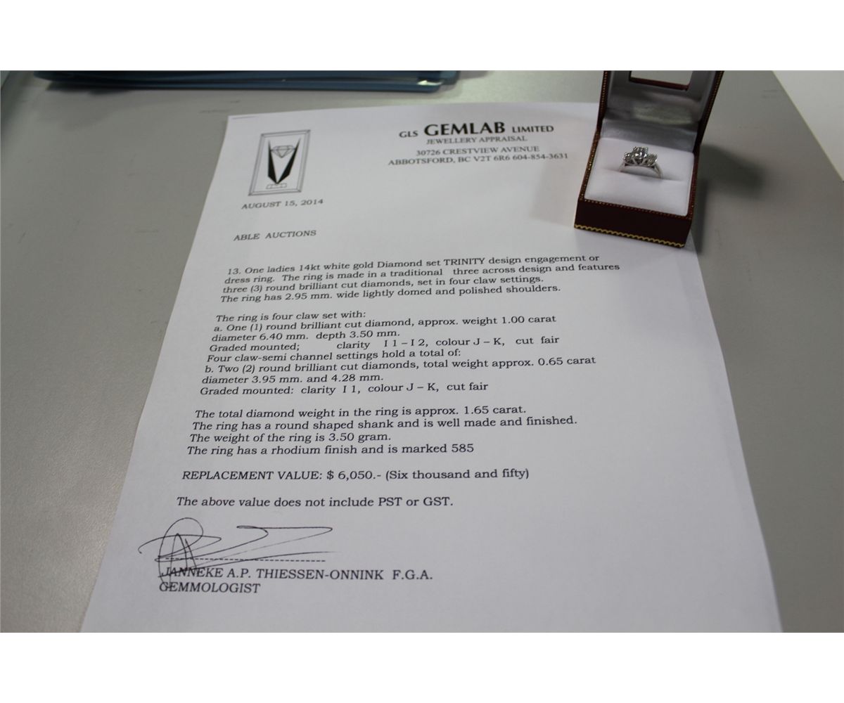 LADIES 14KT. WHITE GOLD DIAMOND SET TRINITY ENGAGEMENT OR DRESS RING. CLAW SET WITH 1 ROUND BRILLIANT CUT DIAMOND APPROX. 1.00 CARATS AND 2 ROUND BRILLIANT CUT DIAMONDS APPROX. 0.65 CARATS. TOTAL DIAMONDS APPROX. 1.65 CARATS. REPLACEMENT $6050.00