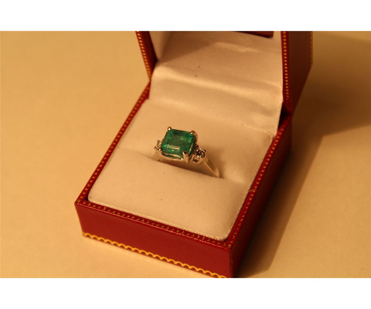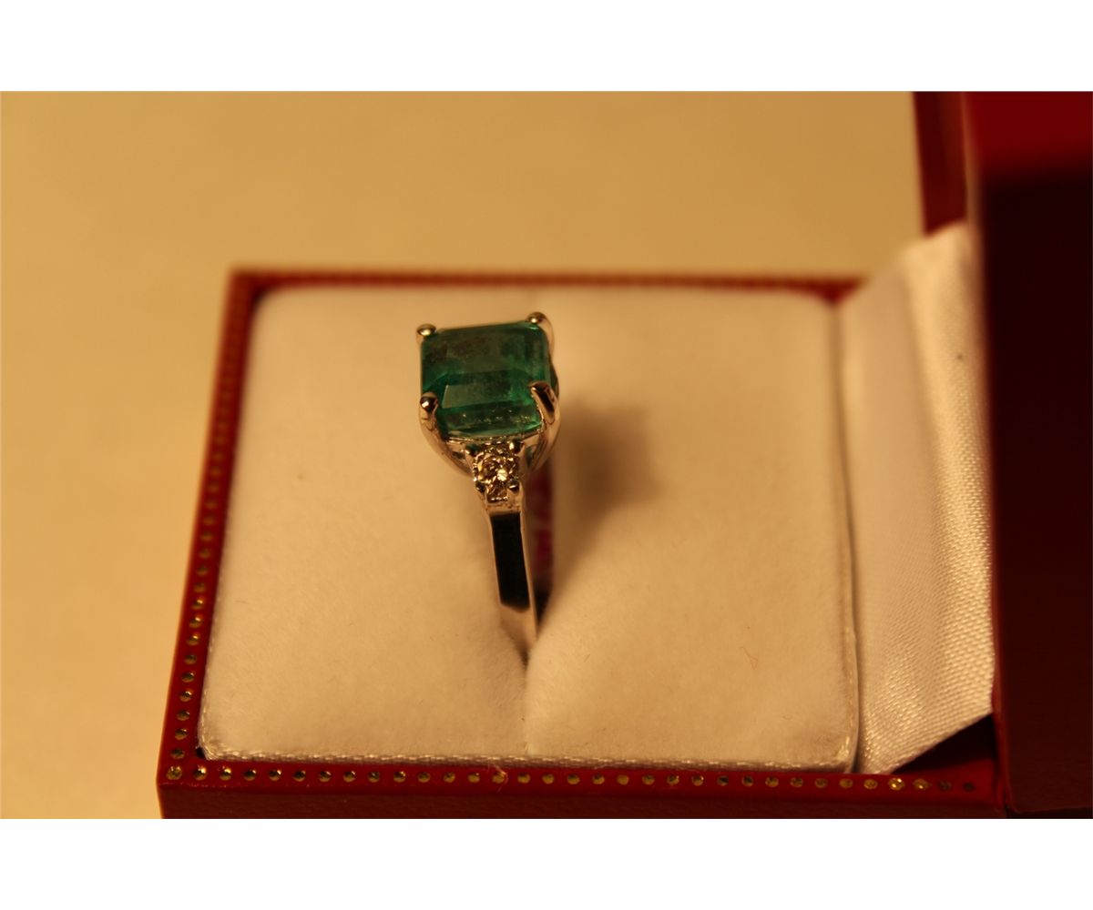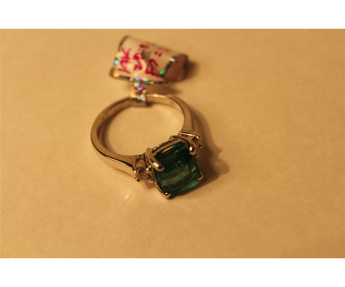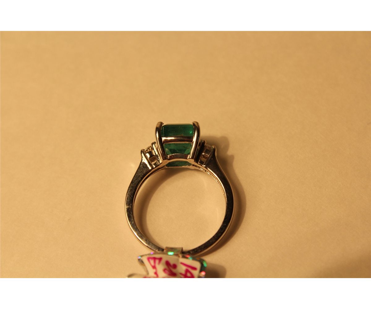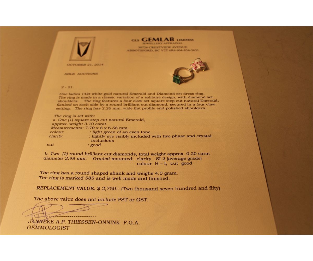 LADIES 14KT WHITE GOLD NATURAL EMERALD AND DIAMOND SET DRESS RING SET WITH 1 SQUARE STEP CUT NATURAL EMERALD APPROX. 3.10 CARATS, 2 ROUND BRILLIANT CUT DIAMONDS APPROX. 0.20 CARATS. REPLACEMENT VALUE: $2750