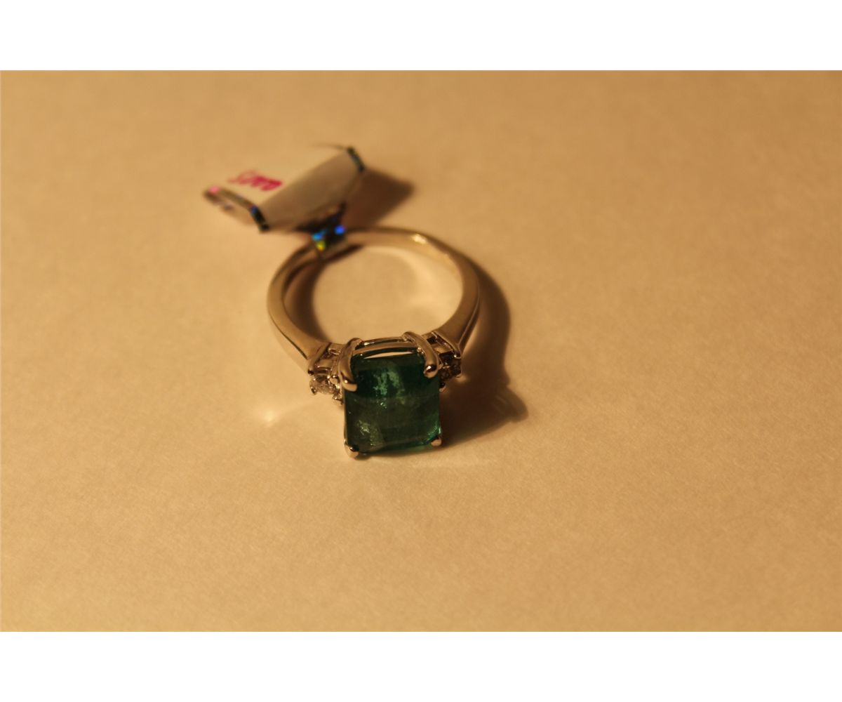 LADIES 14KT WHITE GOLD NATURAL EMERALD AND DIAMOND SET DRESS RING SET WITH 2 ROUND BRILLIANT CUT DIAMONDS APPROX. 0.20 CARATS AND 1 STEP CUT NATURAL EMERALD APPROX. 4.10 CARATS. REPLACEMENT VALUE: $2015.00