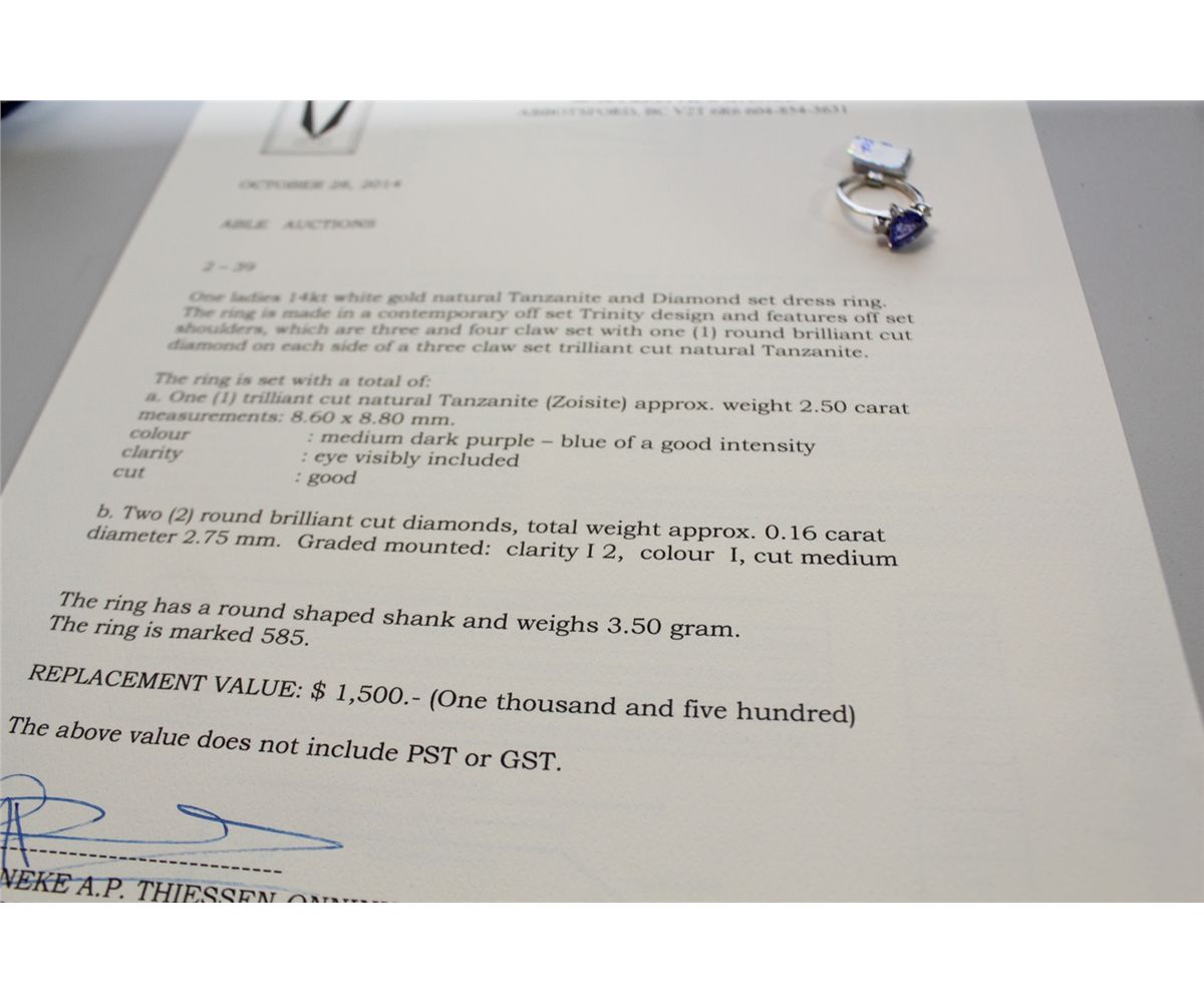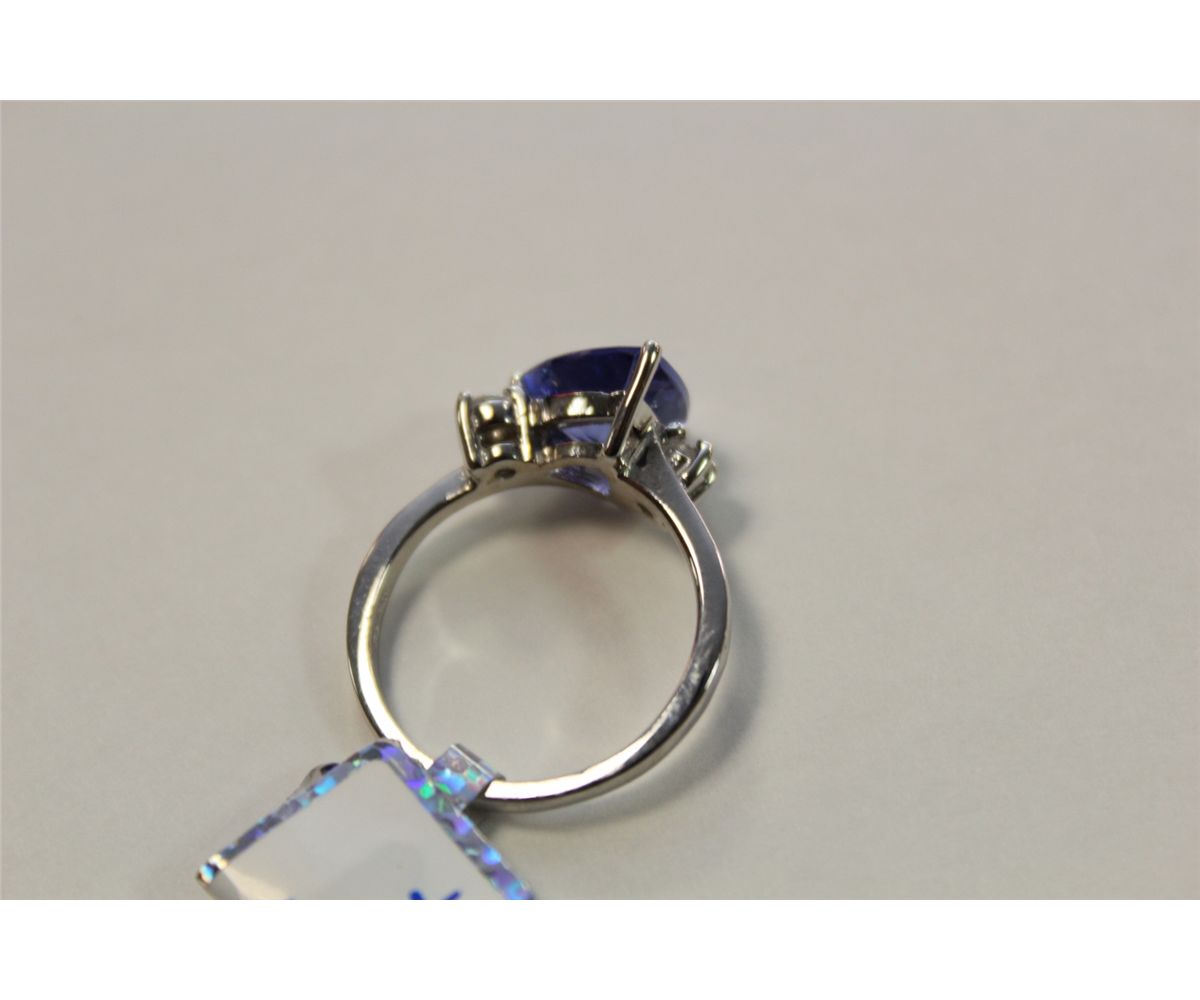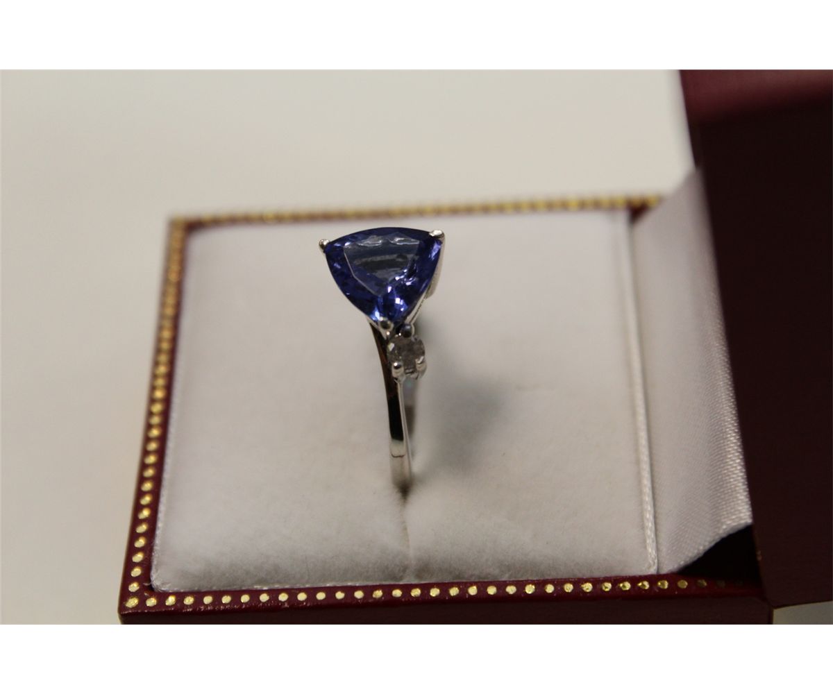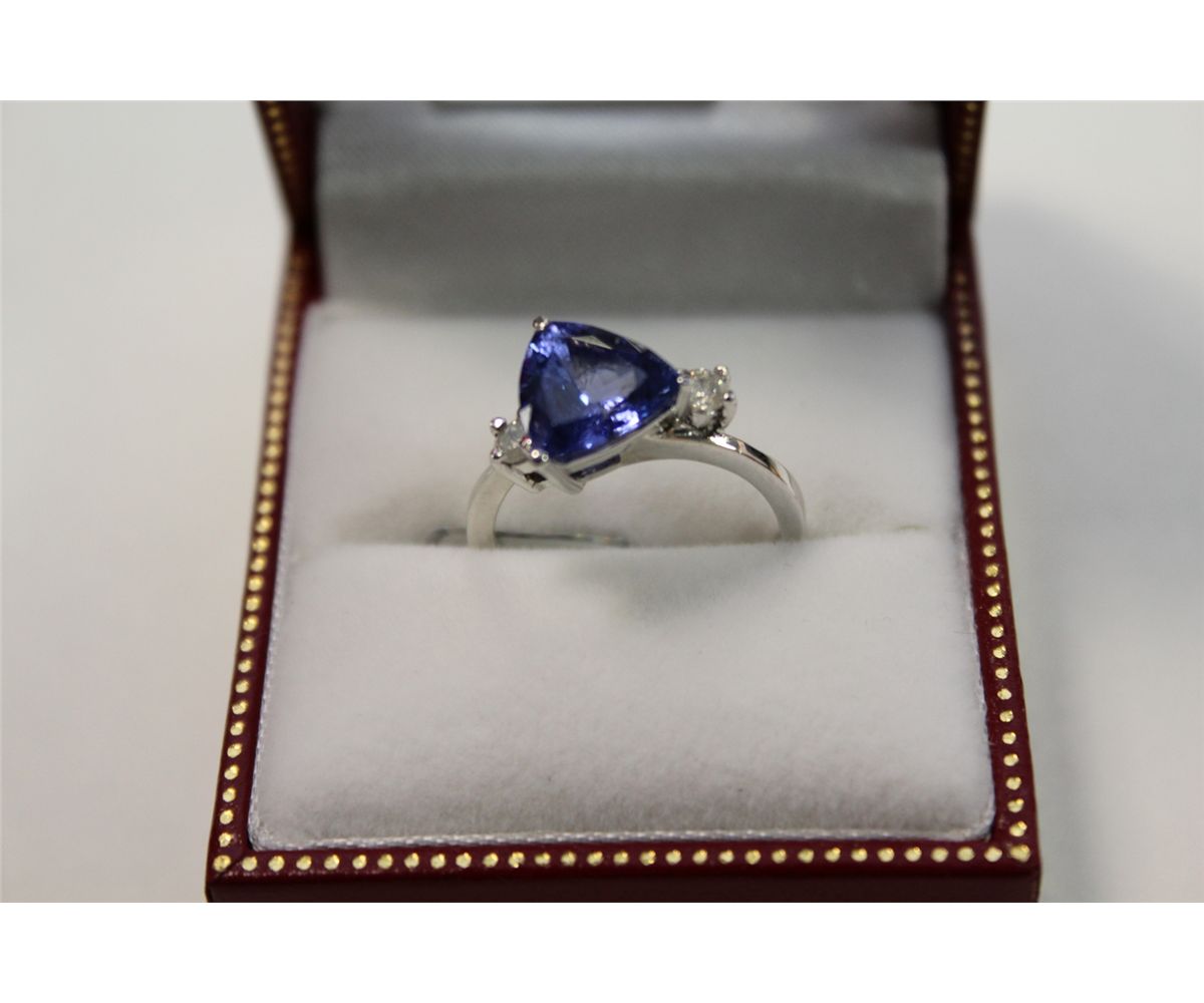 LADIES 14KT. WHITE GOLD NATURAL TANZANITE AND DIAMOND SET DRESS RING SET WITH A TOTAL OF 1 TRILLIANT CUT NATURAL TANZANITE APPROX. 2.50 CARATS AND 2 ROUND BRILLIANT CUT DIAMONDS APPROX. 0.16 CARATS REPLACEMENT VALUE: $1500.00