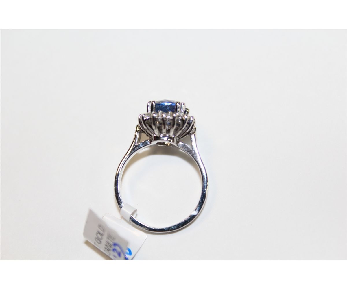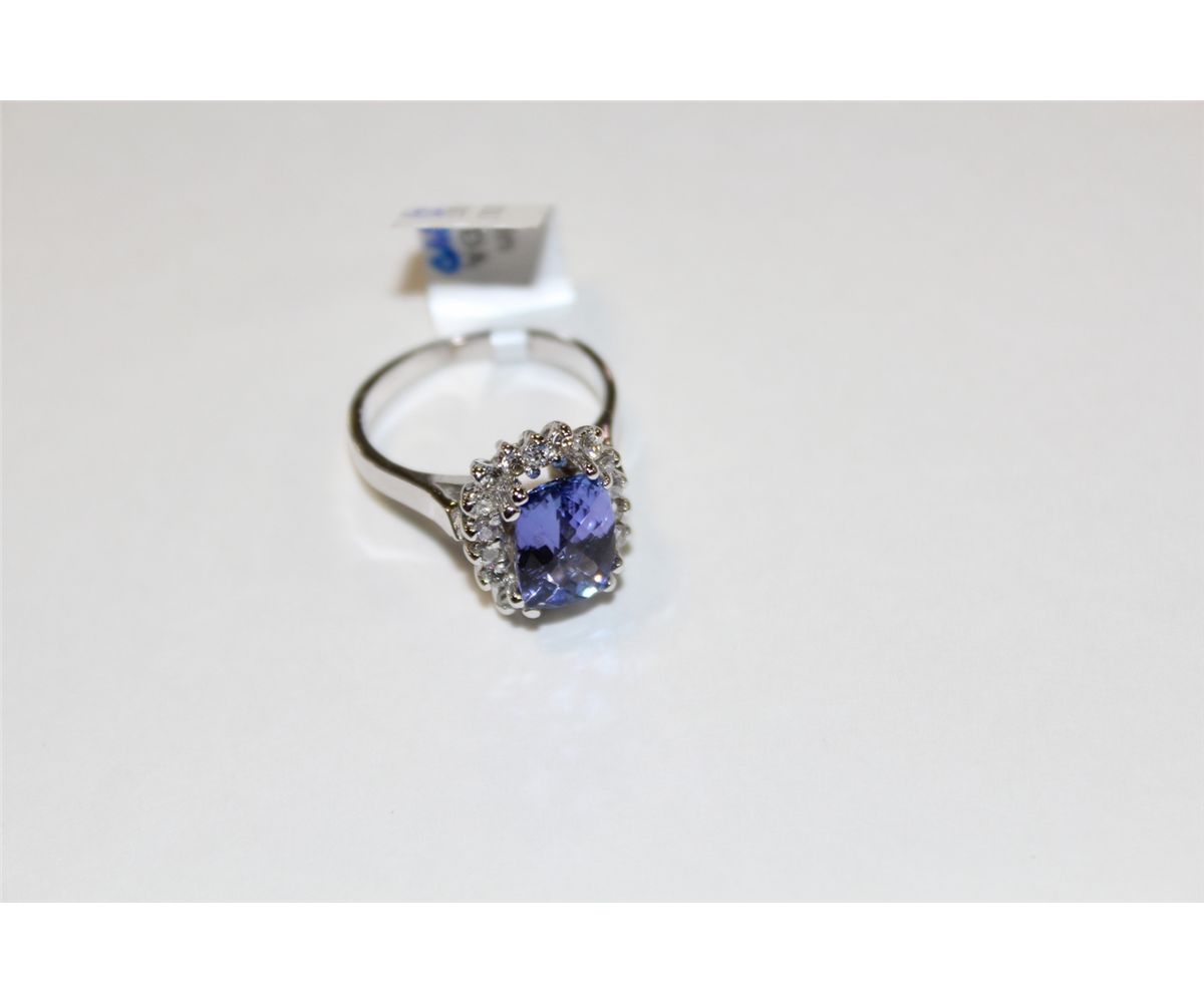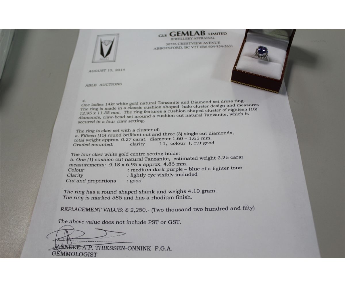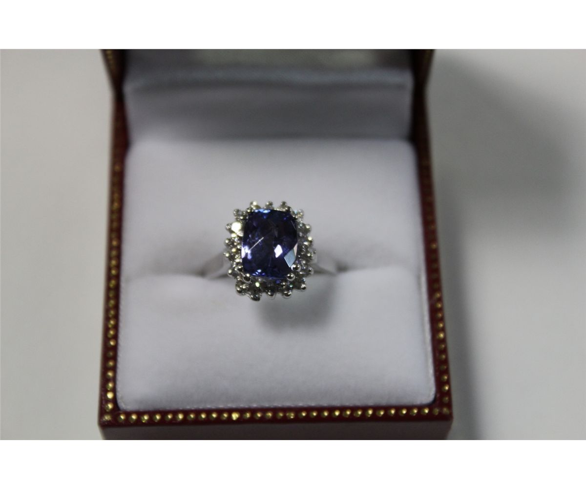 LADIES 14KT. WHITE GOLD NATURAL TANZANITE & DIAMOND SET DRESS RING. SET WITH 15 BRILLIANT CUT AND 3 SINGLE CUT DIAMONDS TOTAL WEIGHT OF 0.27 CARATS. 4 CLAW WHITE GOLD CENTER HOLD CUSHION CUT NATURAL TANZANITE ESTIMATED WEIGHT 2.25 CARATS, REPLACEMENT $2250.00