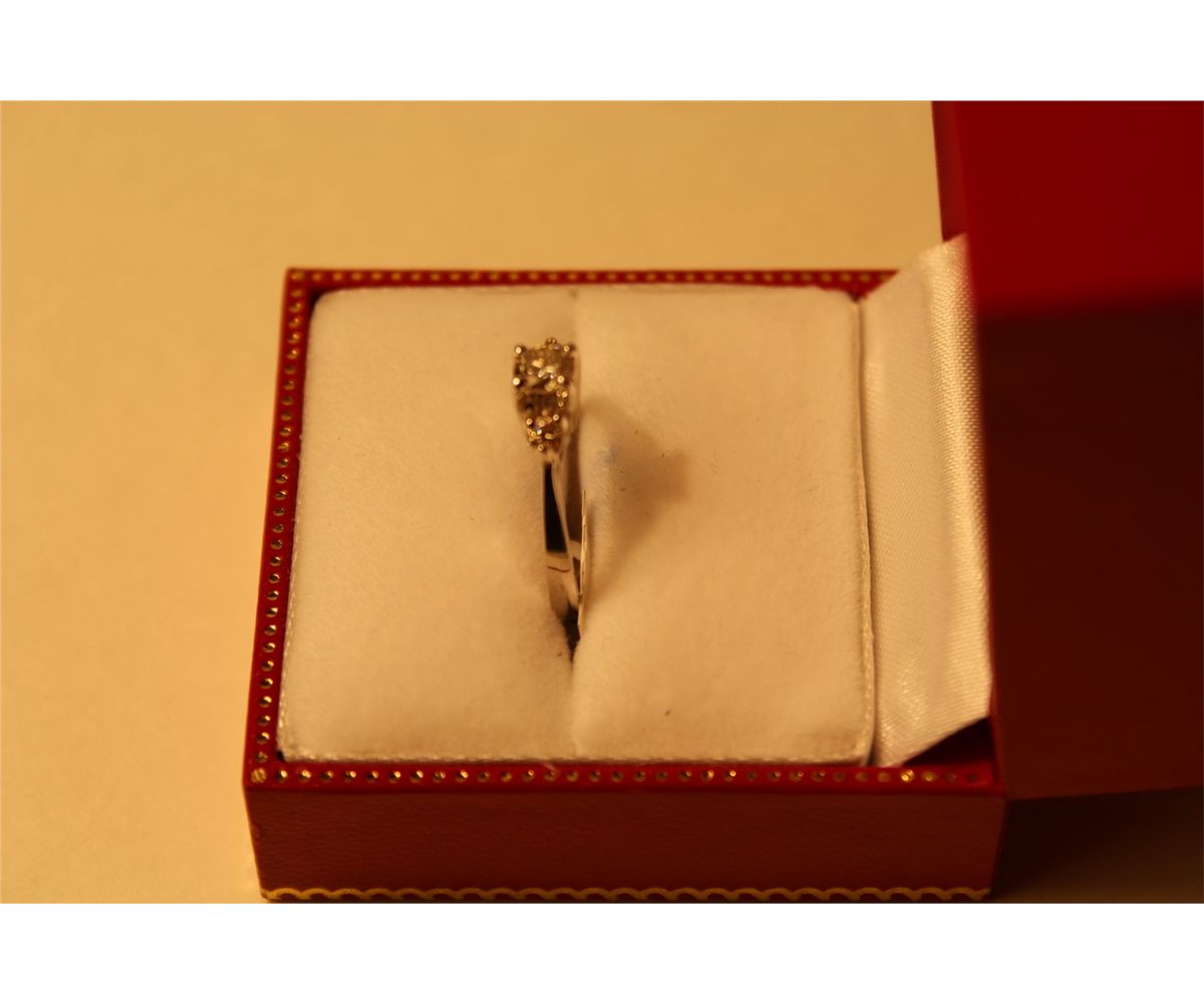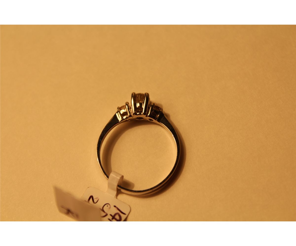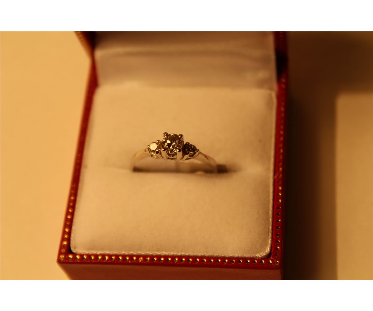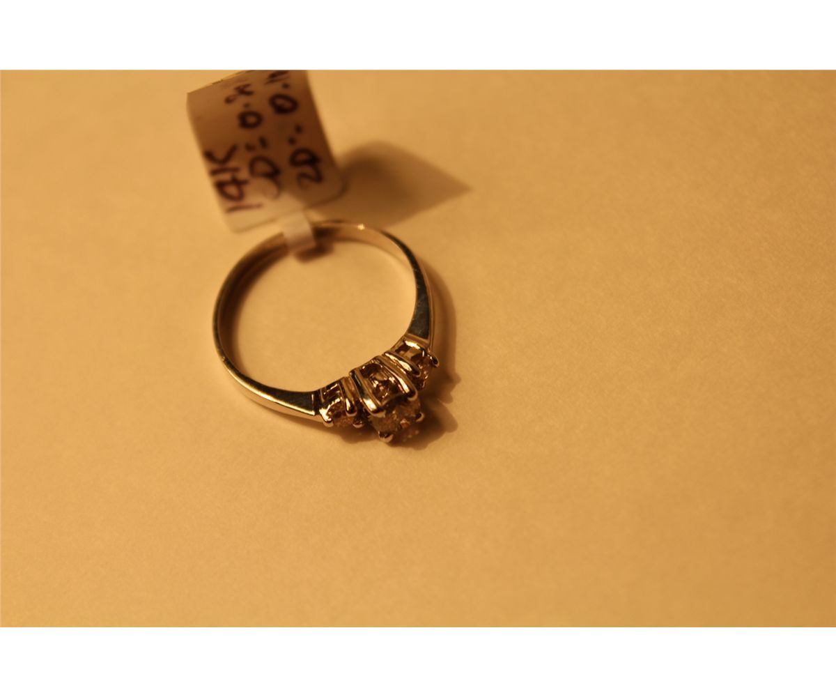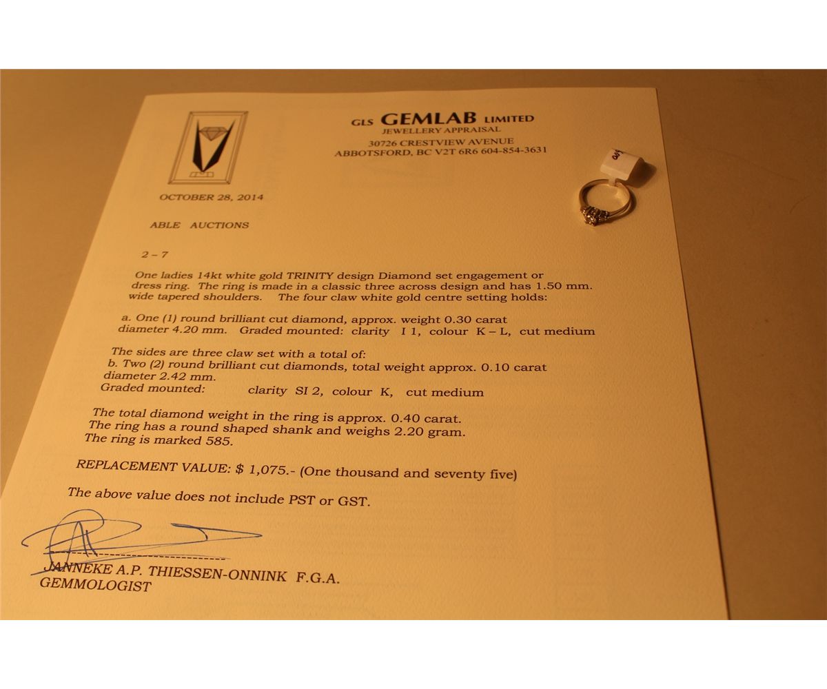 LADIES 14KT WHITE GOLD TRINITY DESIGN DIAMOND SET ENGAGEMENT /DRESS RING SET WITH 1 ROUND BRILLIANT CUT DIAMOND APPROX. 0.30 CARATS AND 2 ROUND BRILLIANT CUT DIAMONDS APPROX. 0.10 CARATS. TOTAL DIAMOND WEIGHT: APPROX. 0.40 CARATS. REPLACEMENT VALUE: $10