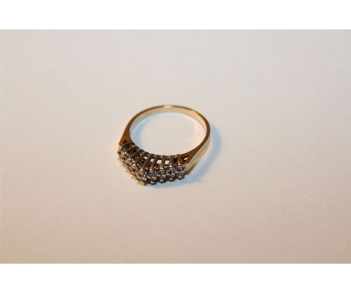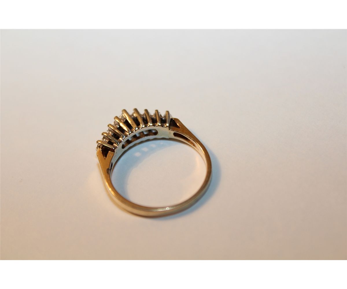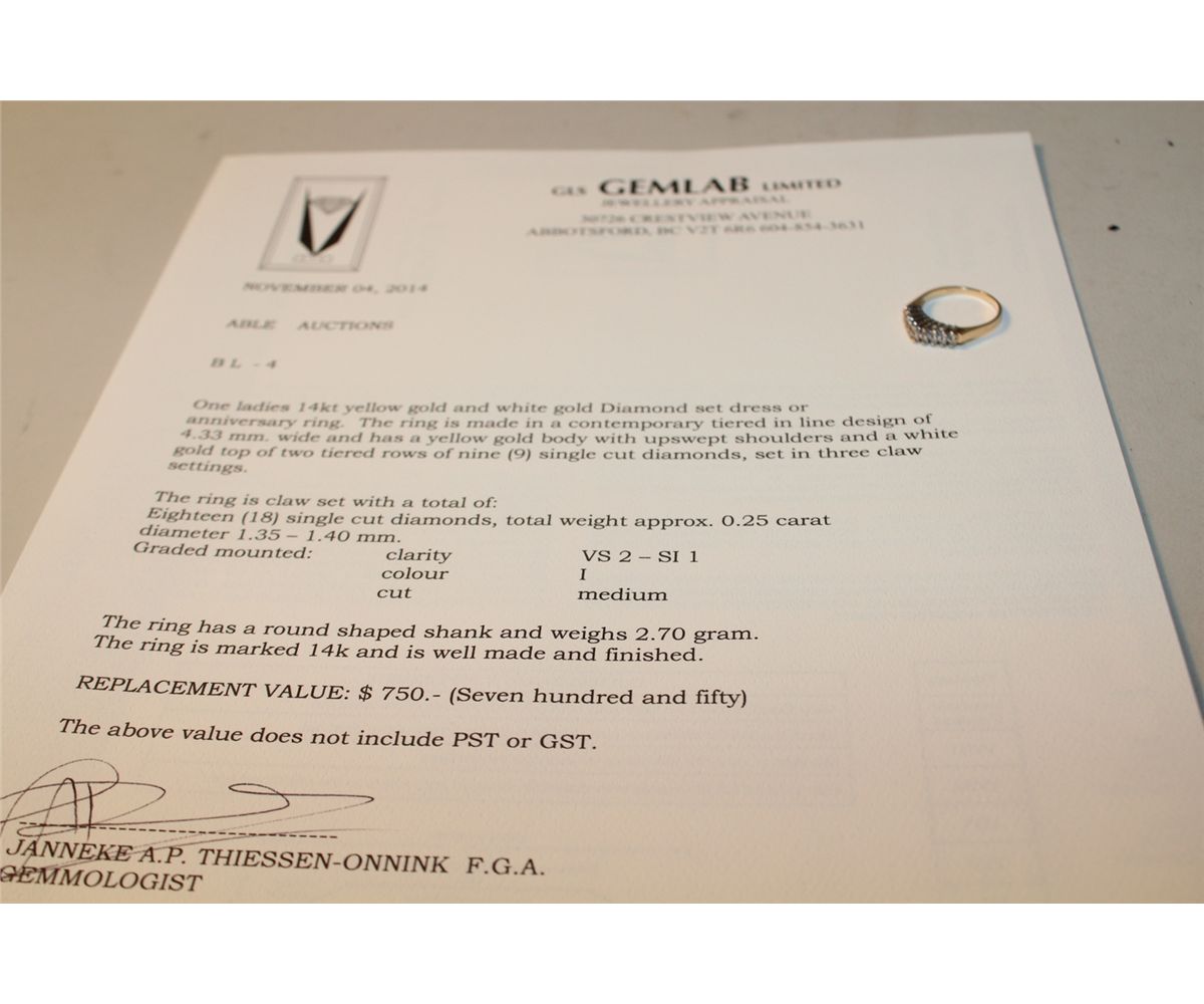 LADIES 14KT YELLOW GOLD AND WHITE GOLD DIAMOND SET DRESS/ANNIVERSARY RING. CLAW SET WITH A TOTAL OF 18 SINGLE CUT DIAMONDS APPROX. 0.25 CARATS. REPLACEMENT VALUE: $750.00