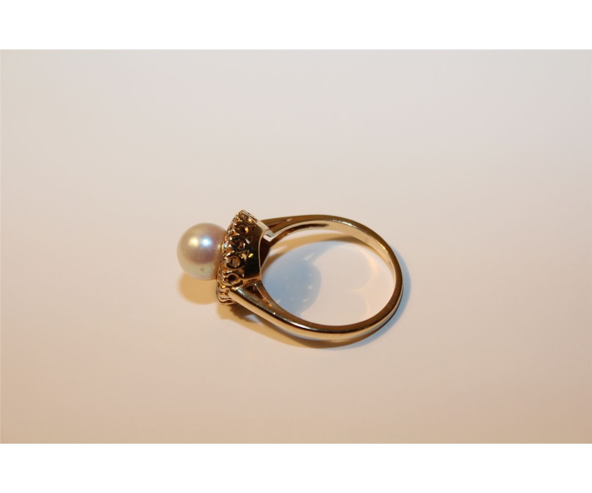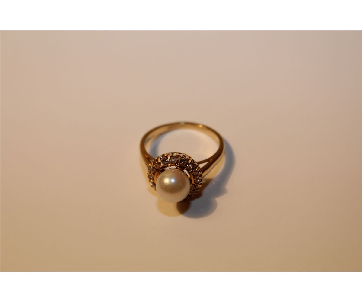 LADIES 14KT YELLOW GOLD DIAMOND & ROUND WHITE CULTURED PEARL DRESS RING. CLAW SET WITH 15 OLD EUROPEAN CUT, SINGLE CUT, AND ROUND BRILLIANT CUT DIAMONDS APPROX. 0.38 CARATS AND 1 CREAMY WHITE CULTURED PEARL. REPLACEMENT VALUE: $1350.00