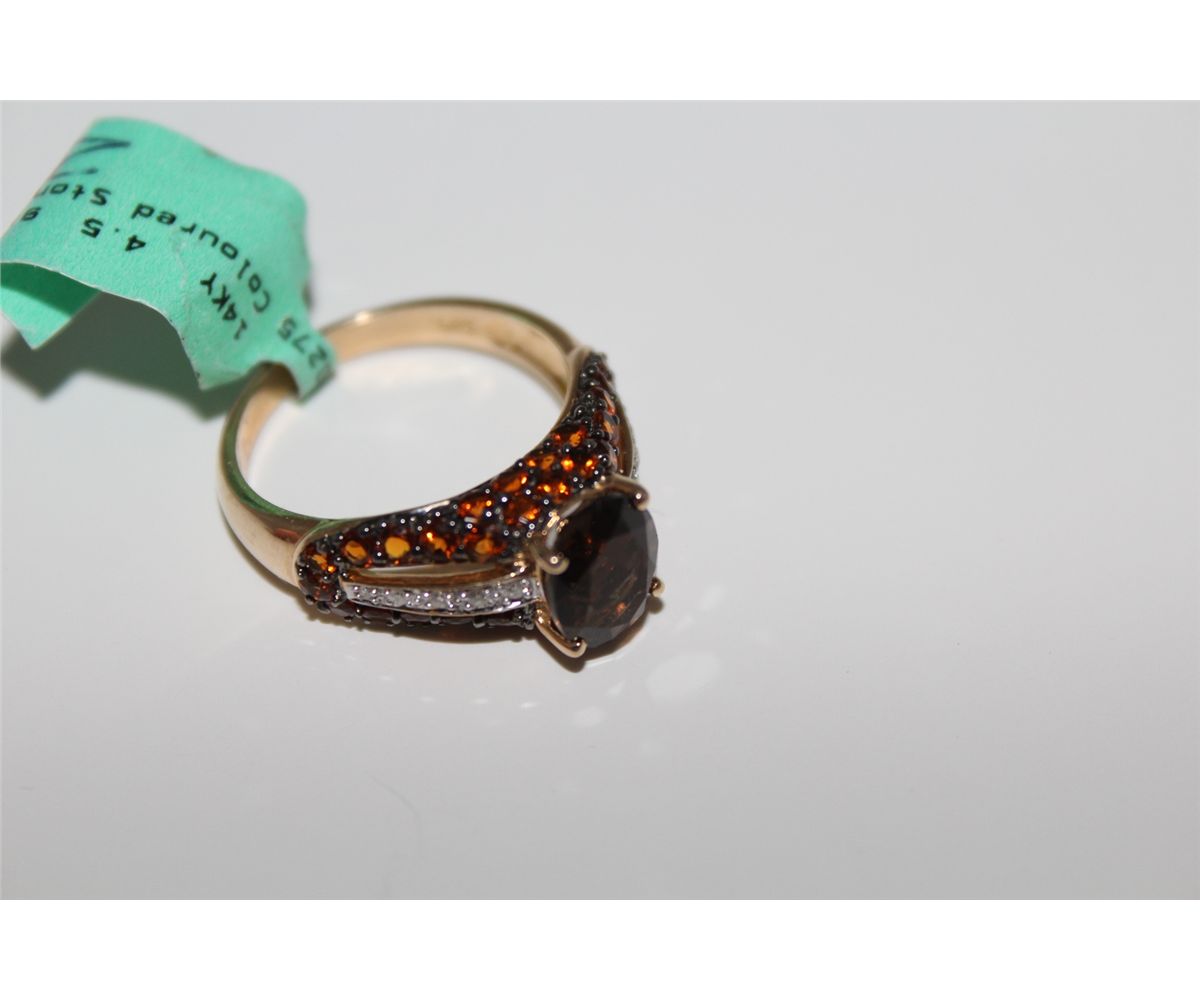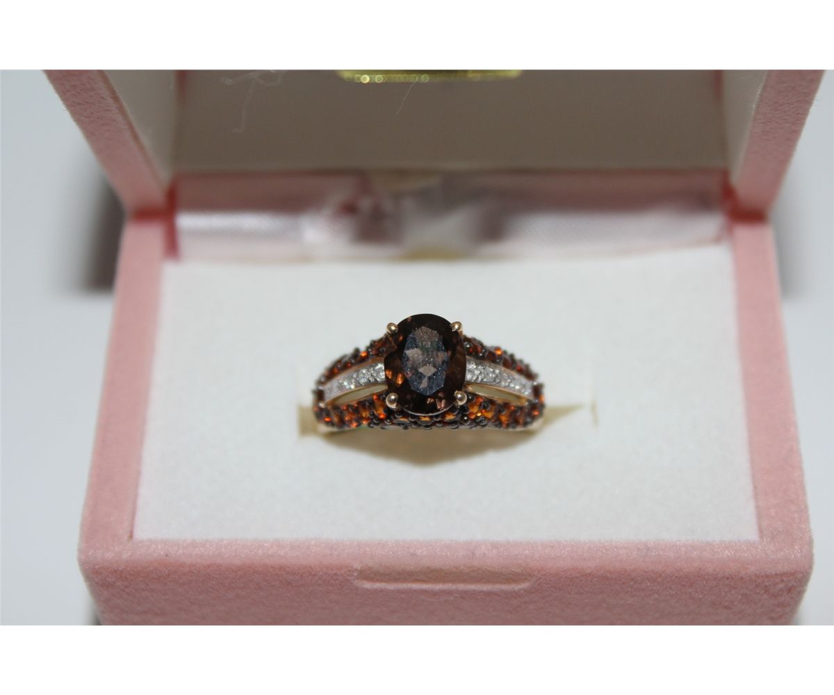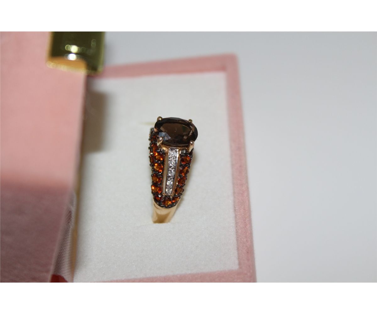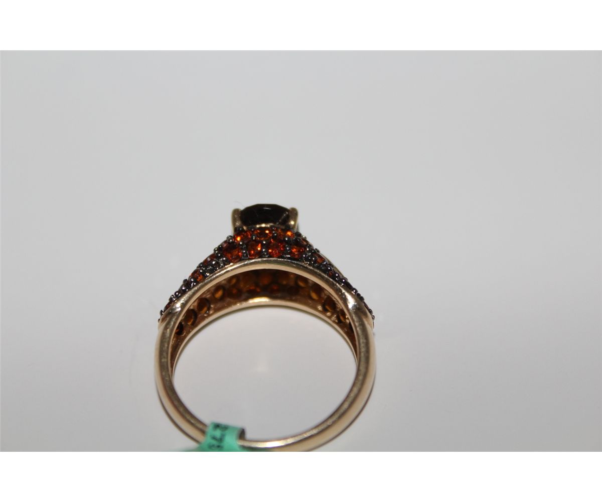 LADIES 14KT. YELLOW GOLD & RHODIUM FINISH NATURAL SMOKEY QUARTZ, NATURAL CITRINE QUARTZ & DIAMOND DRESS RING. PAVE SET AND DOMED DESIGN WITH 36 ROUND BRILLIANT CUT NATURAL CITRINE QUARTZ, 10 ROUND BRILLIANT CUT DIAMONDS APPROX. 0.06 CARATS, 1 OVAL MIXED CUT NATURAL