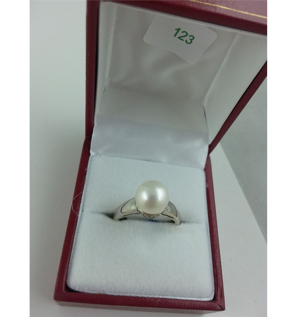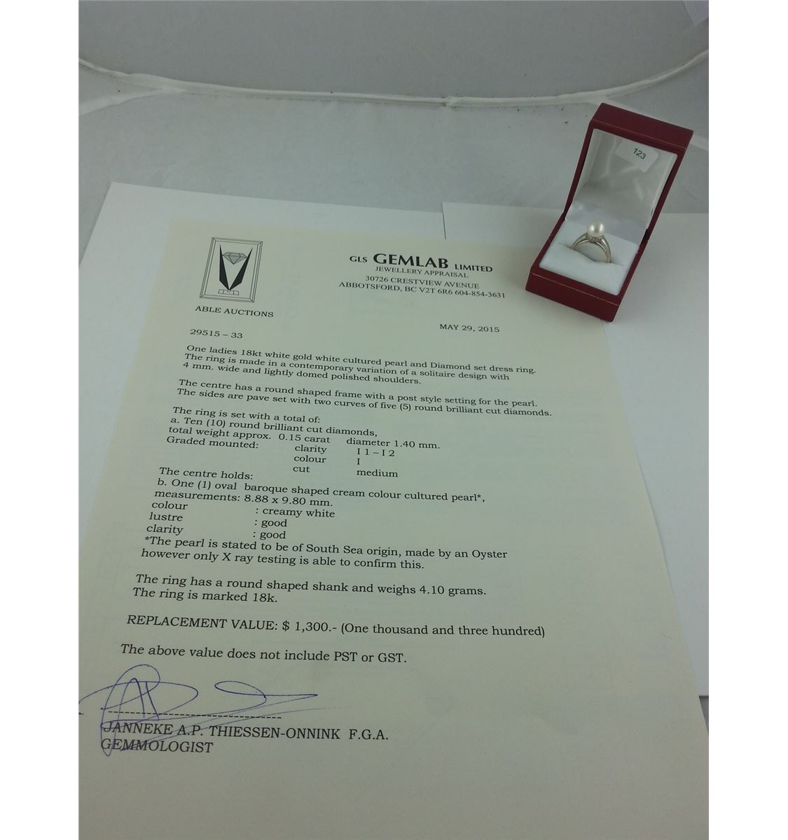 LADIES 18KT WHITE GOLD WHITE CULTURED PEARL AND DIAMOND SET DRESS RING WITH 10 DIAMONDS, APPROX 0.15CARAT AND ONE CREAM COLOUR CULTURED PEARL REPLACEMENT VALUE $1300