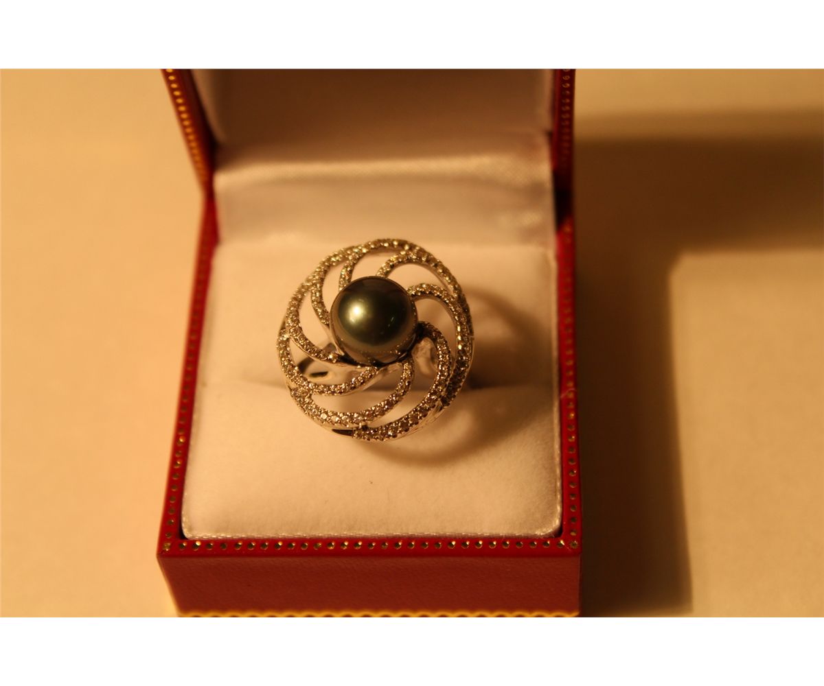 LADIES 925 STERLING SILVER COLOURLESS CUBIC ZIRCONIA AND BLACK TAHITIAN CULTURED PEARL DRESS RING. RING IS SET WITH APPROX. 123 ROUND MIXED CUT COLOURLESS CUBIC ZIRCONIA AND 1 ROUND BLACK TAHITIAN CULTURED PEARL. REPLACEMENT VALUE: $575.00