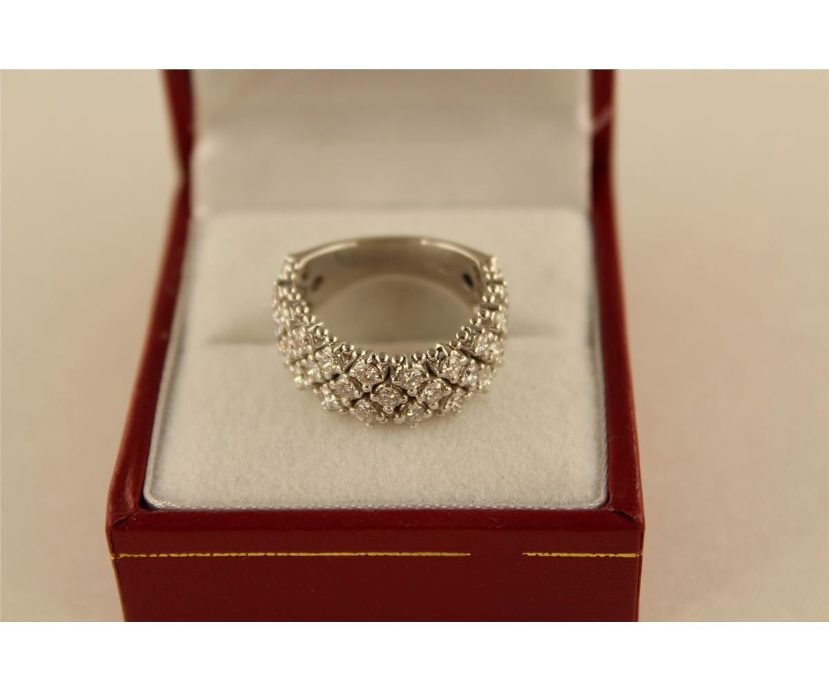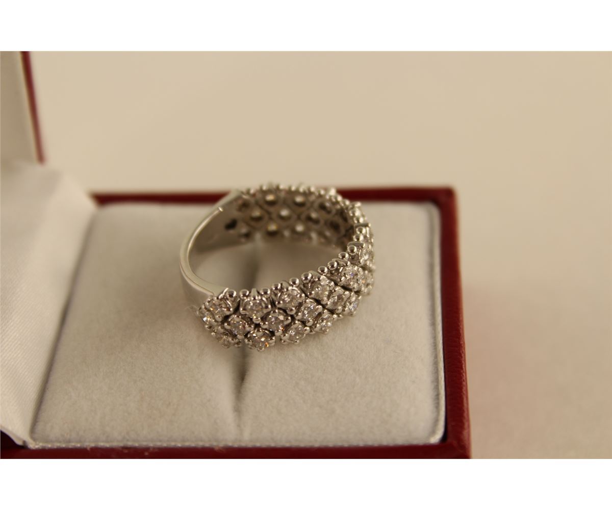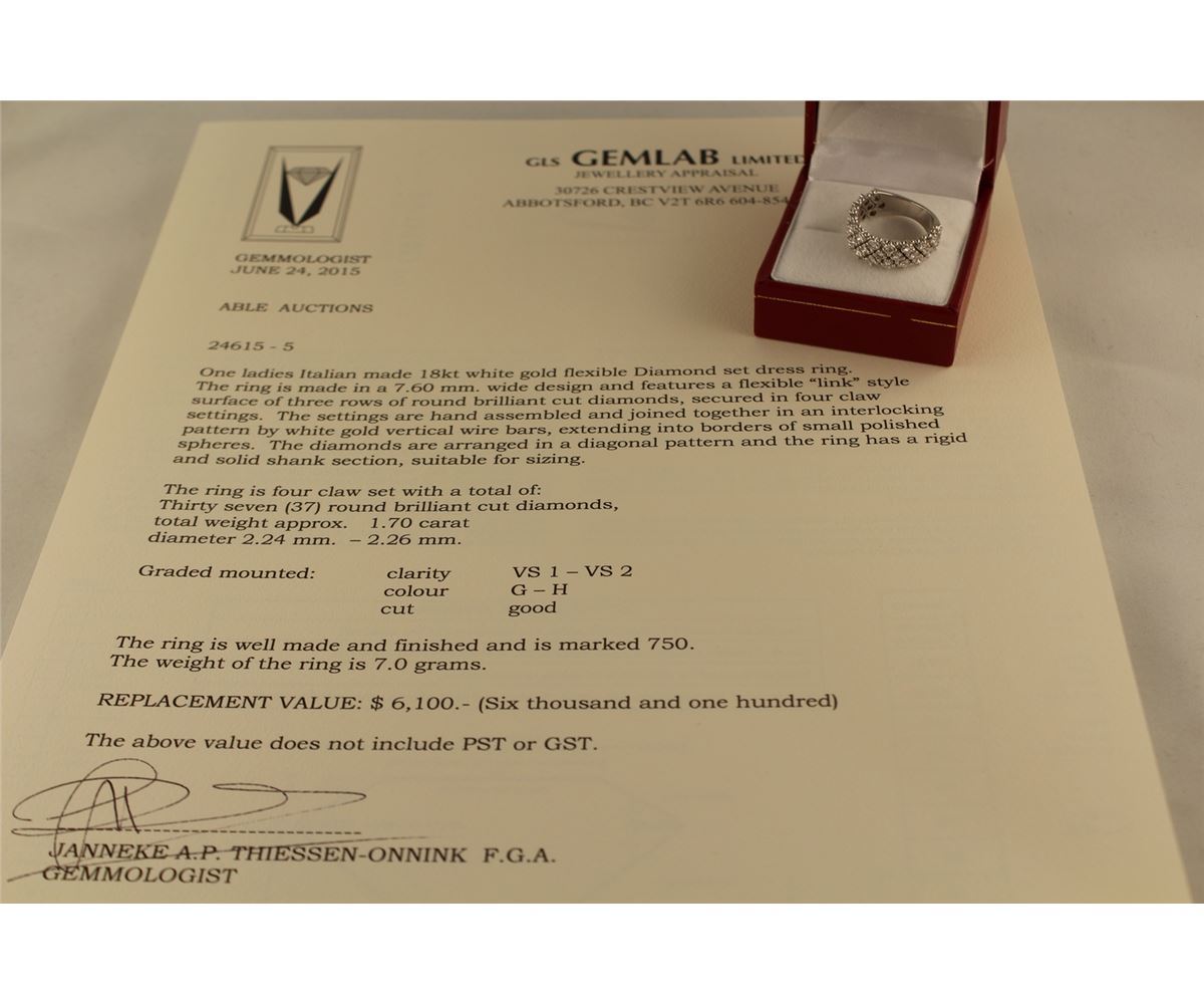LADIES ITALIAN MADE 18KT WHITE GOLD FLEXIBLE DIAMOND SET DRESS RING CLAW SET WITH 37 ROUND BRILLIANT CUT DIAMONDS APPROX. 1.70 CARATS.  IS DONE IN A FLEXIBLE "LINK" STYLE SURFACE DESIGN.  REPLACEMENT VALUE:$6,100.00