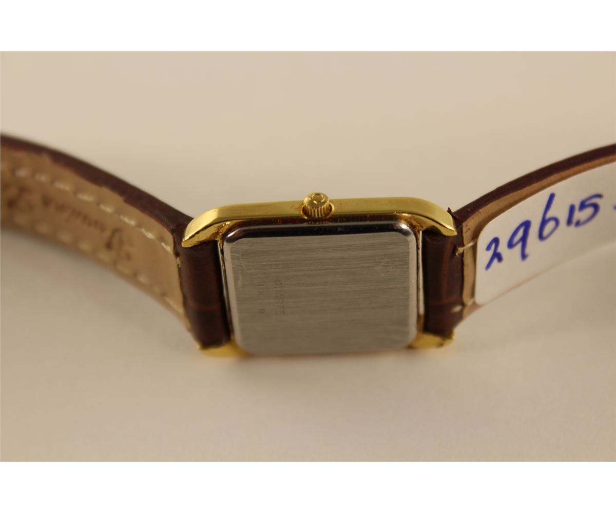 LADIES OMEGA DE VILLE GOLD ON STEEL (ROLLED GOLD) WRIST WATCH. HAS A CHAMPAGNE DIAL WITH GOLD TONE HOUR MARKERS AND QUARTZ MOVEMENT. ATTACHED IS A BROWN CROCODILE STYLE LEATHER STRAP WITH A YELLOW GOLD PLATED OMEGA BUCKLE.  REPLACEMENT VALUE:$2100.00
