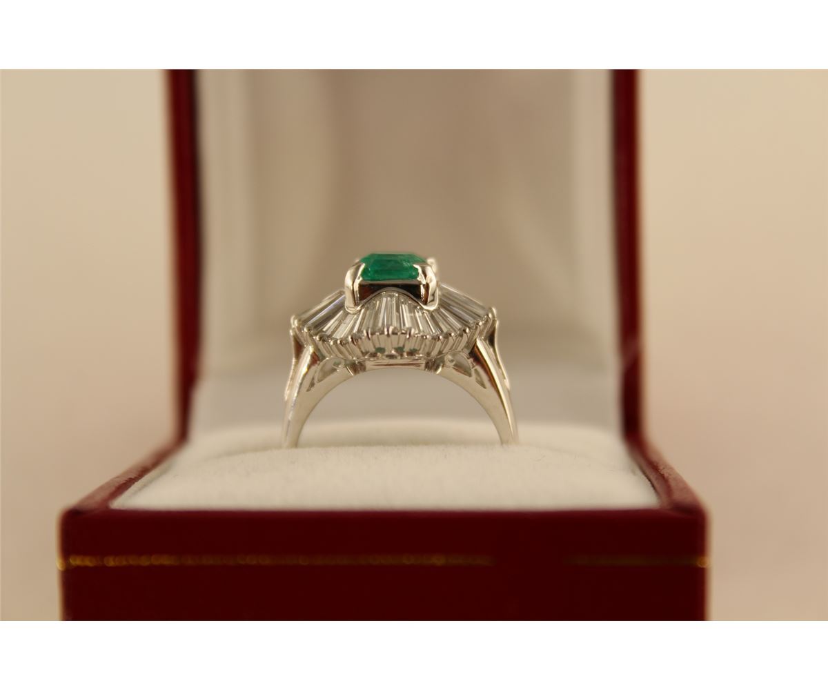 LADIES PLATINUM NATURAL EMERALD & DIAMOND SET DRESS RING SET WITH 32 TAPERED  BAGUETTE CUT DIAMONDS APPROX. 1.62 CARATS AND 1 STEP CUT NATURAL EMERALD APPROX. 1.45 CARATS. MARKED 900.  REPLACEMENT VALUE:$14,500.00