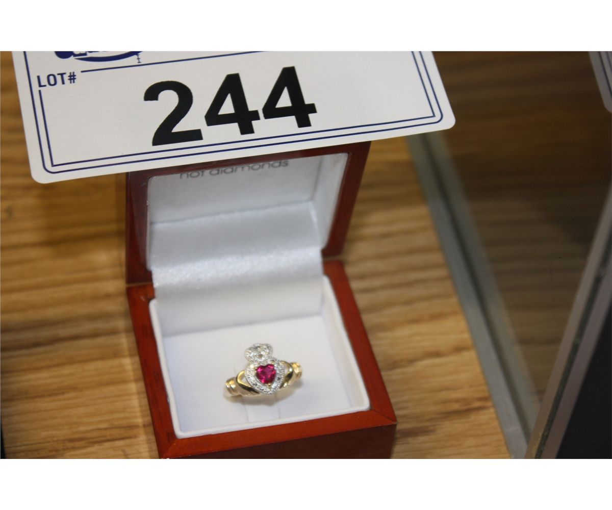 LADIES RUBY AND DIAMOND STERLING SILVER AND GOLD CLADDAGH RING