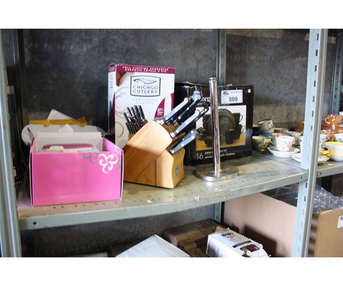LADIES SILKEN SENSEPIL, CHICAGO CUTLERY KNIFE SET AND GEORGE 16PC DISHWARE SET AND PAPER TOWEL HOLDER