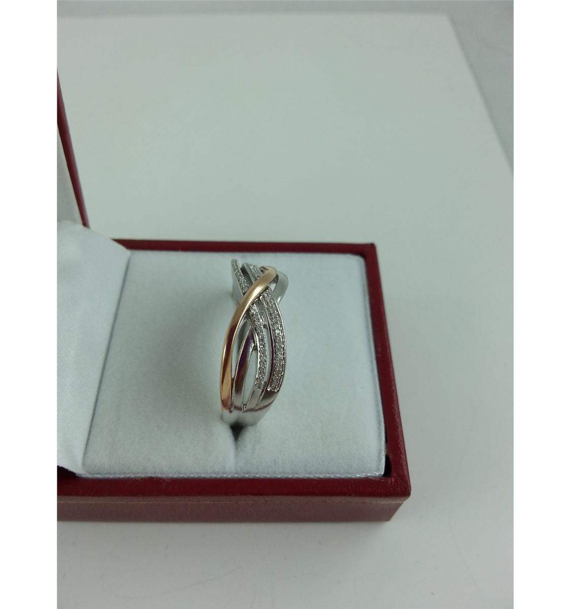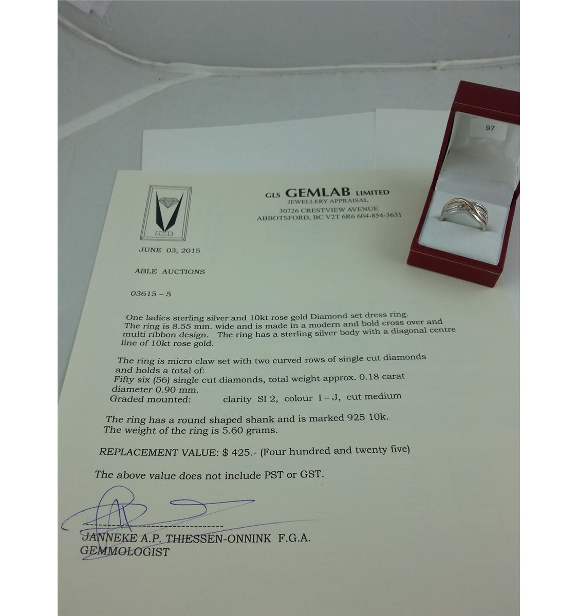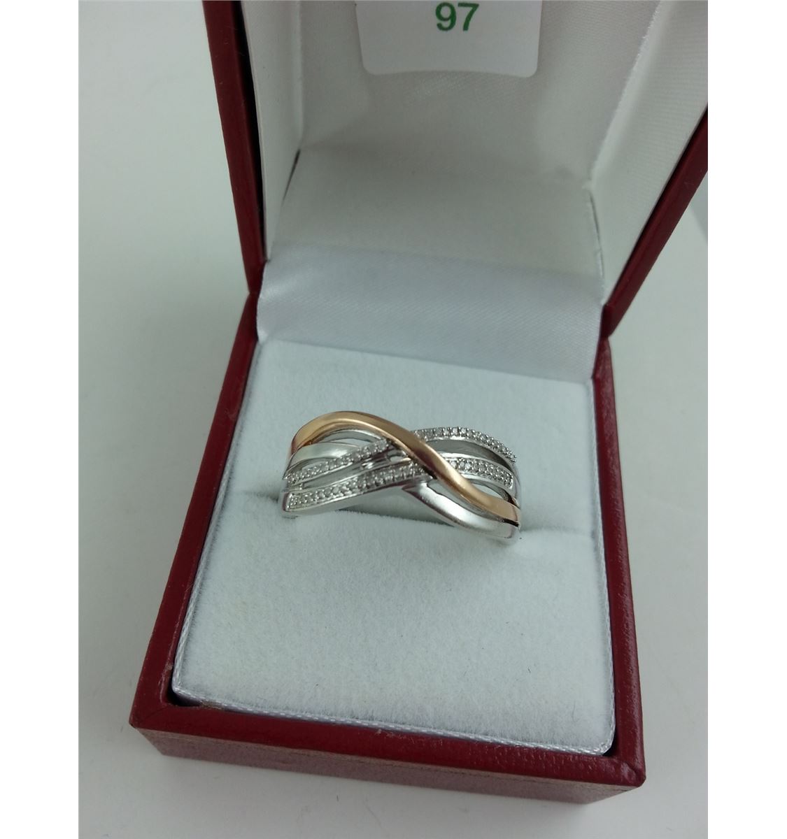 LADIES STERLING SILVER AND 10KT ROSE GOLD DIAMOND SET DRESS RING WITH 56 DIAMONDS, APPROX 0.18CARAT REPLACEMENT VALUE $425