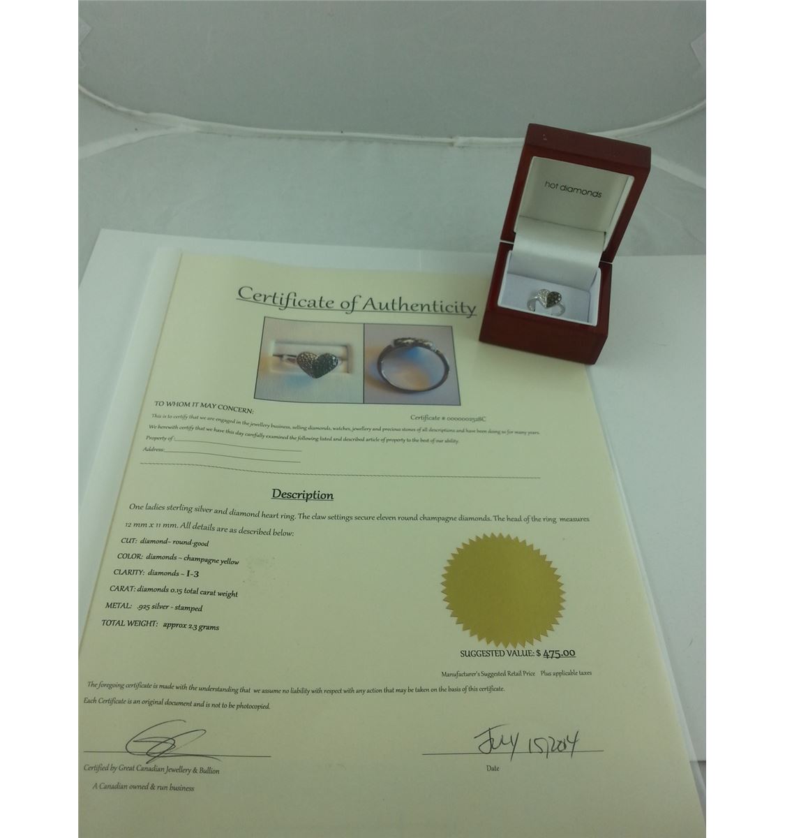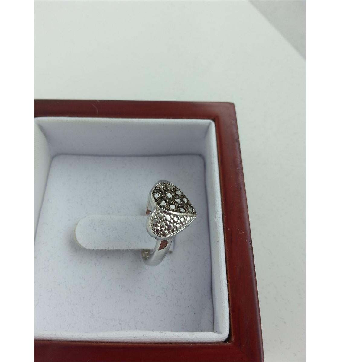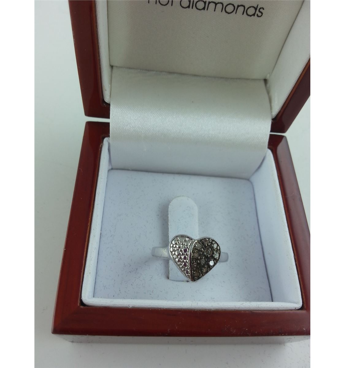 LADIES STERLING SILVER DIAMOND HEART RING. TOTAL OF 11 CHAMPAGNE DIAMONDS. INCLUDES $475 CERTIFICATE