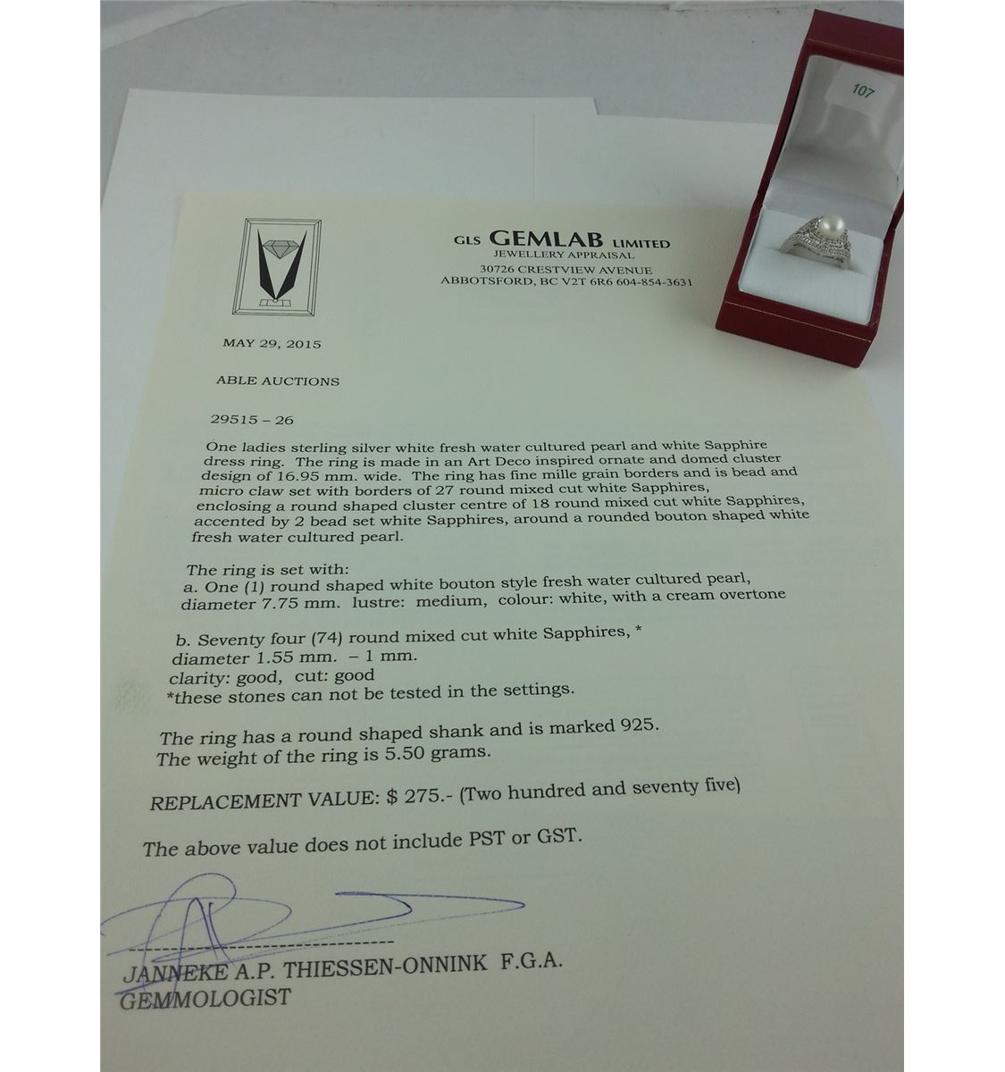 LADIES STERLING SILVER WHITE FRESH WATER CULTURED PEARL AND WHITE SAPPHIRE DRESS RING WITH ONE WHITE BOUTON STYLE FRESH WATER CULTURED PEARL AND 74 WHITE SAPPHIRES (CANT BE TESTED IN SETTING) REPLACEMENT VALUE $275