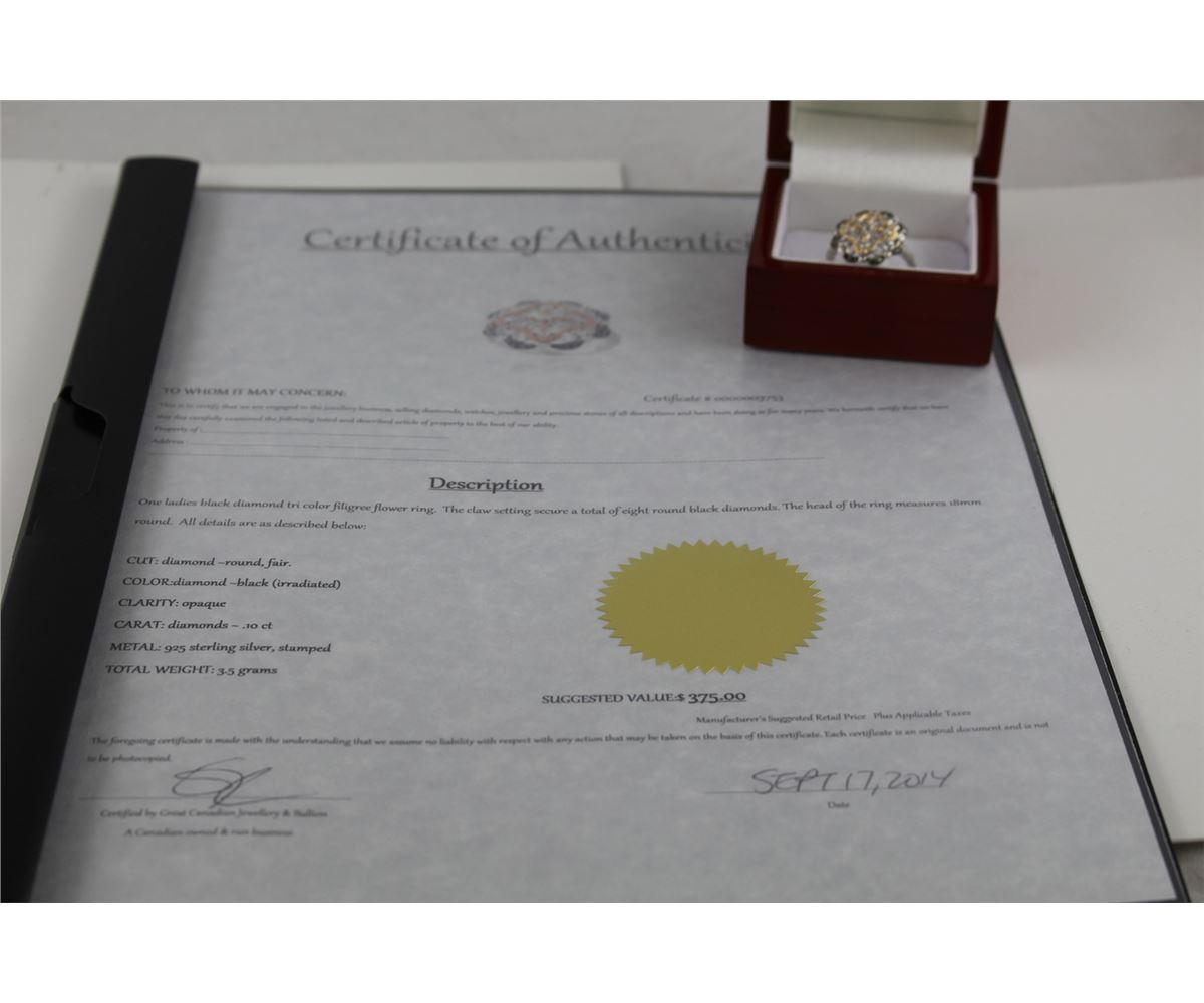 LADIES TRI COLOR FLOWER RING SET WITH 8 BLACK DIAMONDS, 925 SILVER, INCLUDES $375 CERTIFICATE