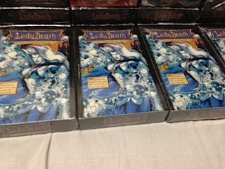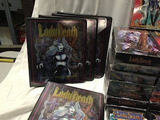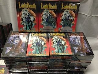 LADY DEATH COLLECTOR CARD BOXES CHROMIUM 23 FACTORY SEALED BOXES, CHROMIUM SERIES II 8 FACTORY SEALED BOXES, CHROMIUM SERIES III 4 FACTORY SEALED BOXES, 6 BINDERS CHROMIUM COLLECTOR CARDS & 2 CHROMIUM II