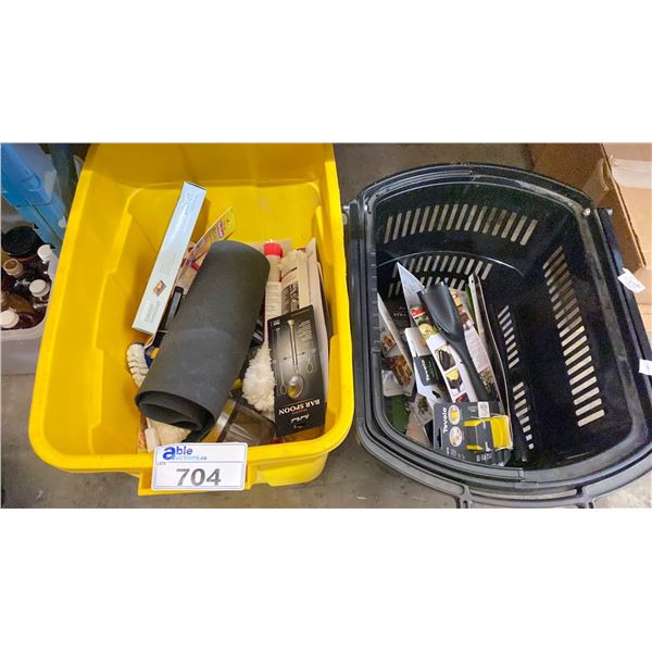 BIN & BASKET OF ASSORTED ITEMS INCLUDING, DUSTERS, SPATULAS, BUTTER SLEEVES, BAKING SHEET LINERS, SCRUB BRUSHES, BAR SPOON, COCKTAIL SHAKER &...