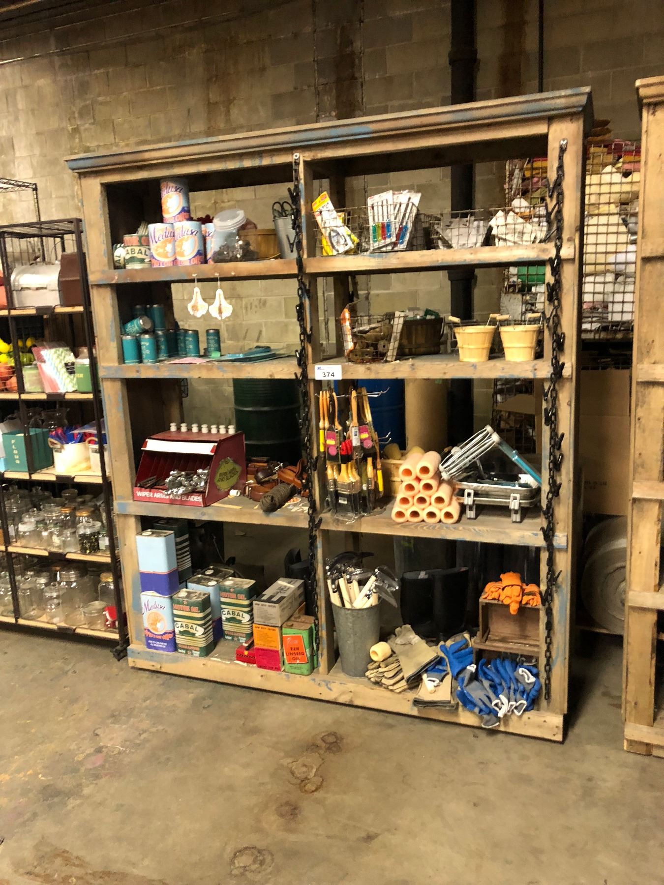 LARGE 4 TIER WOODEN BOOKSHELF WITH ASSORTED GENERAL STORE ITEMS