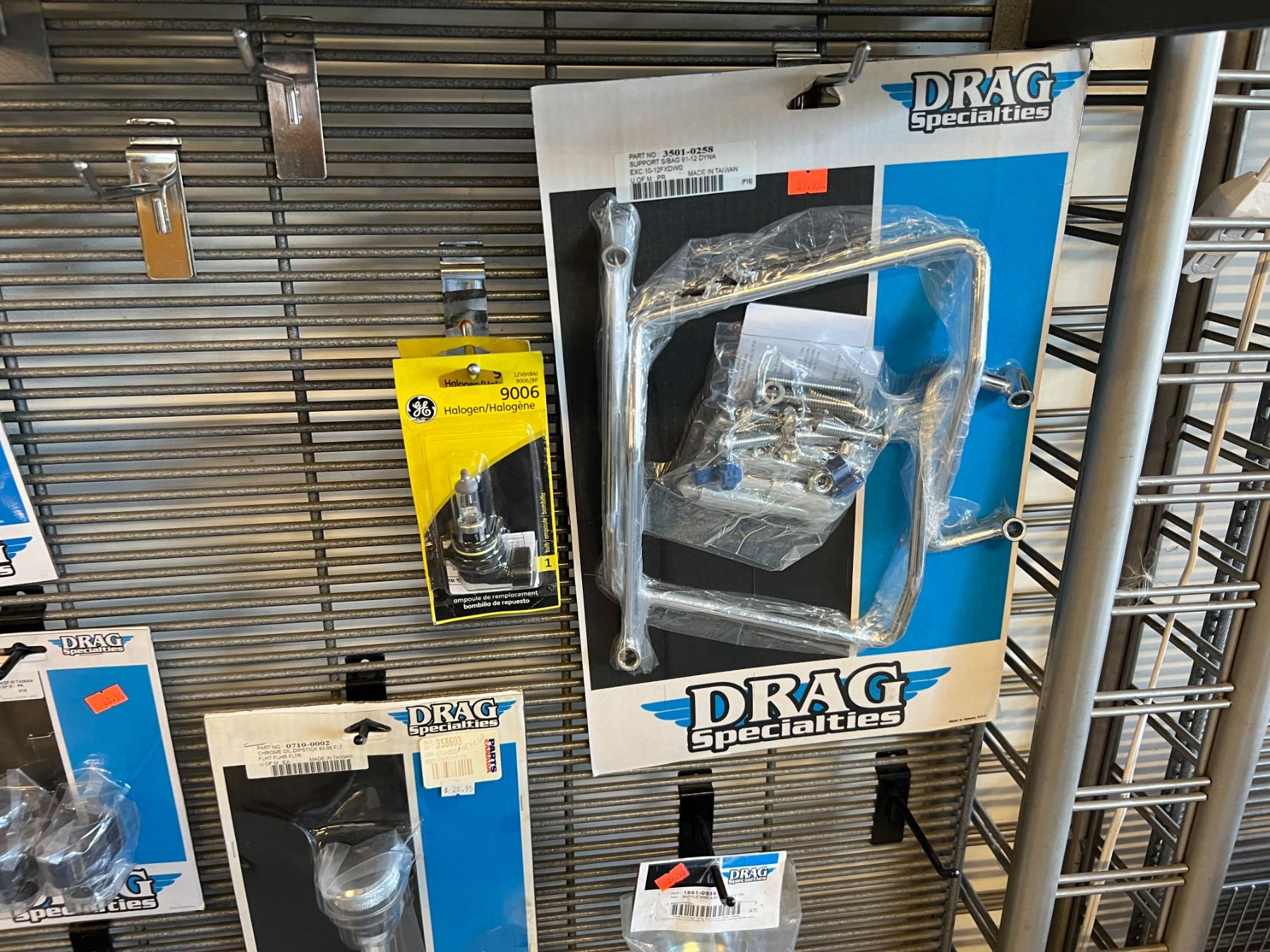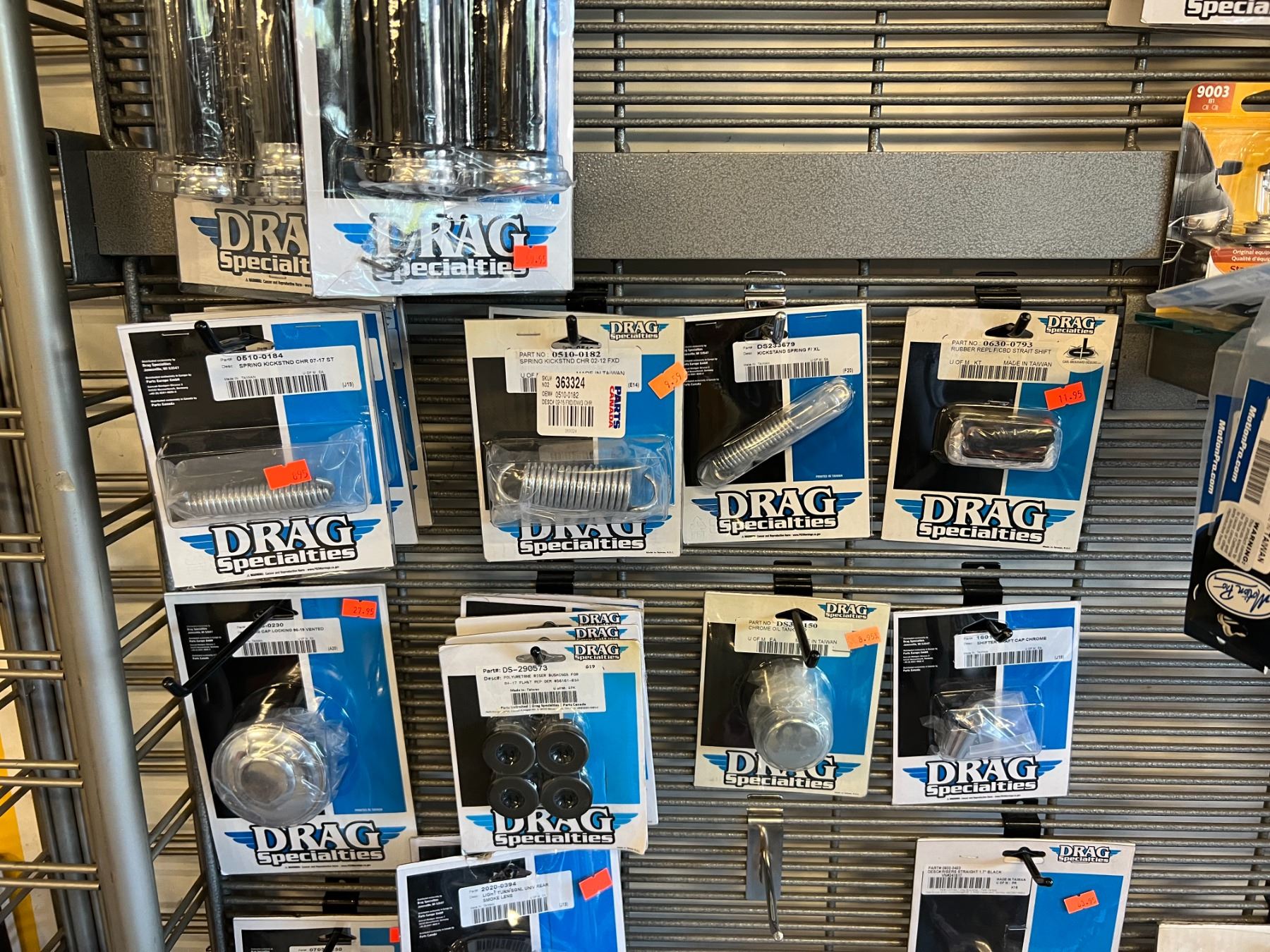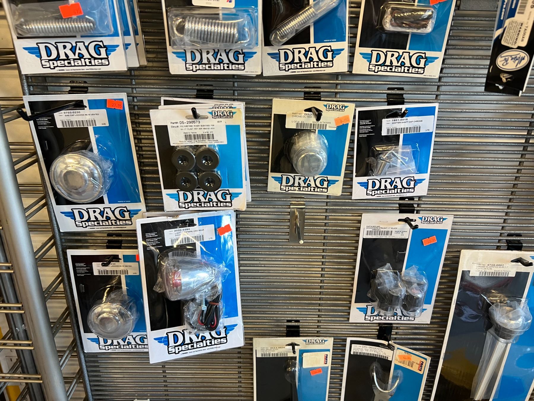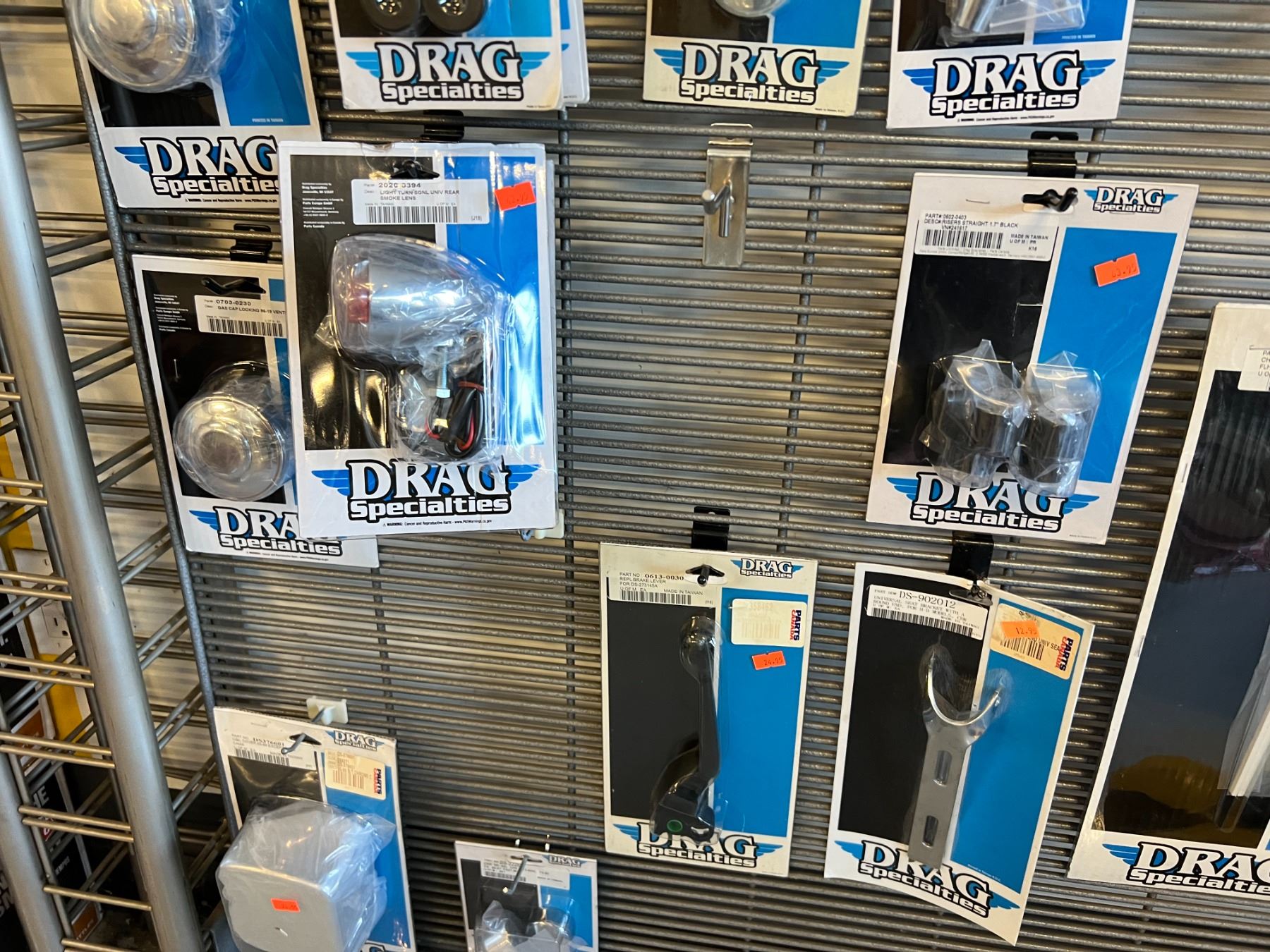 LARGE ASSORTMENT OF DRAG SPECIALTIES HARLEY-DAVIDSON ACCESSORIES (OVER 60 PIECES) RACK NOT INCLUDED