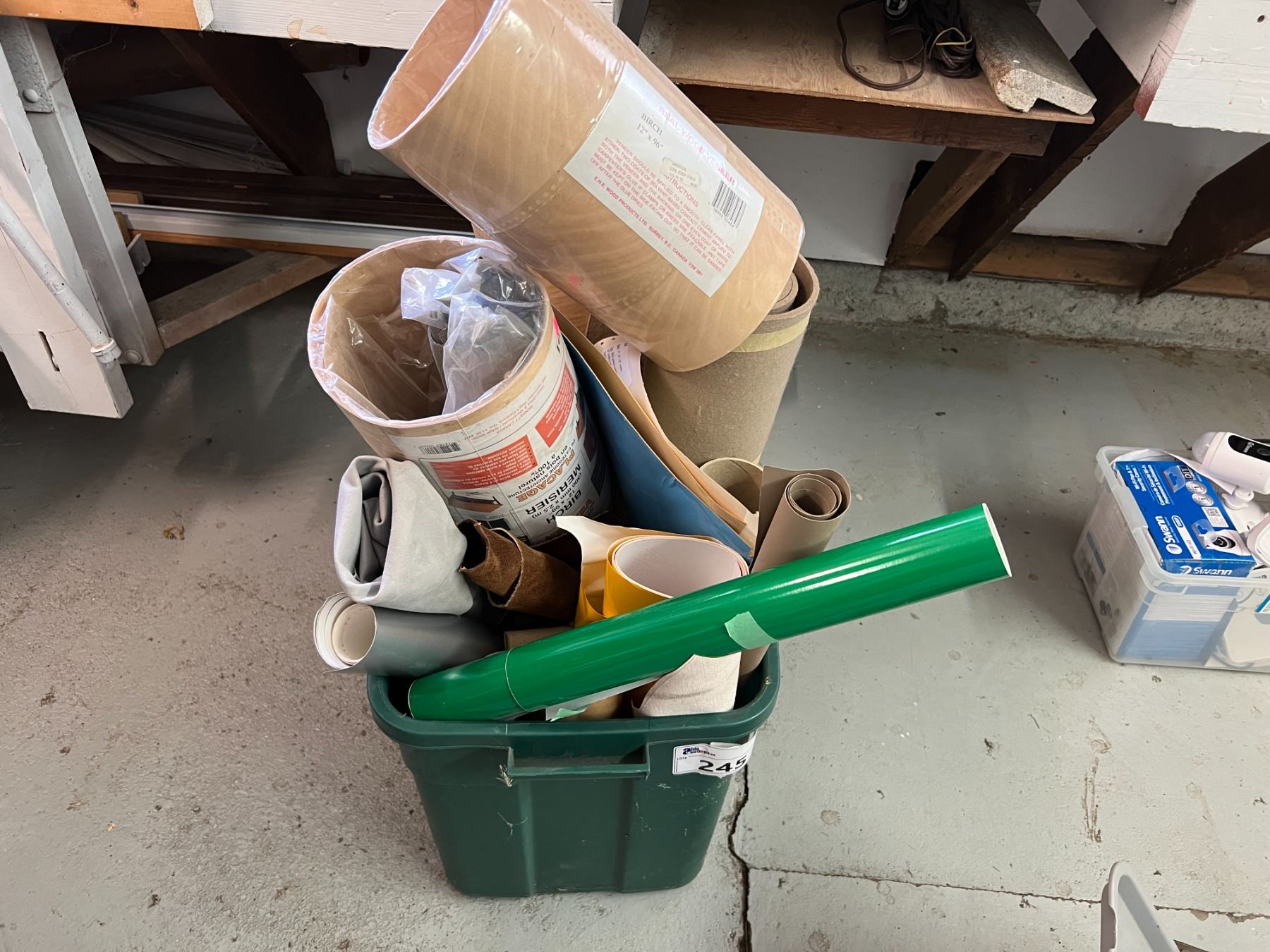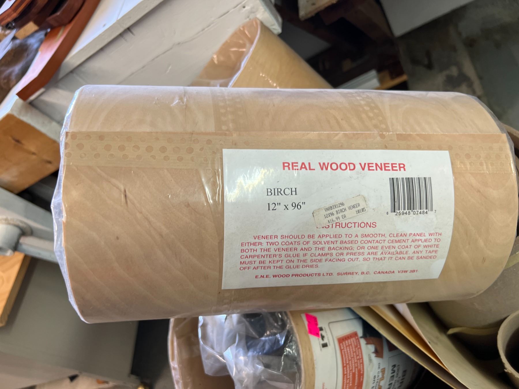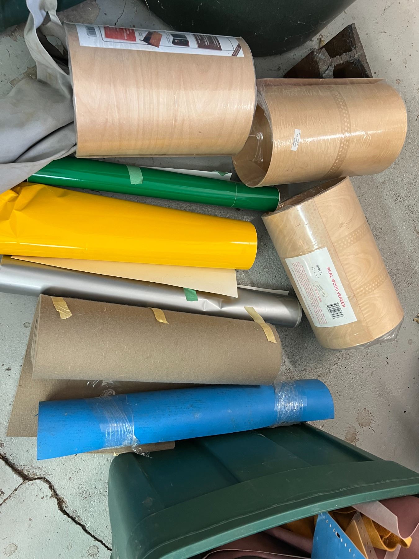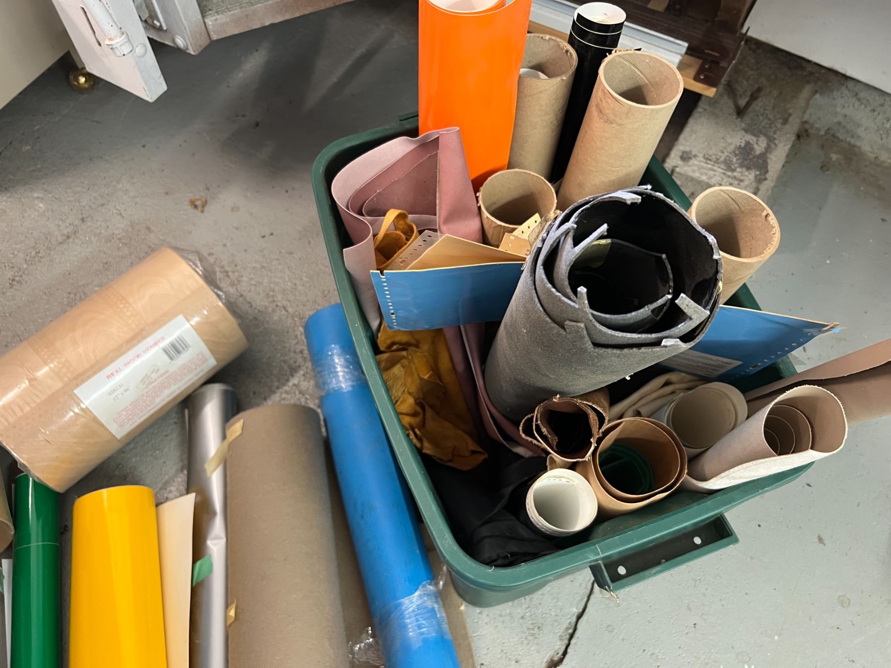 LARGE BIN OF ASSORTED REAL WOOD VENEERS, ROLL OF FELT, ROLL OF SIGN MAKING PLASTICS ETC