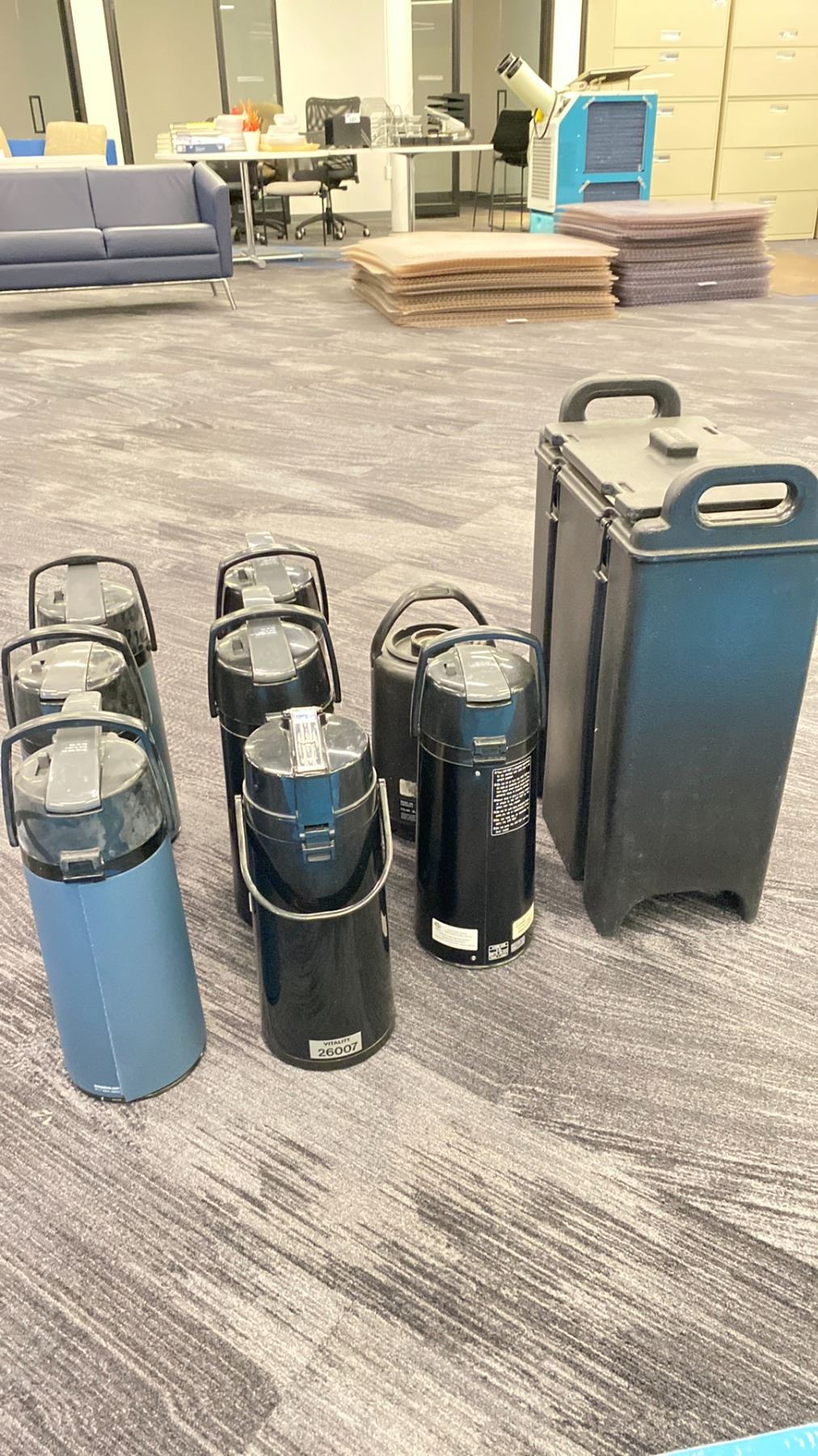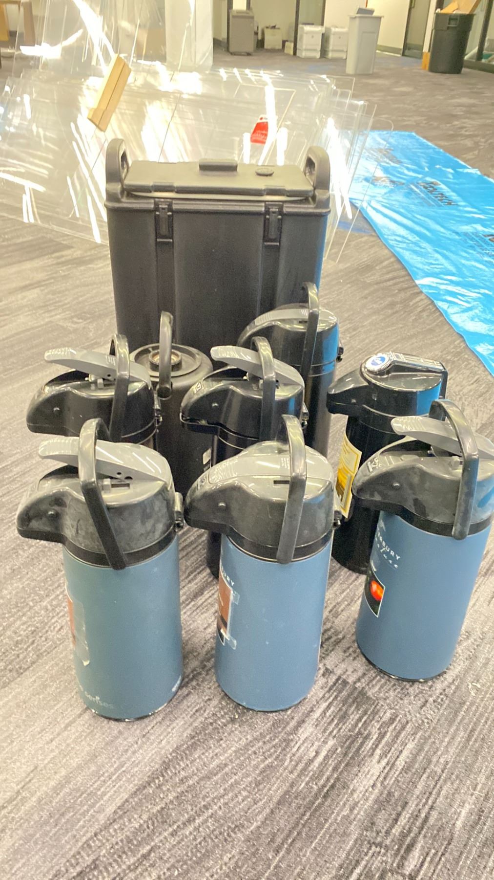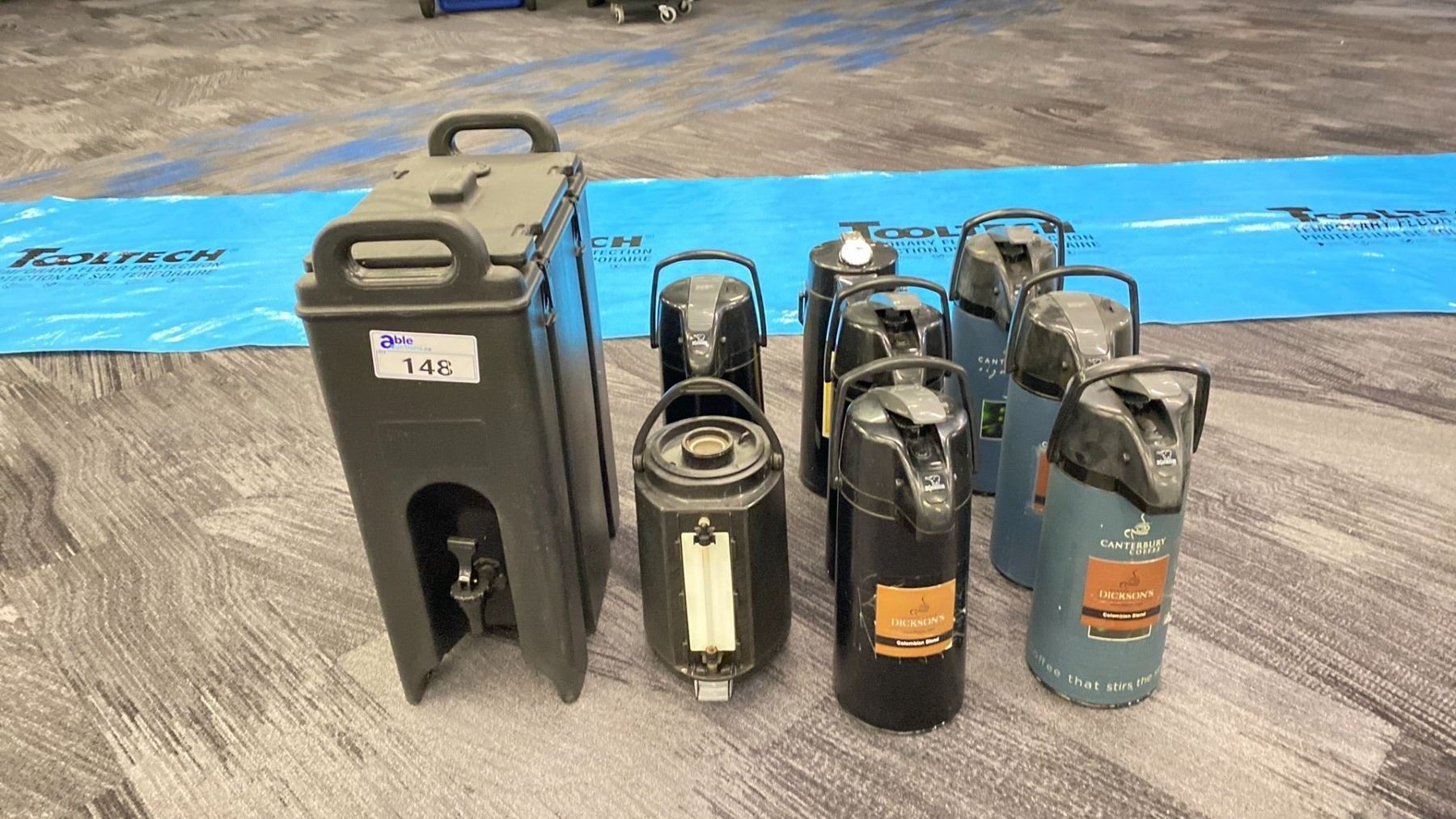 LARGE BLACK BEVERAGE DISPENSER AND 8 TOP PUMP COFFEE CARAFES'