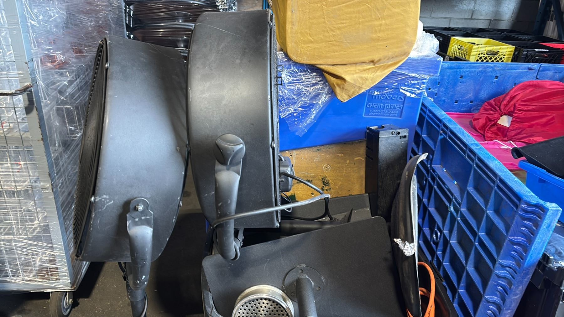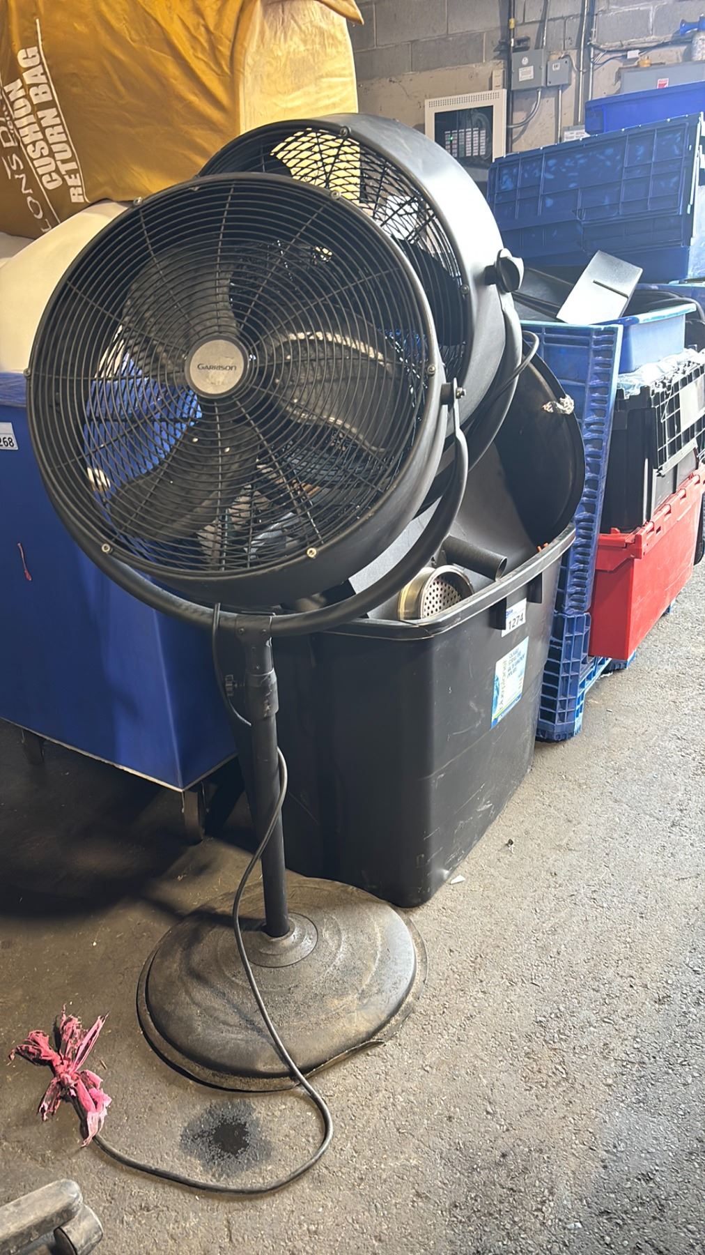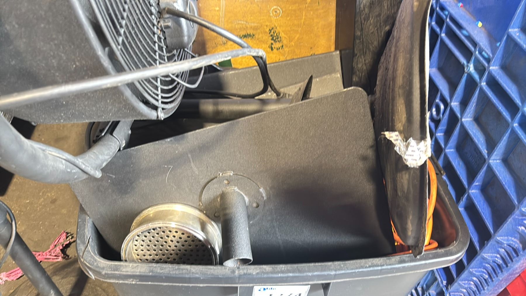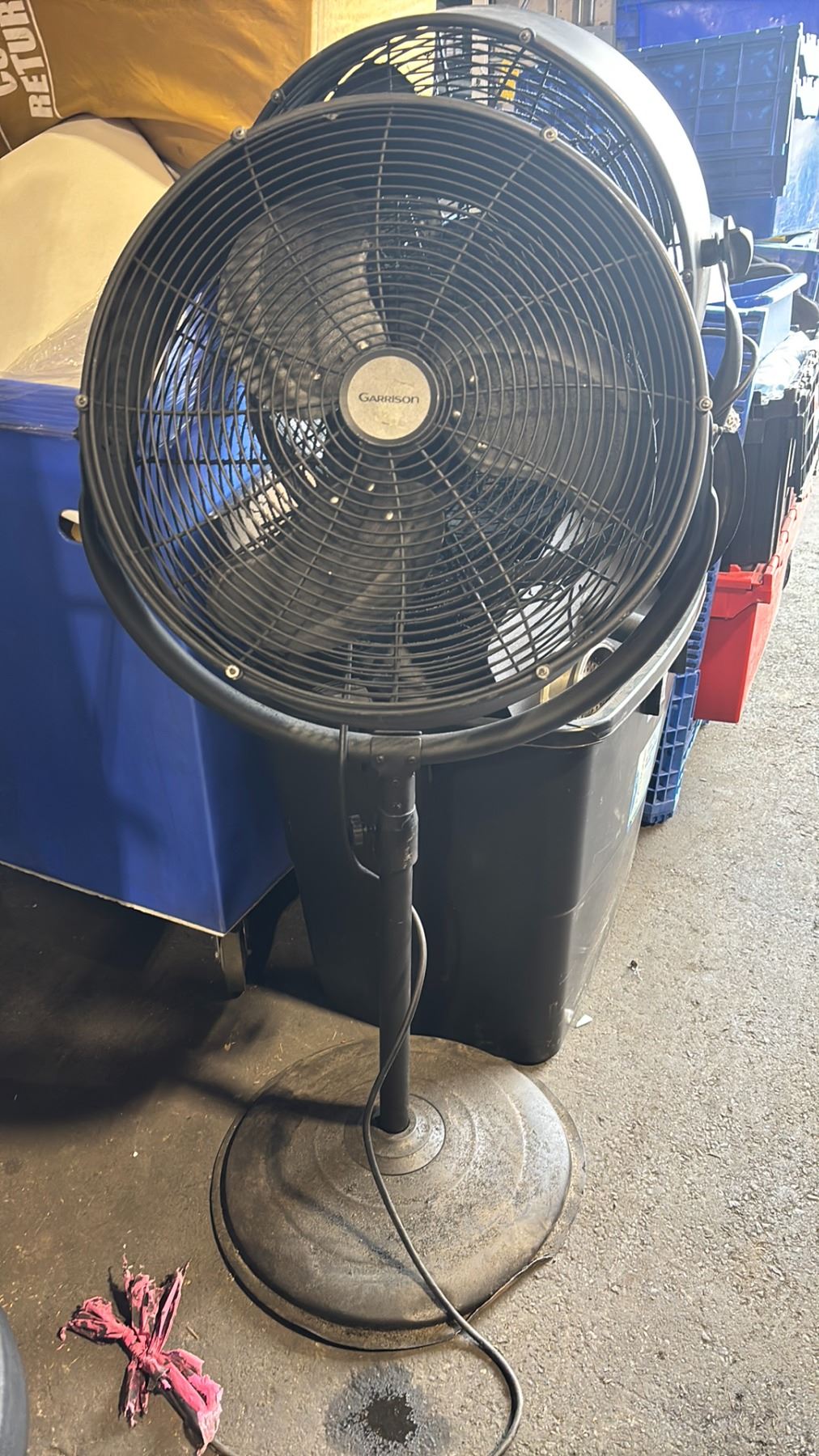 LARGE BLACK BIN OF GARRISON FANS, FAN PARTS & HEAVY DUTY EXTENSION CORDS *BIN INCLUDED*
