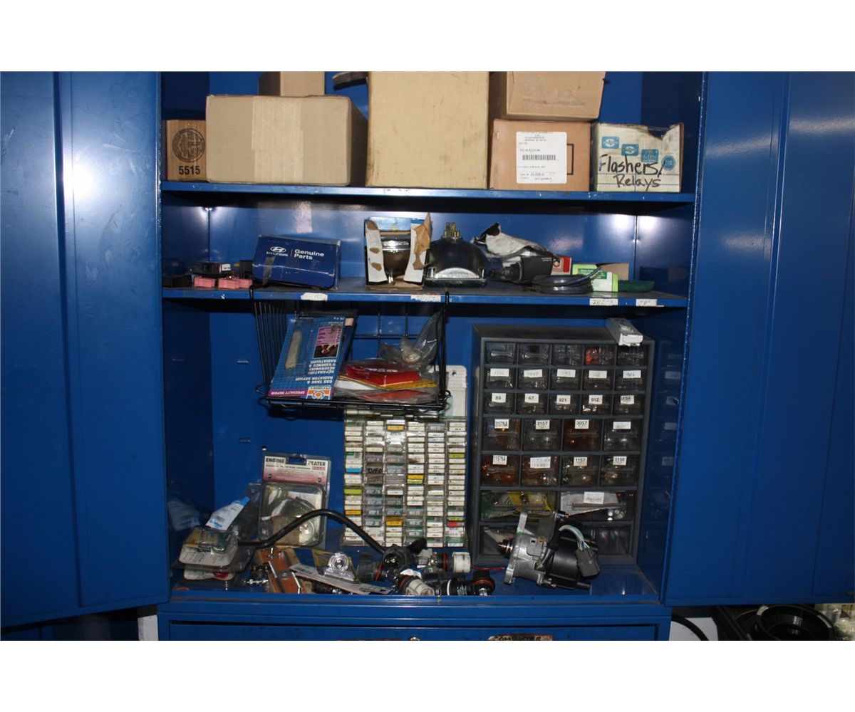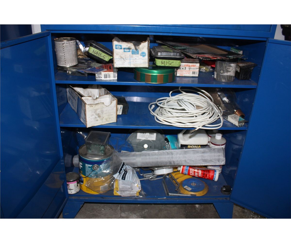 LARGE BLUE 4 DOOR 1 DRAWER PARTS CABINET WITH CONTENTS