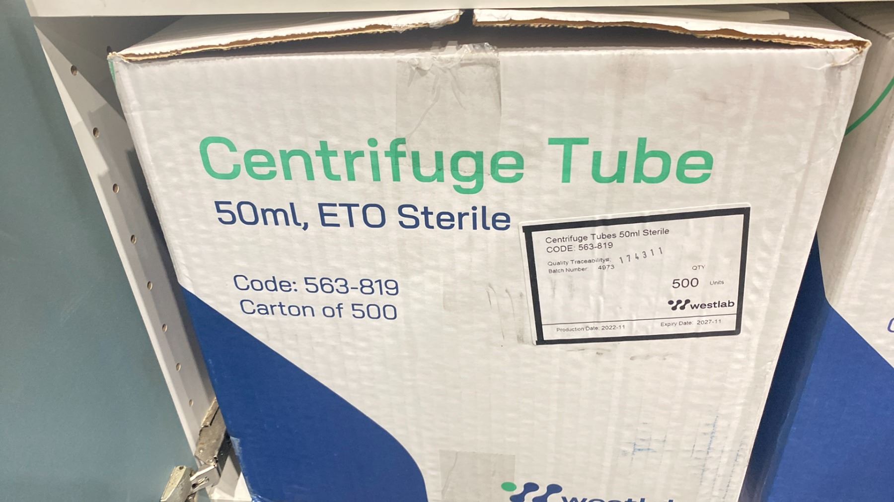 LARGE BOX OF 17 X 100MM TEST TUBES, 2 BOXES OF 50 ML CENTRIFUGE TUBES & A BAG OF STOPPER CAPS FOR 17 MM TUBES