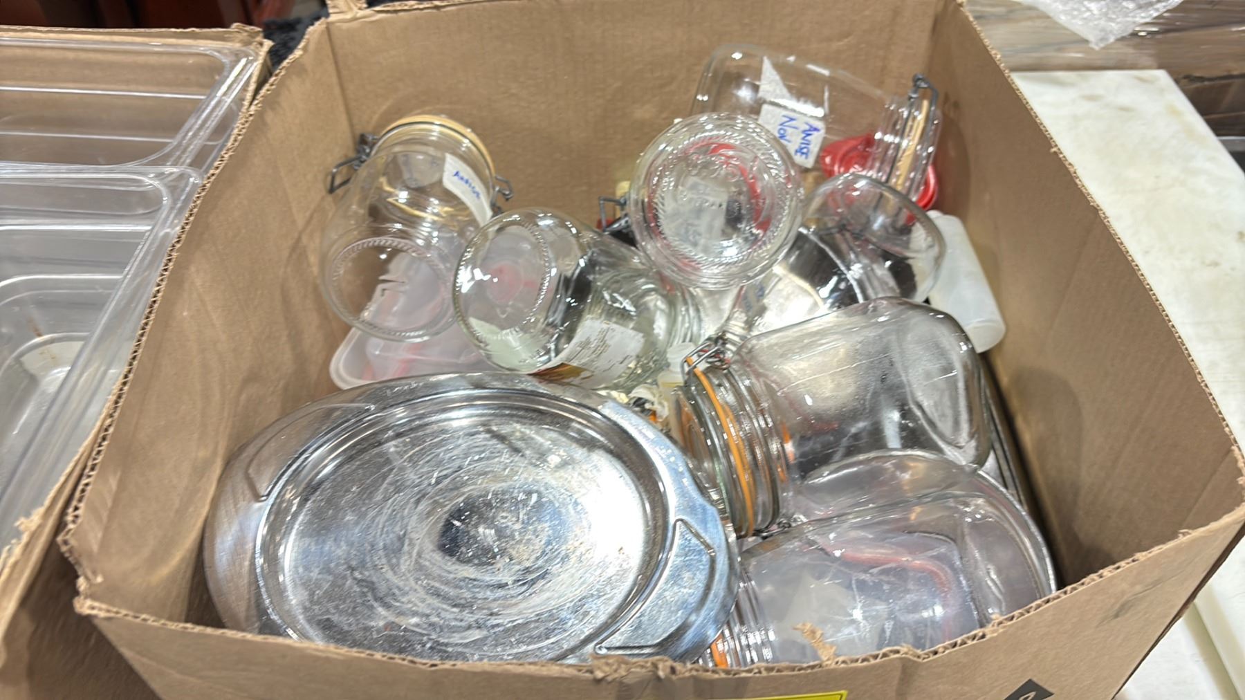 LARGE BOX OF ASSORTED COMMERCIAL RESTAURANT ITEMS INCLUDING JARS, UTENSILS & METAL TRAYS