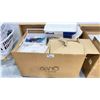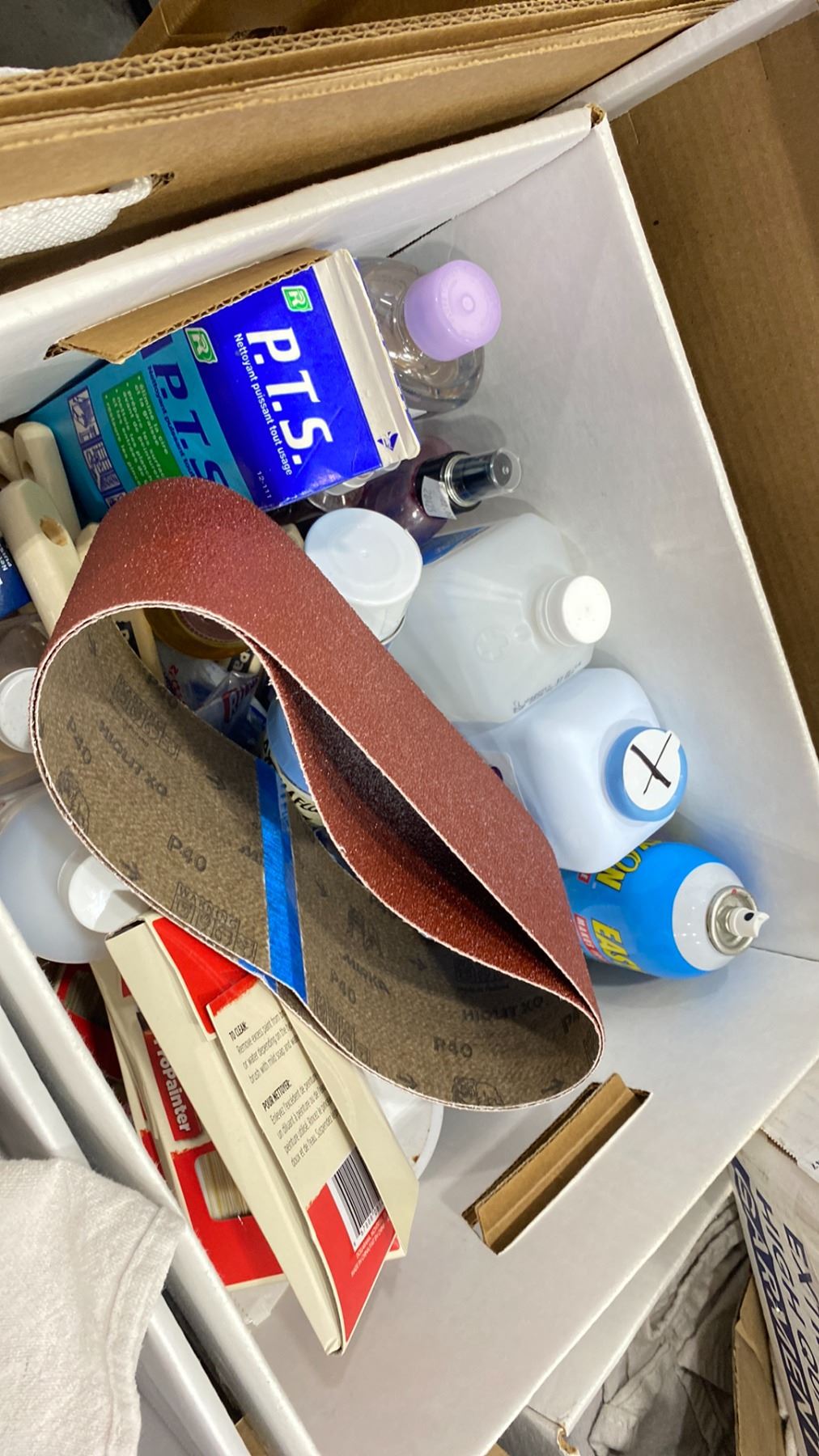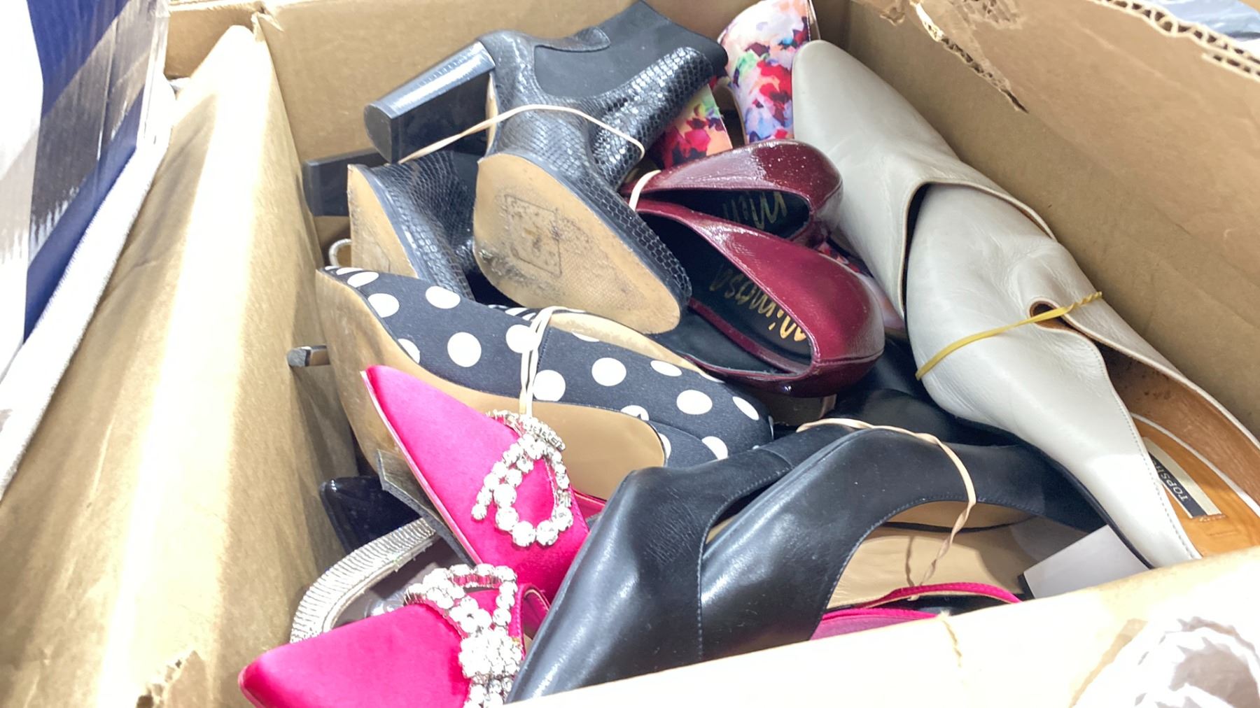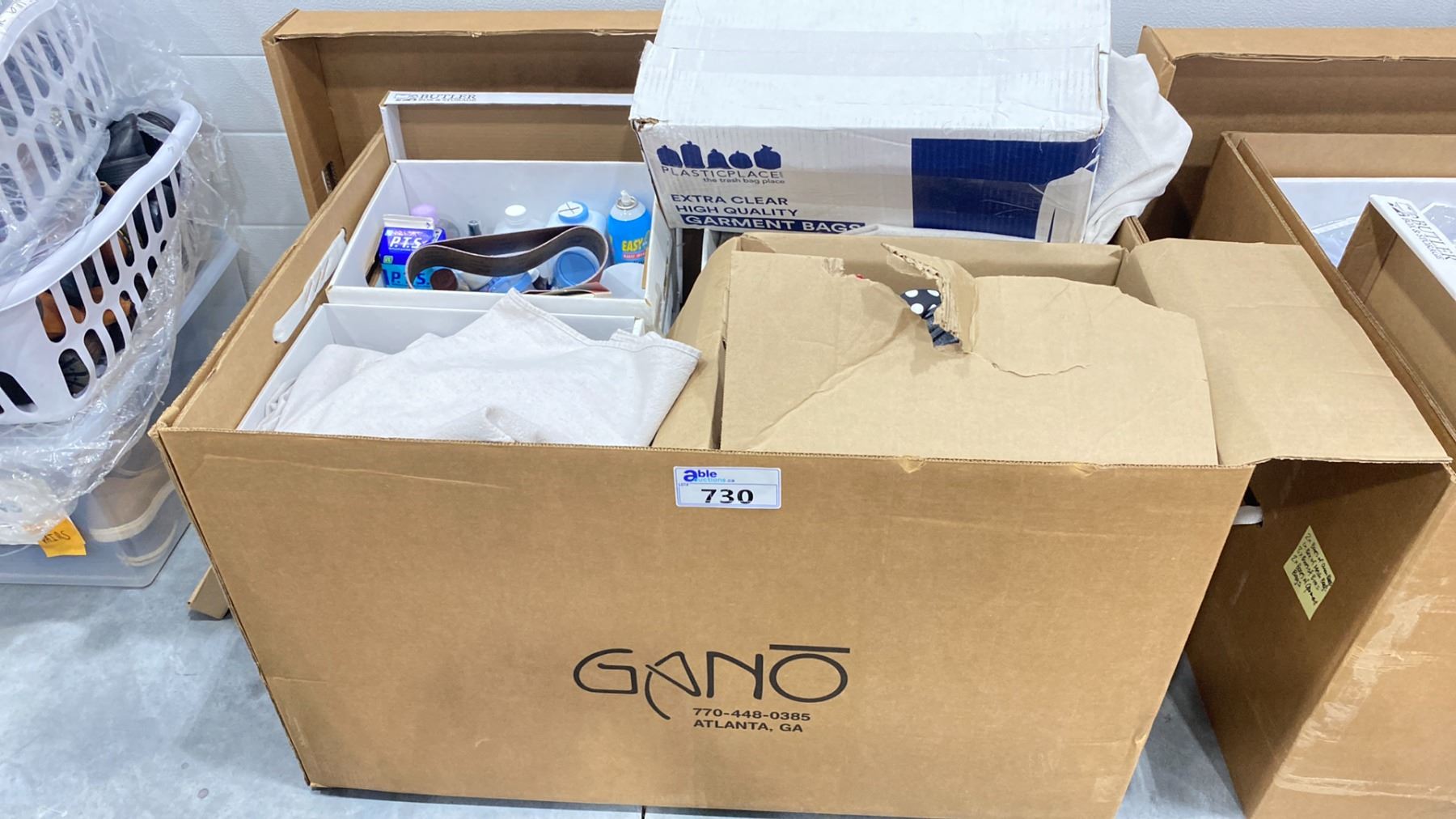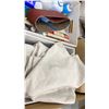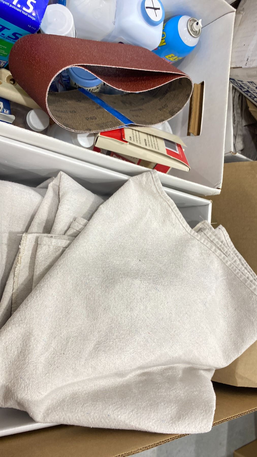 LARGE BOX OF ASSORTED SHOES, PROP SUPPLIES, GARBAGE BAGS & MORE