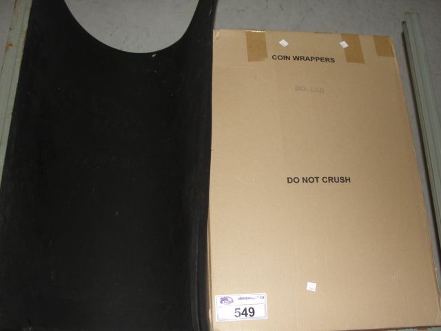 LARGE BOX OF COIN WRAPPERS IN DOLLAR DENOMINATION AND 2 BLACK RUBBER MATS