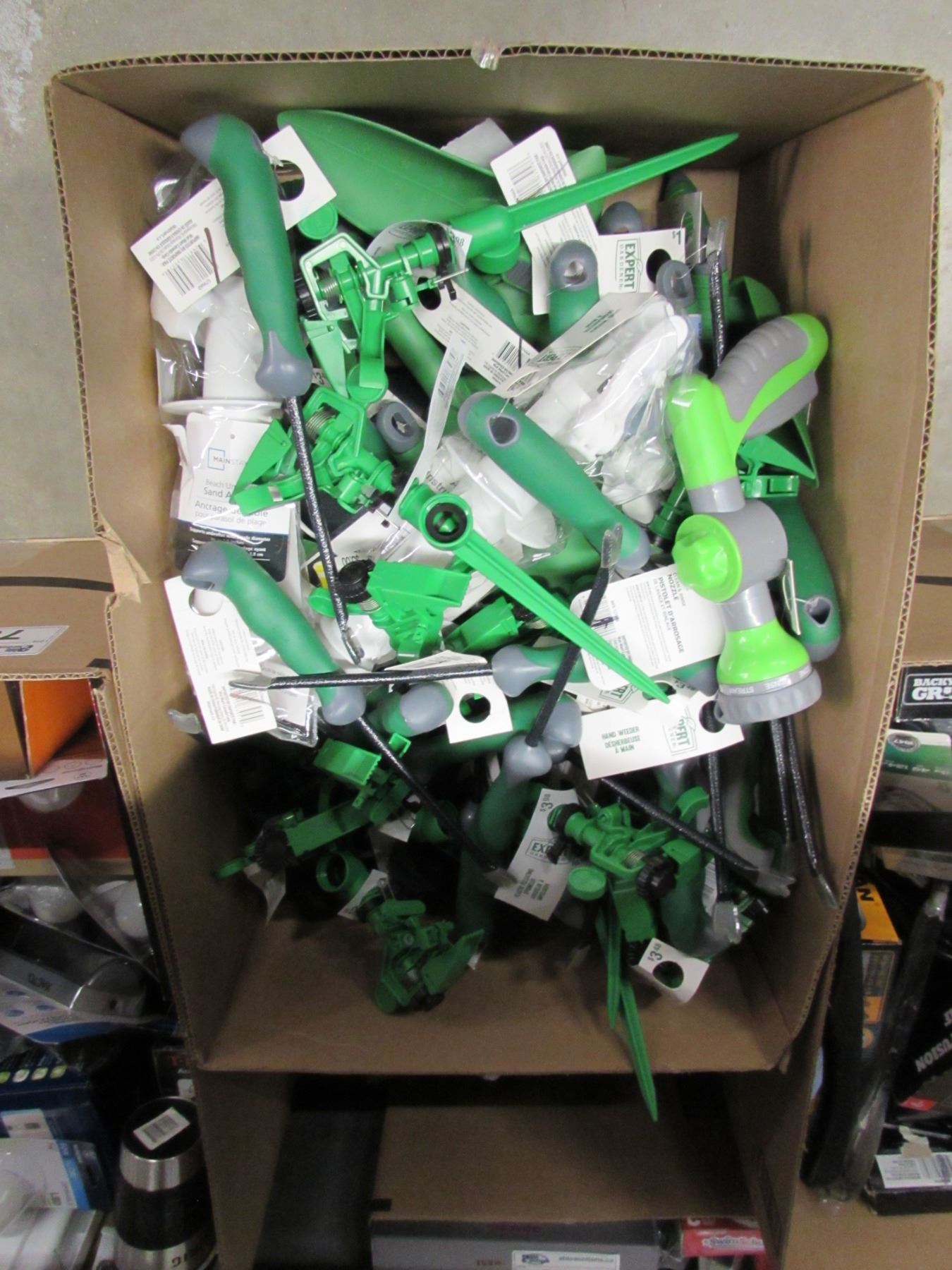LARGE BOX OF PULSATING SPRINKLERS & HAND WEEDER, GARDEN TOOLS, ETC